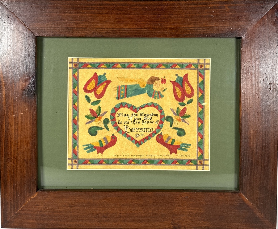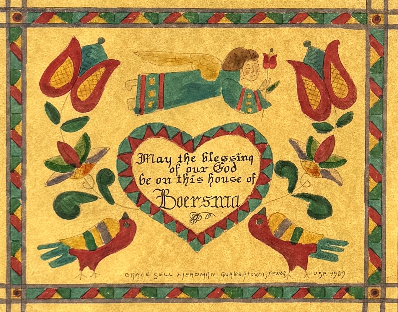 Kleurrijke aquarel door Grace Sell Headman 1989. Papier, gemengde techniek met aquarel, gouache en pen. Voorstelling van huiszegen met hartcartouche en tekst ‘May the blessing of our God be on this house of Boersma’, omgeven door engel, tulpen en vogels, decoratieve rand. Onderin gesigneerd en gedateerd, locatie Quakertown, Pennsylvania.