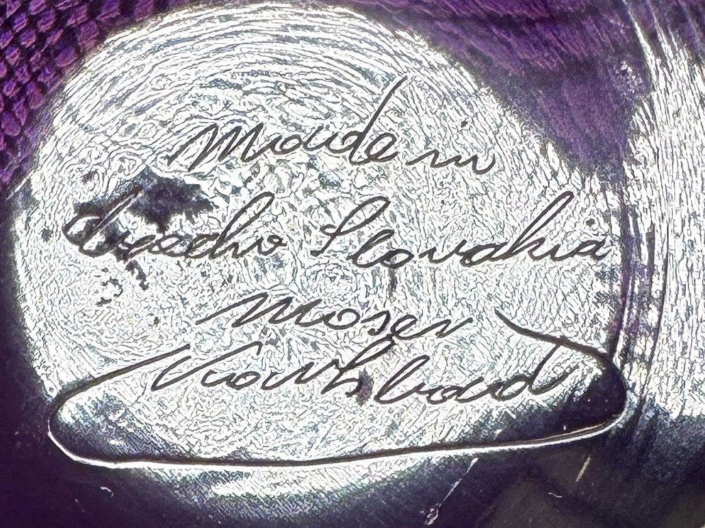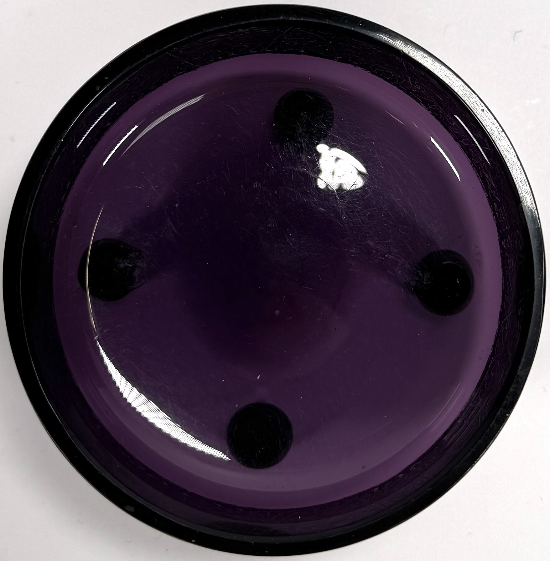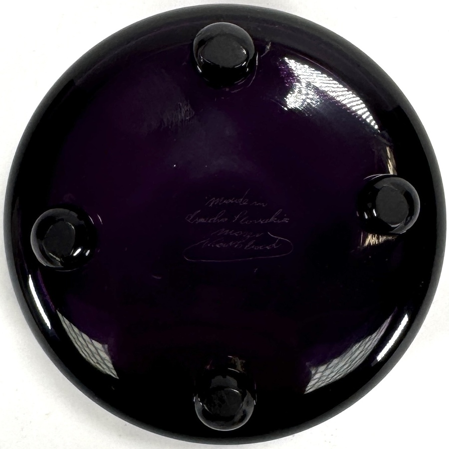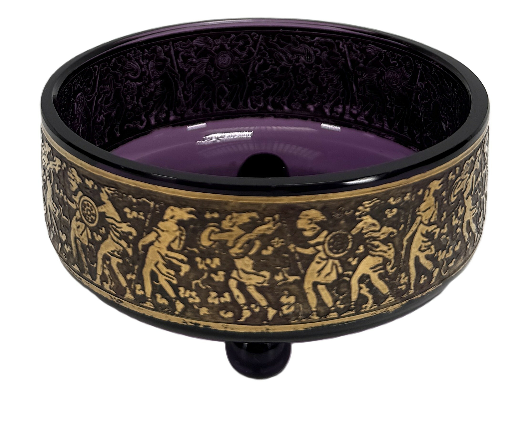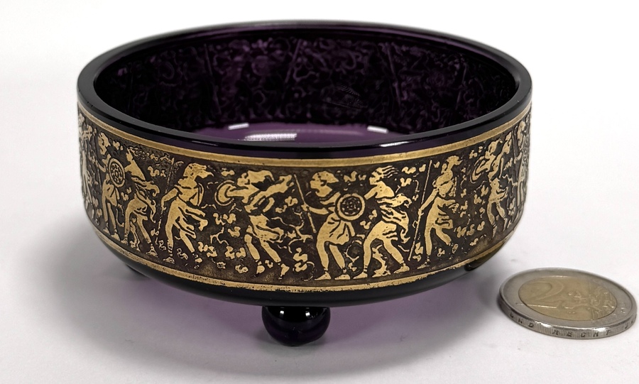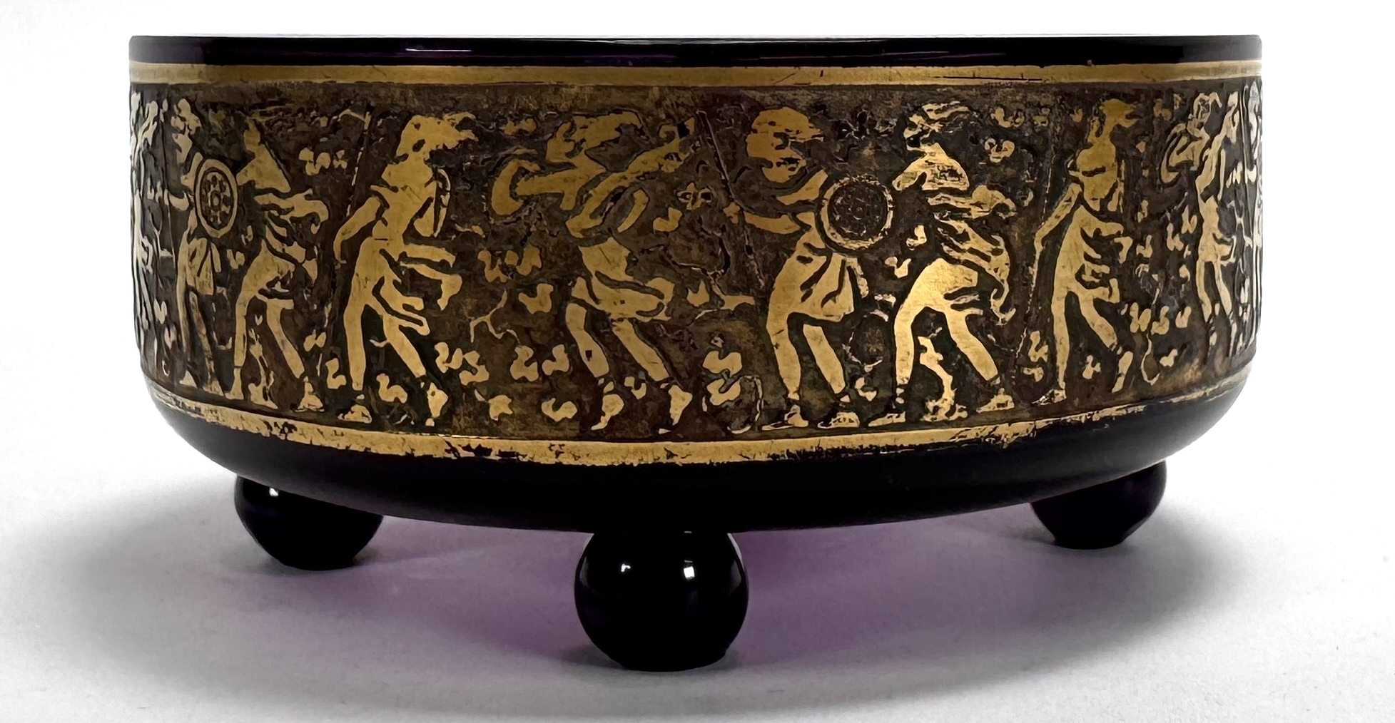 Art Deco schaal door Leo Moser (1879–1970), uitgevoerd in amethistkleurig glas met verguld decoratie fries, vervaardigd in Karlsbad, Tsjecho-Slowakije omstreeks 1920–1930. De schaal rust op drie glazen bolvormige poten en toont dansende en musicerende figuren in reliëf en goud. Onderzijde gegraveerd met inscriptie "Made in Czecho Slovakia Moser Carlsbad". Geïnteresseerd? Bezoek onze kijkdagen op 29, 30 of 31 augustus van 11:00 tot 17:00 uur! |