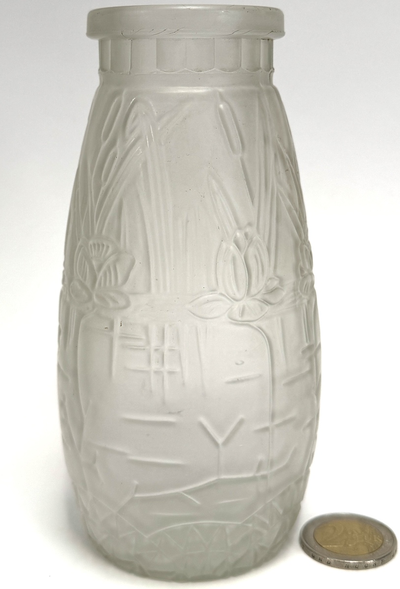 Art Deco vaas uit de eerste helft 20e eeuw, uitgevoerd in geperst en mat gesatineerd glas. Het model is peervormig met brede rand en toont in reliëf waterlelies en rietstengels, gecombineerd met geometrische patronen aan boven- en onderzijde. Klaar om te bieden? Registreer je nu en doe mee aan de veiling! |