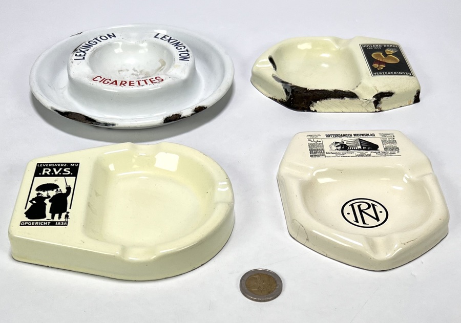 Vier reclame asbakken, midden 20e eeuw, vervaardigd in emaille op metaal, deels gemerkt aan de onderzijde Medicado Amsterdam C.. Uitgevoerd in functionele modernistische stijl met opdrukken van diverse merken en instellingen, waaronder “Lexington Cigarettes”, “Holland-Dordt Verzekeringen”, “R.V.S. Levensverzekeringen” en “Rotterdamse Nieuwe” sigarenfabriek. Wil je direct deelnemen? Plaats vanaf 22 augustus alvast een schriftelijk bod via onze website! |