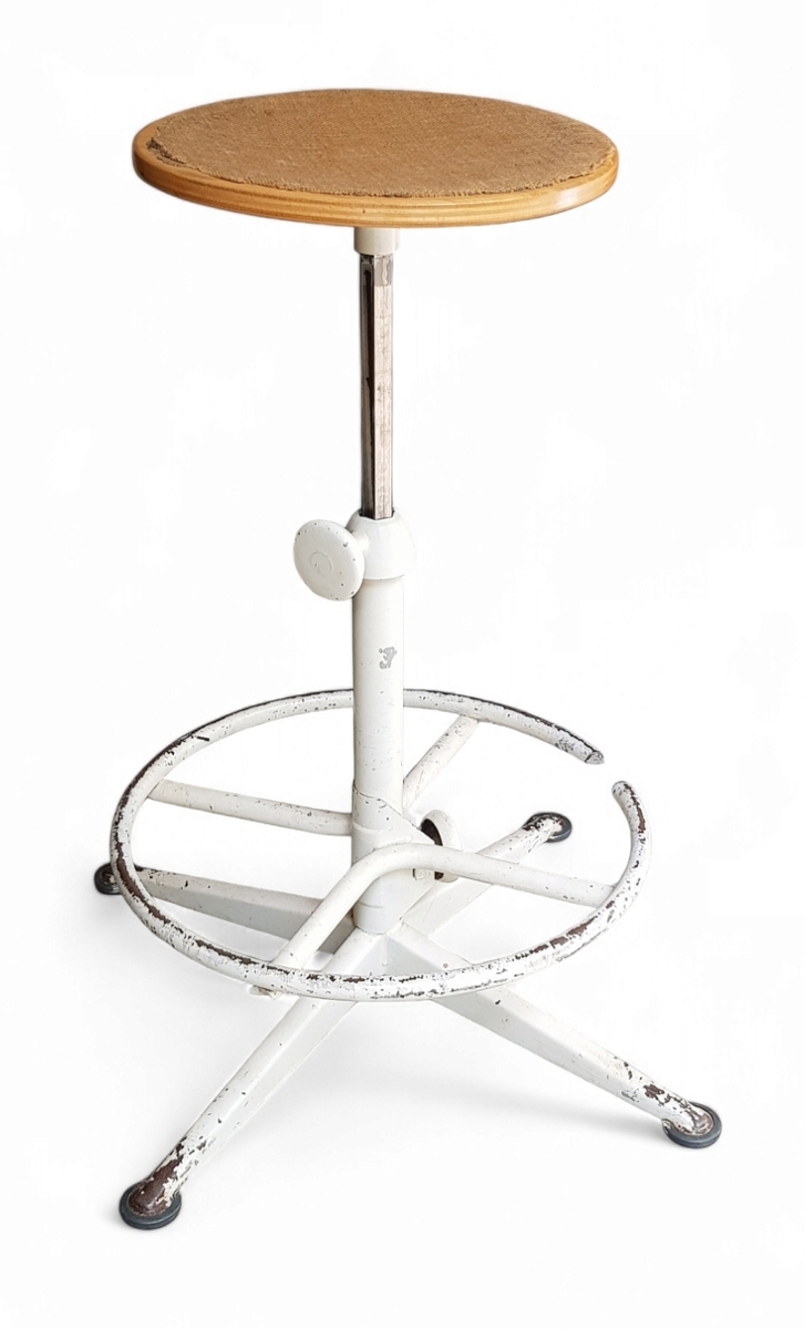 Atelier kruk uit de periode circa 1930-1960, uitgevoerd in een functionalistische en industriële stijl. De zitting is gemaakt van hout, het frame is van metaal en is in een witte kleur geverfd. De hoogte van de kruk is verstelbaar met een draaiknop. Kom kijken op 29, 30 of 31 augustus (11:00-17:00 uur) en ervaar het zelf! |