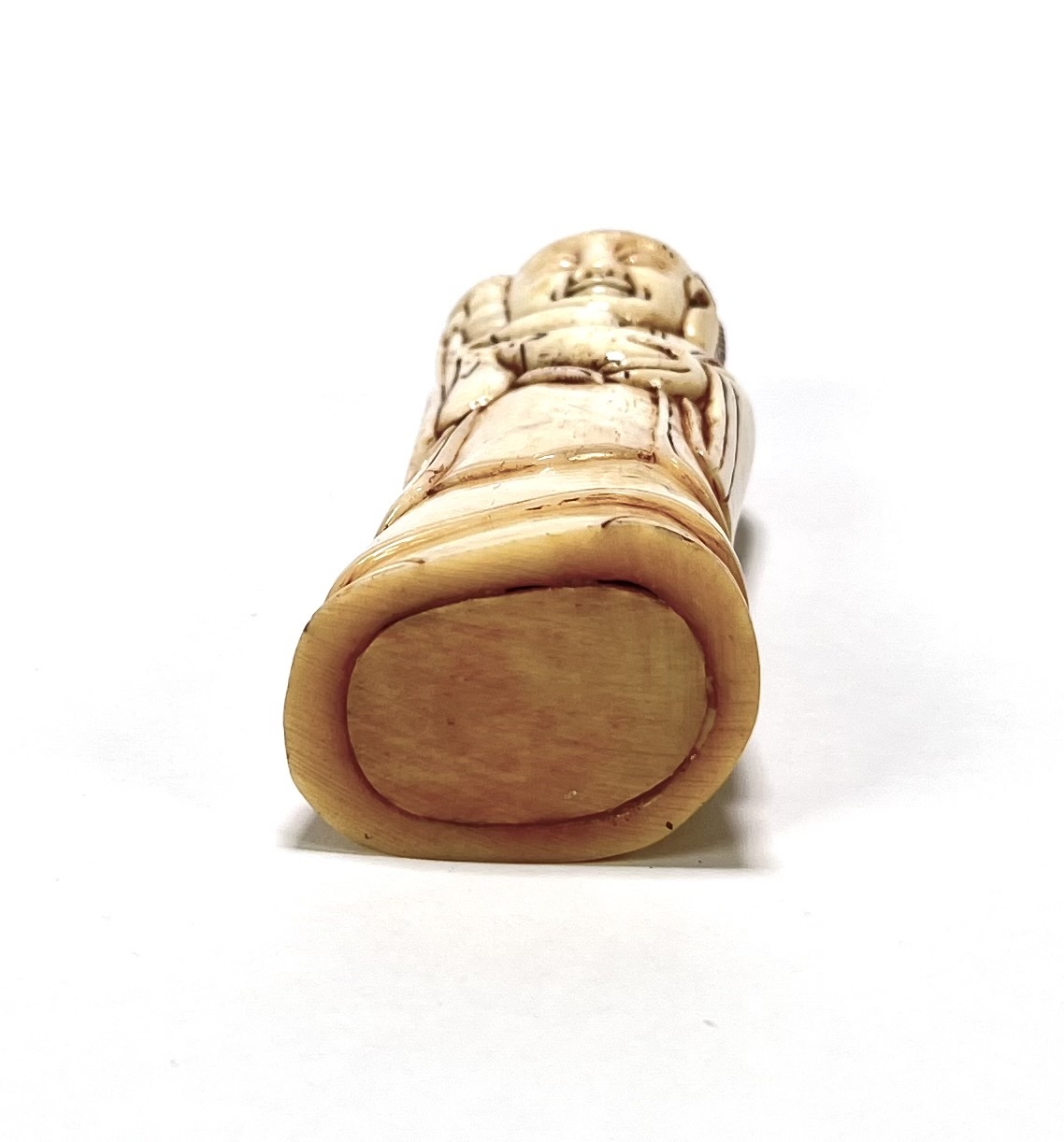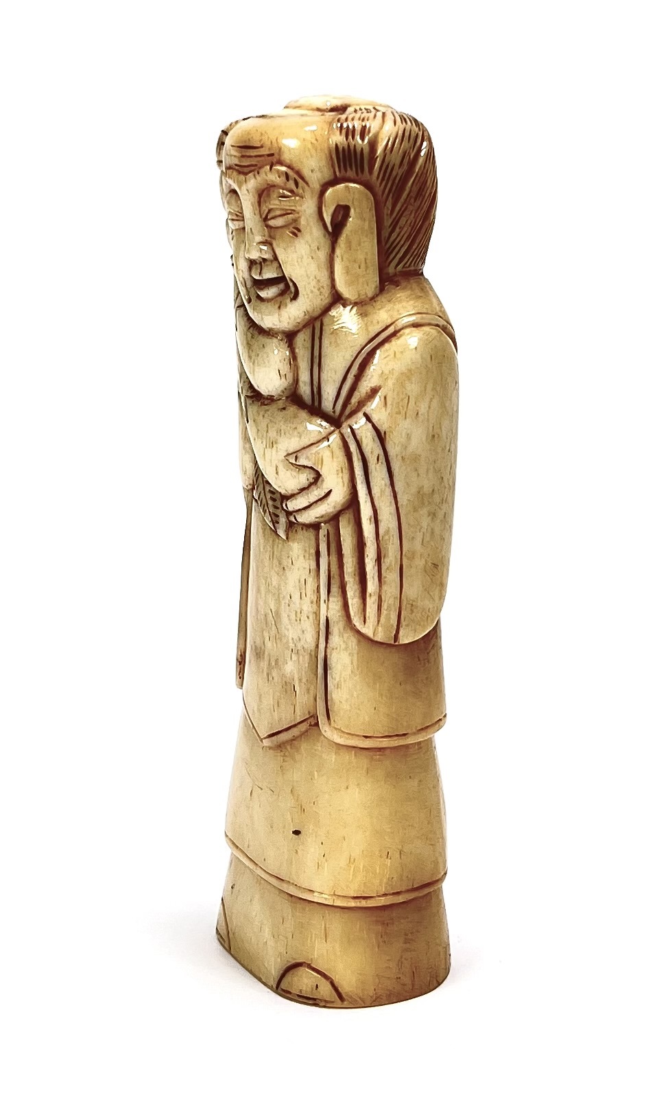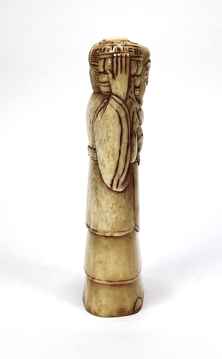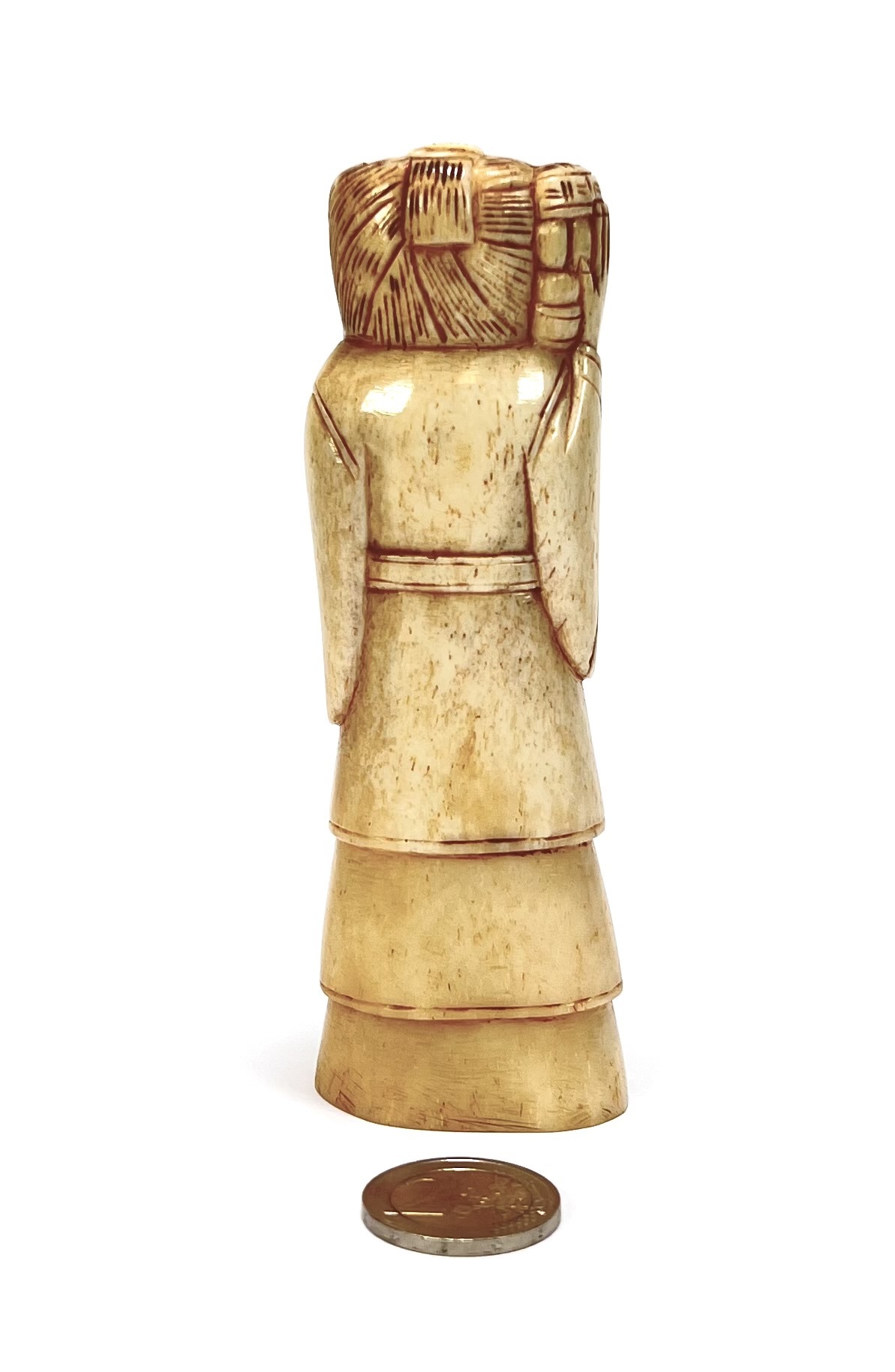 Japans beeldje in okimono-stijl, late 19e eeuw, uitgevoerd in gesneden been met gepatineerde en ingekraste details. Voorstellend een staande figuur in traditioneel gewaad met mand op het hoofd en vis in de armen. Toont op de achterzijde een gedetailleerde weergave van de haardos en kledingplooien, waarbij de handmatige snijtechniek duidelijk zichtbaar is. Registreer nu en bied eenvoudig online mee op dit beeldje! |