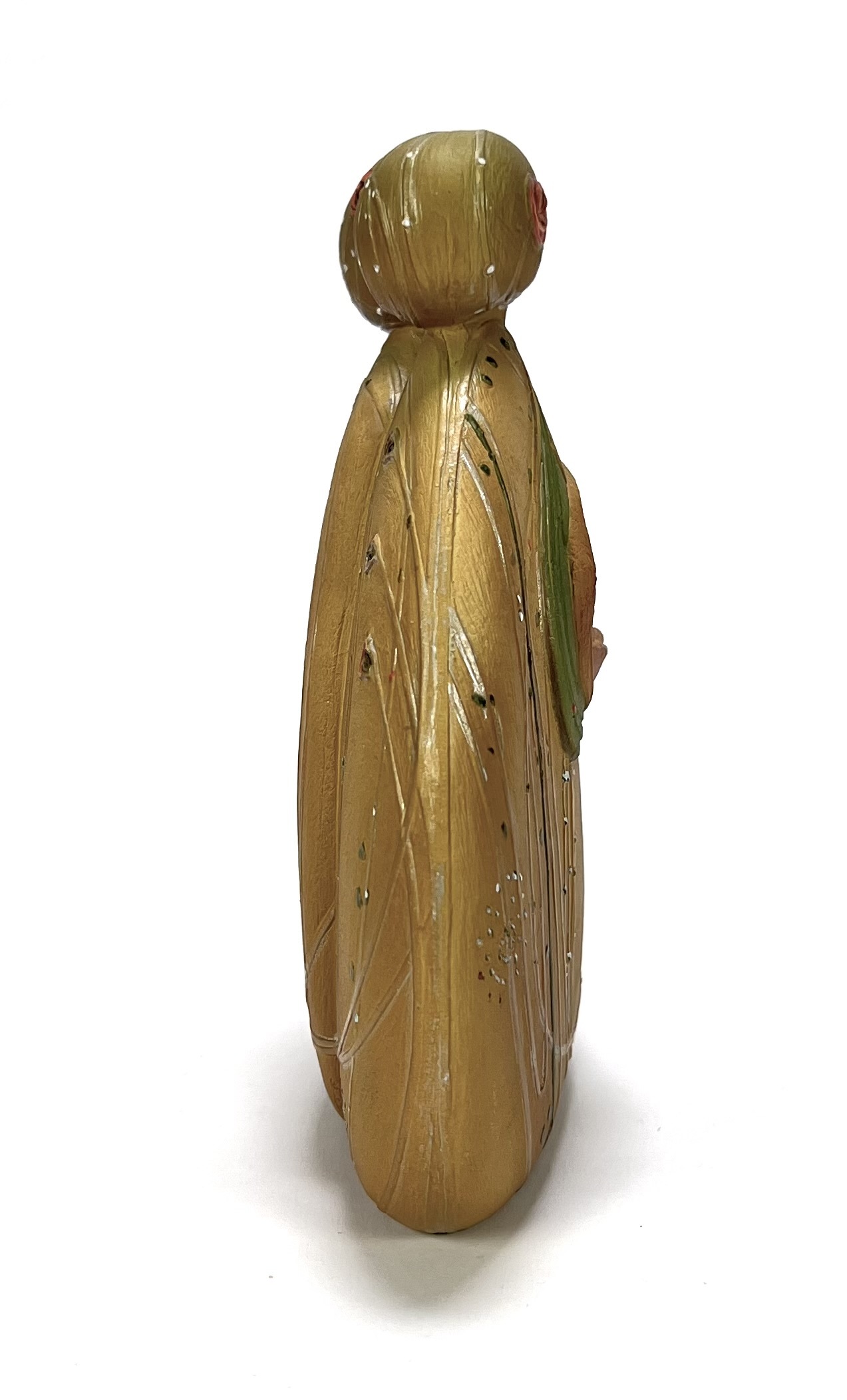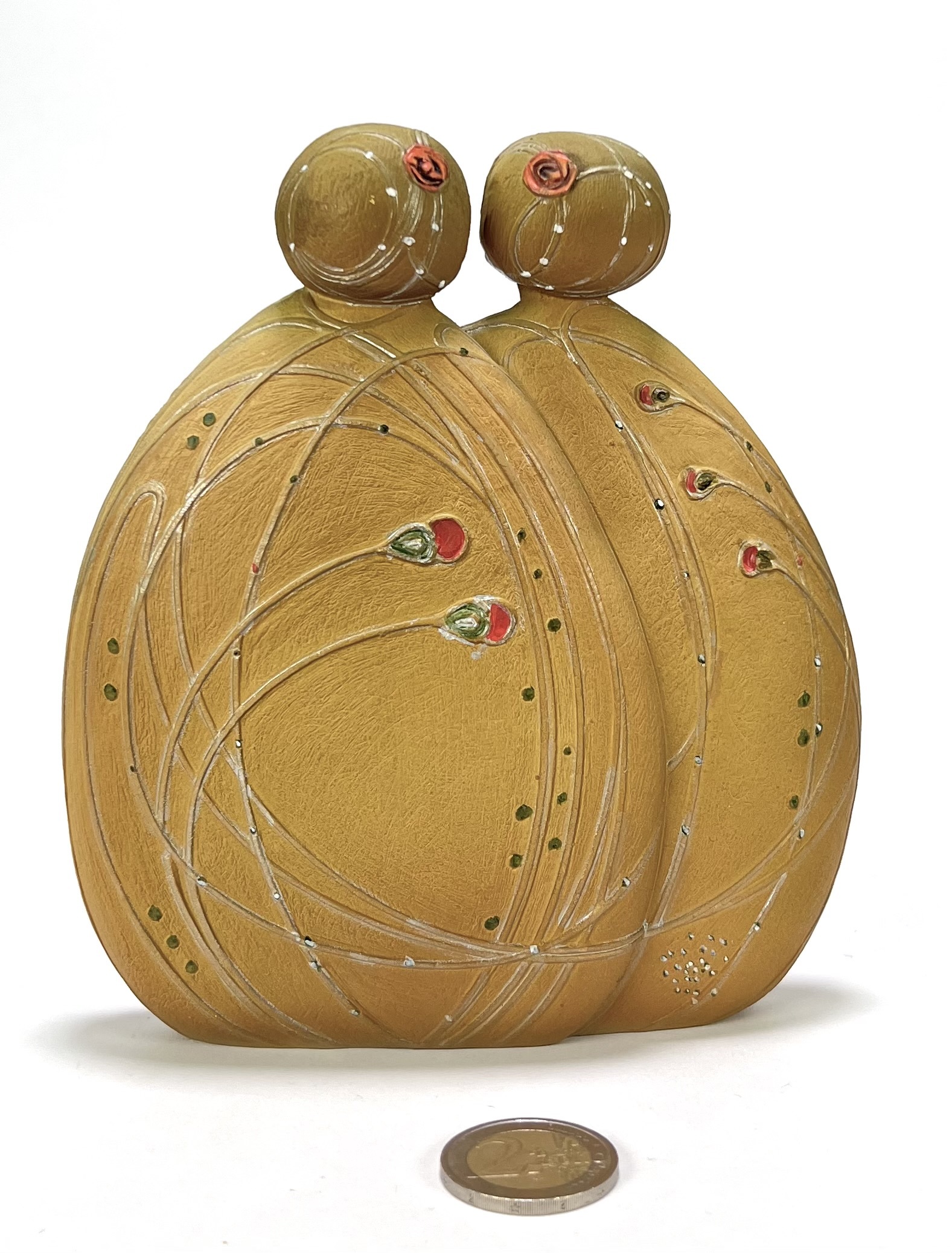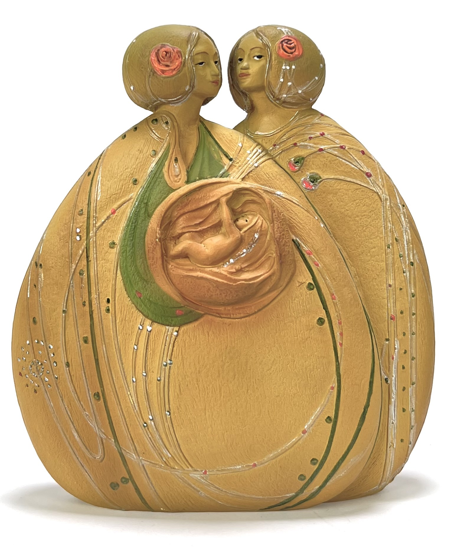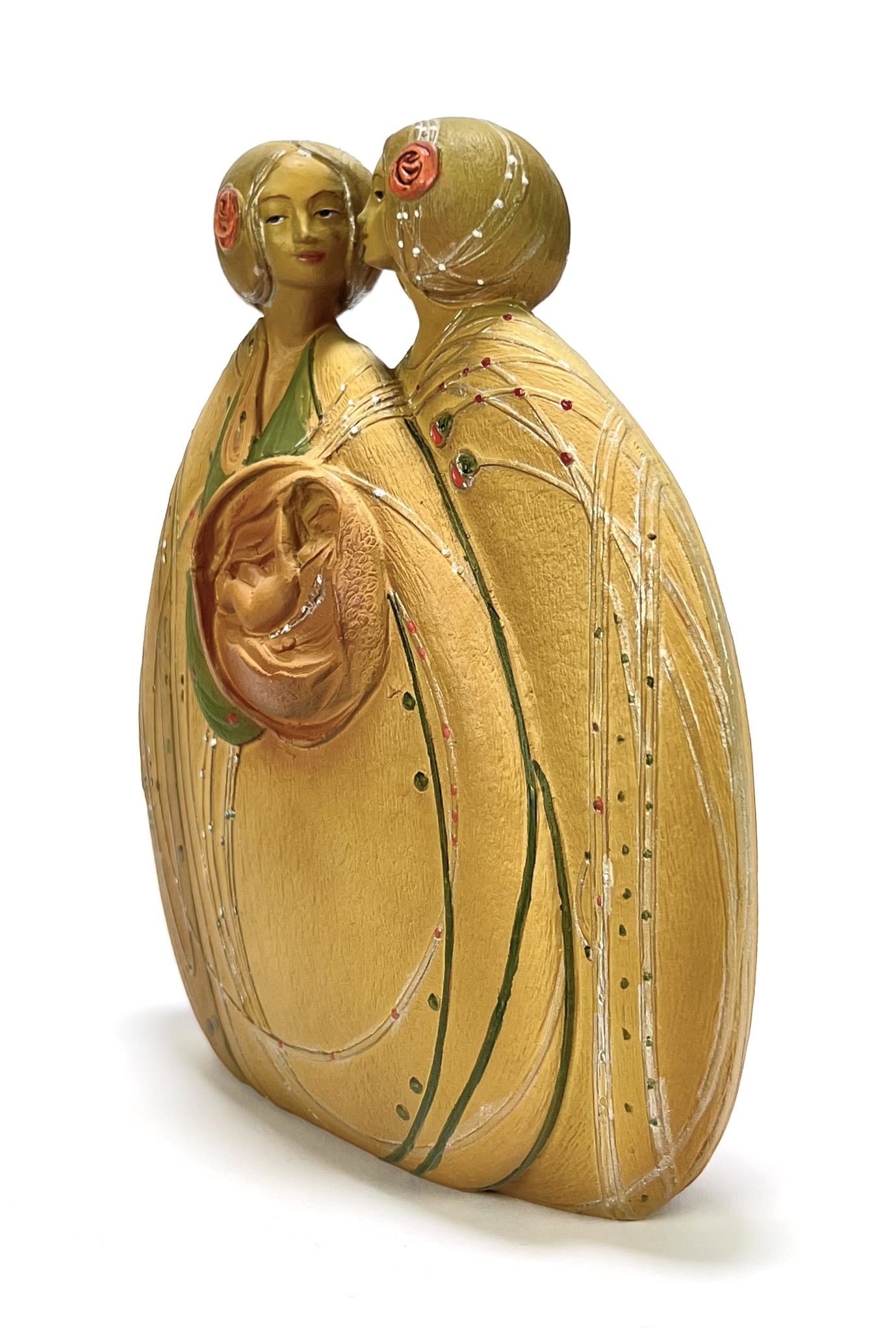 Een beeld geïnspireerd op het werk van Charles Rennie Mackintosh (1868-1928), vervaardigd door de firma Parastone. Het beeldje is gemaakt van polystone en is handbeschilderd. Het object is uitgevoerd in art nouveau-stijl en toont twee omhelzende vrouwenfiguren met een baby. De naam 'MACKINTOSH' is aan de onderzijde gemerkt. De datering van dit werk is omstreeks de 21e eeuw. Wil je dit beeld in het echt bekijken? Kom naar de kijkdagen op 29, 30 en 31 augustus! |