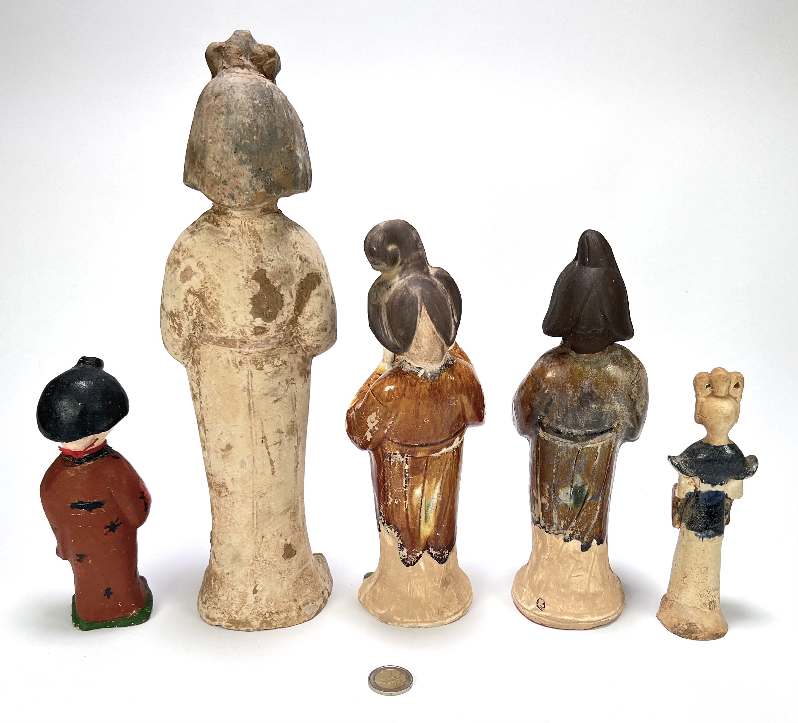 Vijf Chinese beeldjes, circa 1950–1970. Aardewerk met sancai-loodglazuur en plaatselijk polychrome beschildering, hol gevormd met open voet. Voorstellend hof- en muzikantenfiguren in Chinese Tang-stijl met kapsels, waaier en instrument. Verschillende hoogtes, uitgevoerd in amber, groen en crème. Zeker zijn van deelname? Plaats vanaf 22 augustus een schriftelijk bod online! |