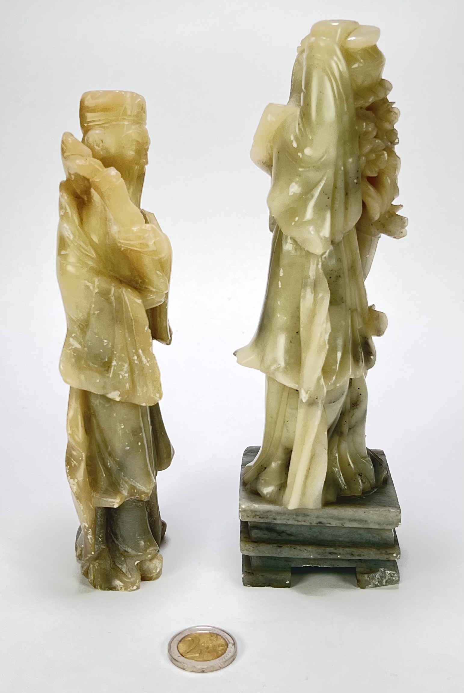 Twee Chinese beelden, circa 1950–1970. Uitgevoerd in speksteen, handgesneden en gepolijst. Voorstelling van een man met langbaard en ruyi-scepter en een vrouw met bloemen, één geplaatst op gelaagde sokkel van dezelfde steen. Halfopen gewerkte details en geaderd, lichtgroen tot oker kleurverloop. Zeker zijn van deelname? Plaats vanaf 22 augustus een schriftelijk bod online! |