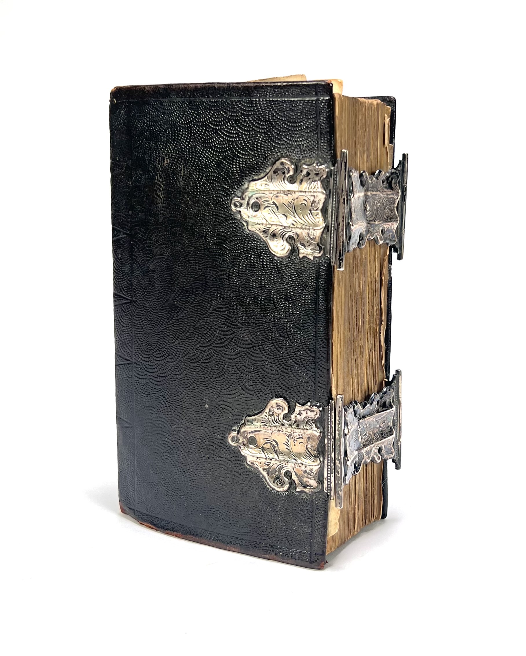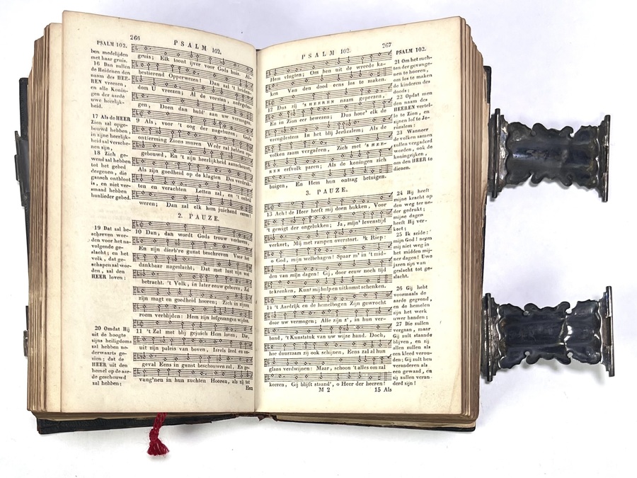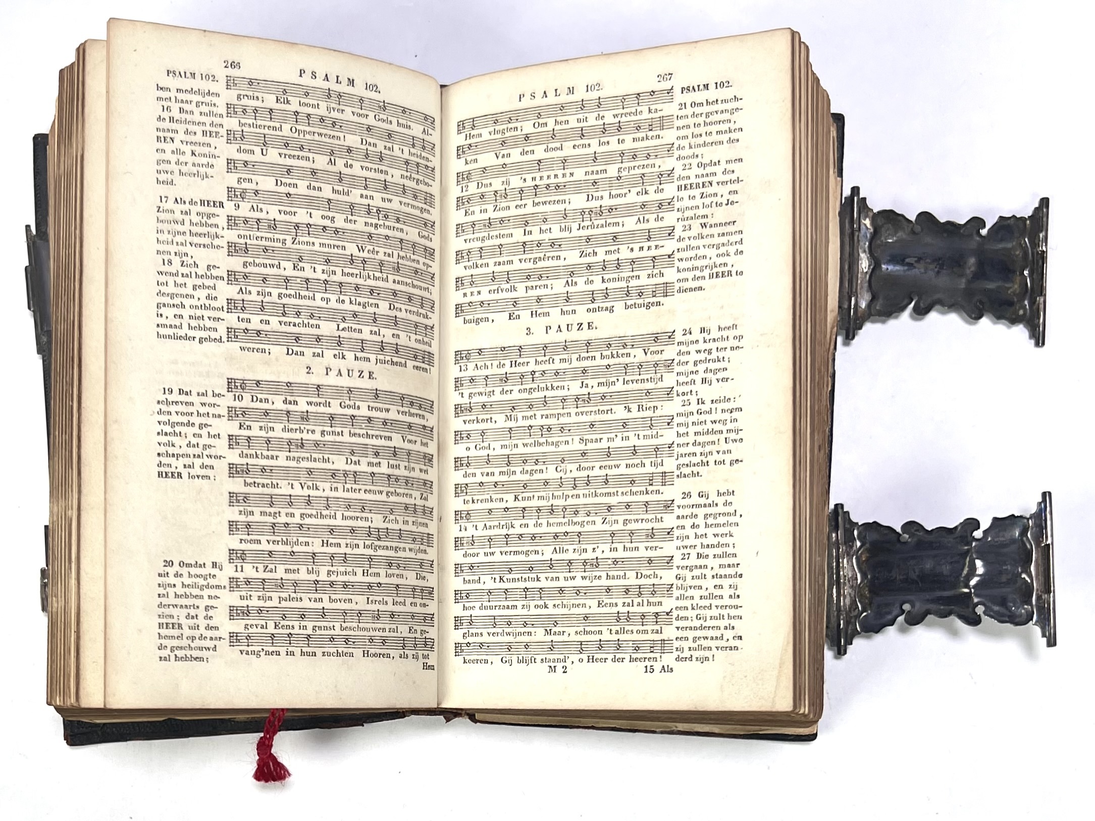 Negentiende-eeuwse bijbel in protestantse traditie, Statenvertaling. Uitgever Nederlandsche Bijbel-Compagnie, Amsterdam; gedrukt door Johannes Enschedé en Zonen, Haarlem, 1858. Papier met geperste leren band en twee zilveren klampen met gegraveerd rocaille-decor. Boekdruk; band met blindstempeling, beugels over de snede. Opvallend zijn de psalmen met muzieknotatie en het golvende leermotief. Voorzijde met geprofileerde sluitplaten en scharnieren Registreer nu en bied eenvoudig online mee op deze bijbel met zilveren slot! |