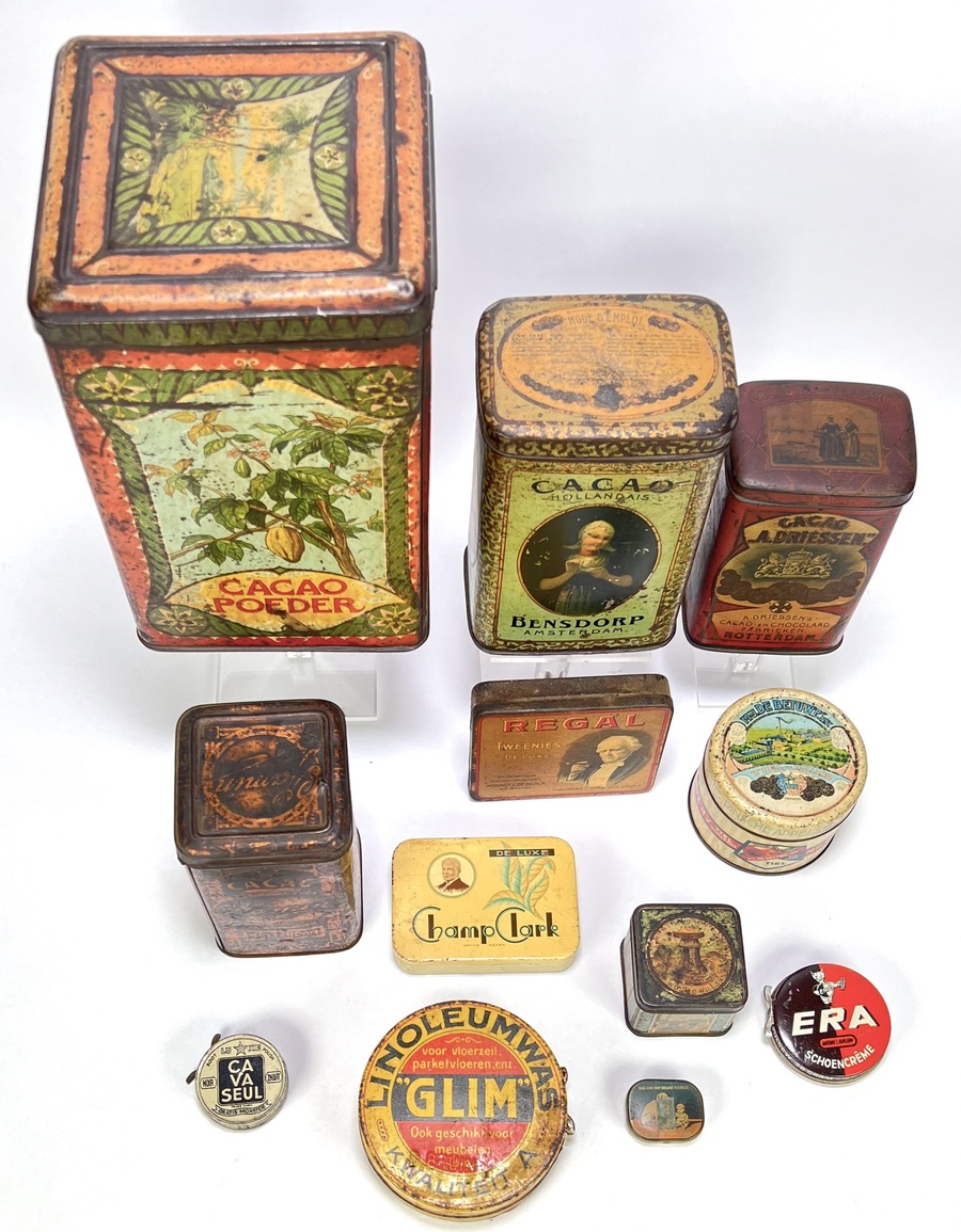 Verzameling reclameblikken uit de eerste helft van de 20e eeuw, vervaardigd uit lithografisch bedrukt metaal. Onder meer cacaoblikken van Bensdorp Amsterdam, Adr. Riessen Rotterdam en diverse merken zoals Regal, Champ Clark, Glim en Era schoencrème. De ontwerpen variëren van florale decoraties en product afbeeldingen tot portretten en typografische logo’s. Verschillende formaten, rond, vierkant en rechthoekig. Kom langs tijdens de kijkdagen (29 t/m 31 augustus) en ontdek deze reclameblikken zelf! |