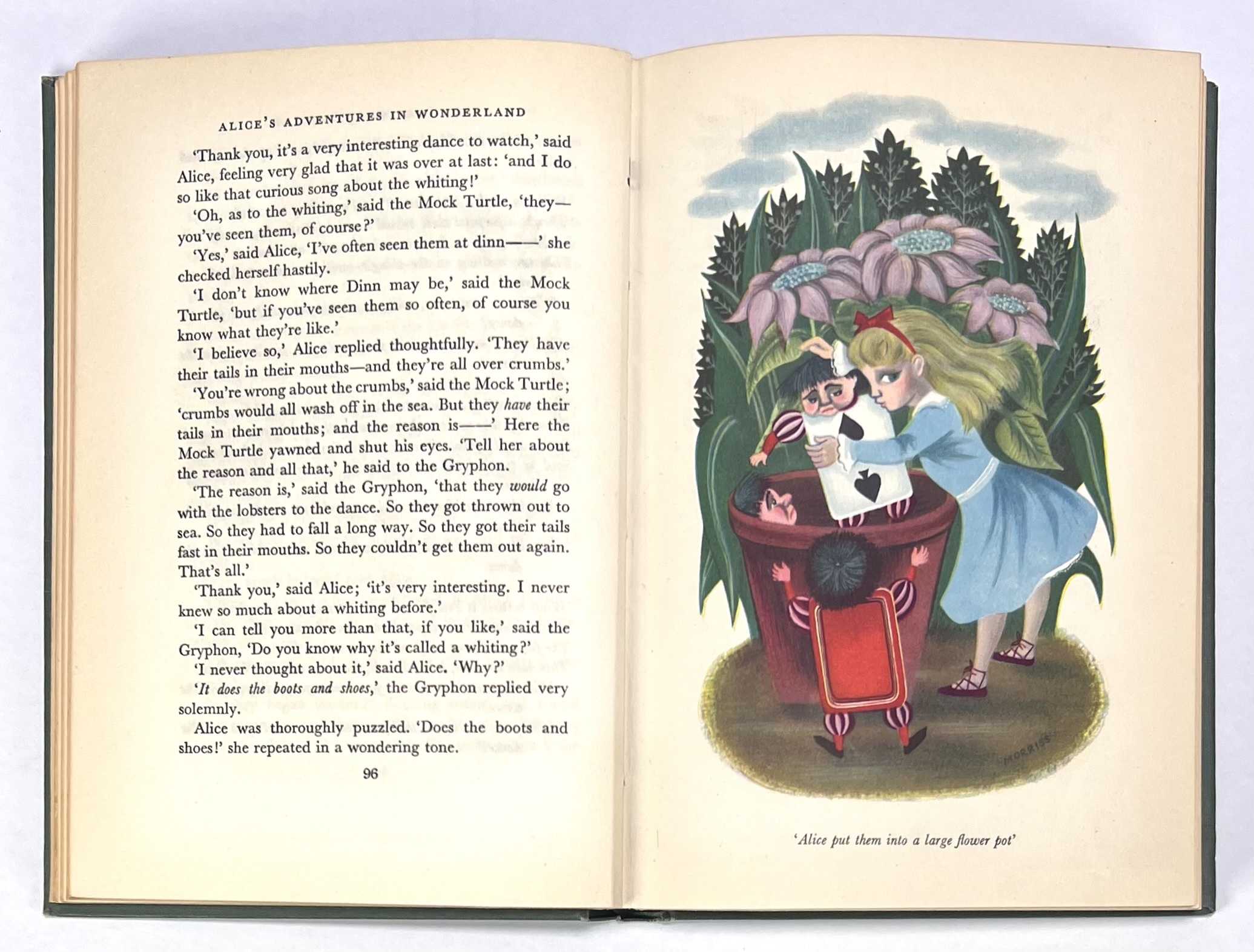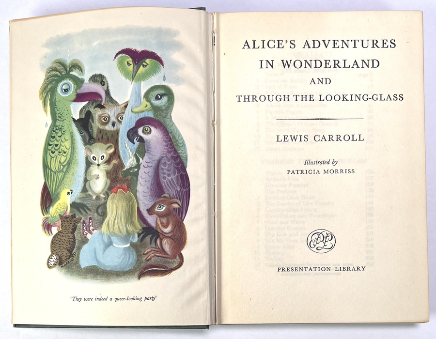 Boek Alice’s Adventures in Wonderland and Through the Looking-Glass van Lewis Carroll (1832–1898), geïllustreerd door Patricia Morriss, gedrukt door Presentation Library, omstreeks midden twintigste eeuw. Groen linnen band met rood florale opdruk en goudstempeling. Binnenwerk met gekleurde platen in gouache en inkt, met gestileerde figuren en zachte kleurcontrasten, kenmerkend voor de mid-20e-eeuwse kinderboekillustratie. Wil je dit boek in het echt bekijken? Kom naar de kijkdagen op 29, 30 en 31 augustus! |