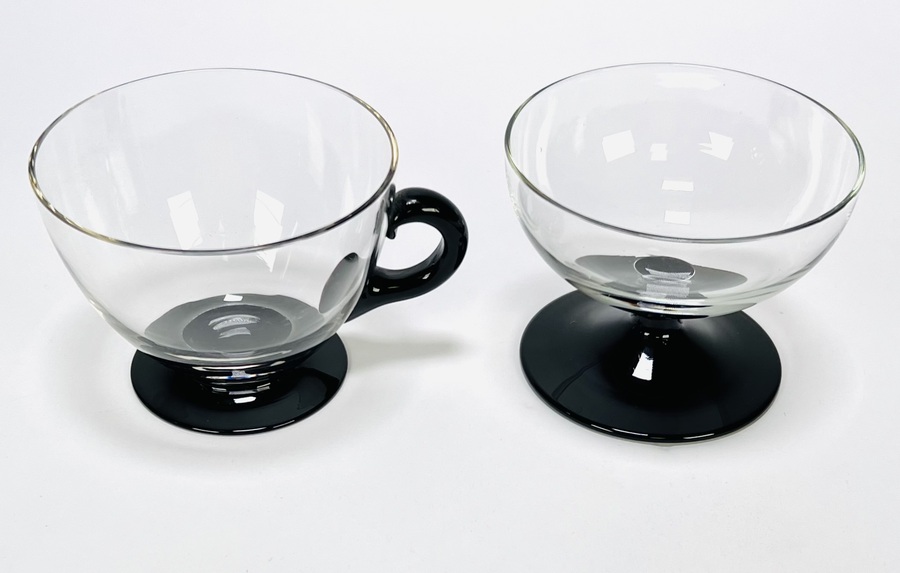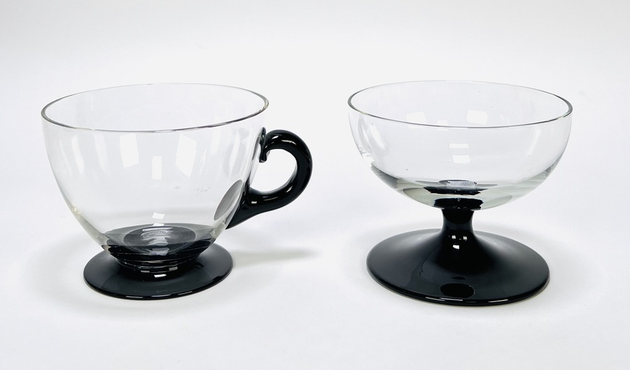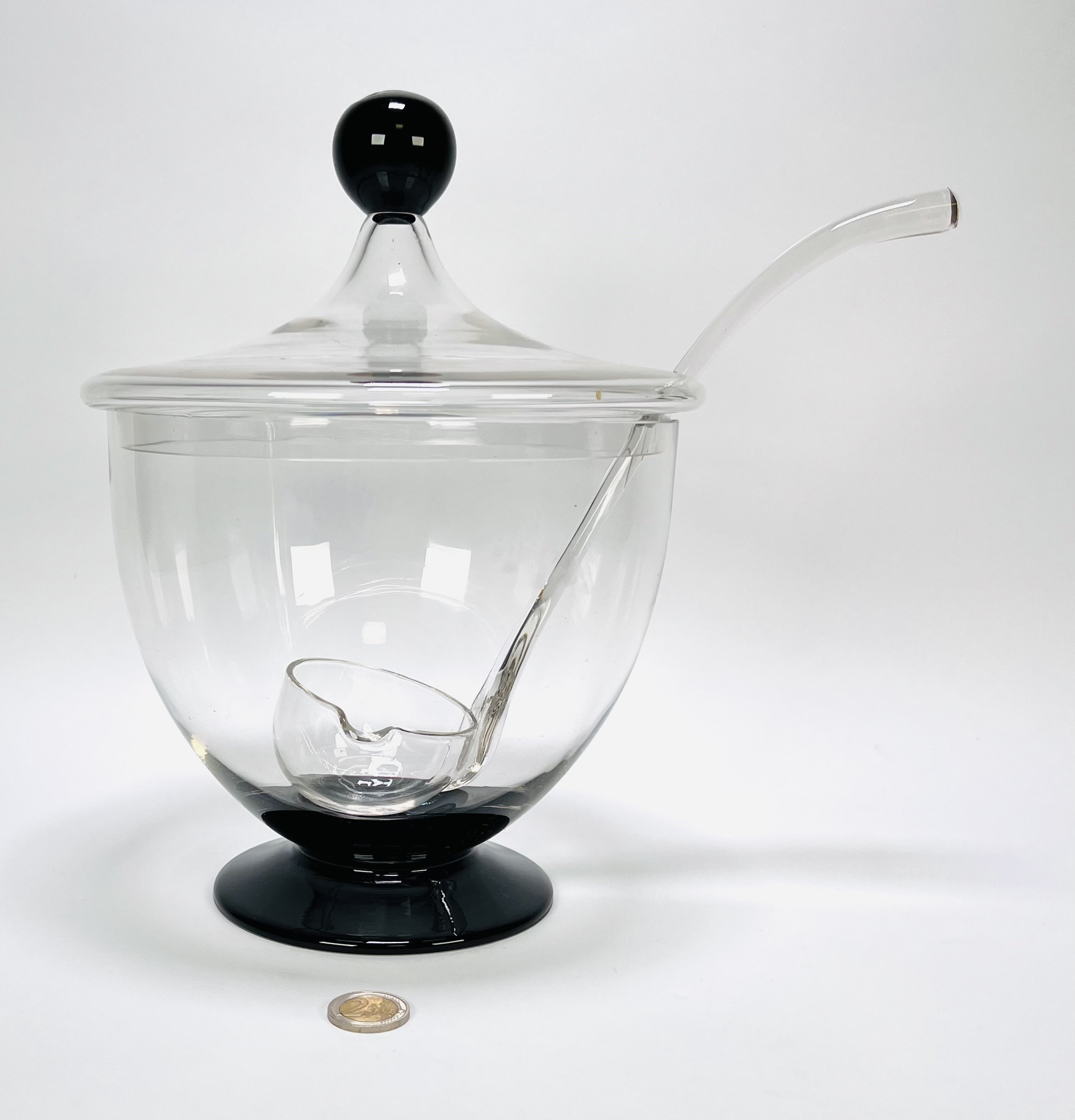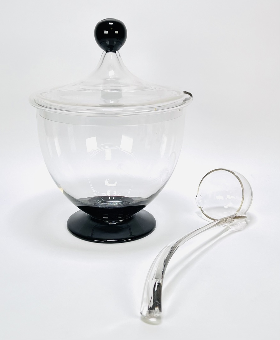Glazen bowlstel uit de tweede helft van de 20e eeuw, in modernistische stijl. Uitgevoerd in helder glas met zwarte details, bestaande uit een grote bowl met deksel en glazen lepel, aangevuld met bijpassende glazen met en zonder oor. Zeker zijn van deelname? Plaats vanaf 22 augustus een schriftelijk bod online! |