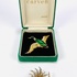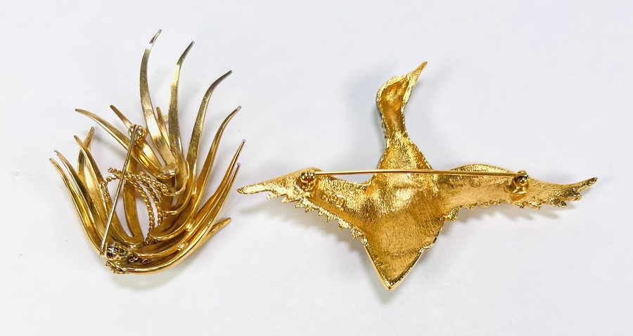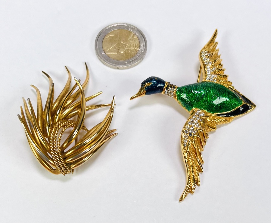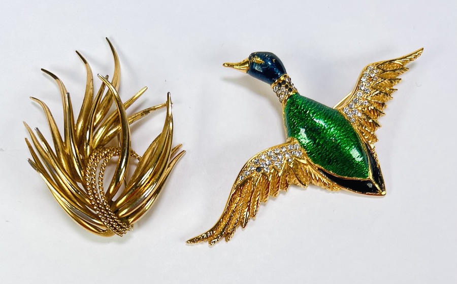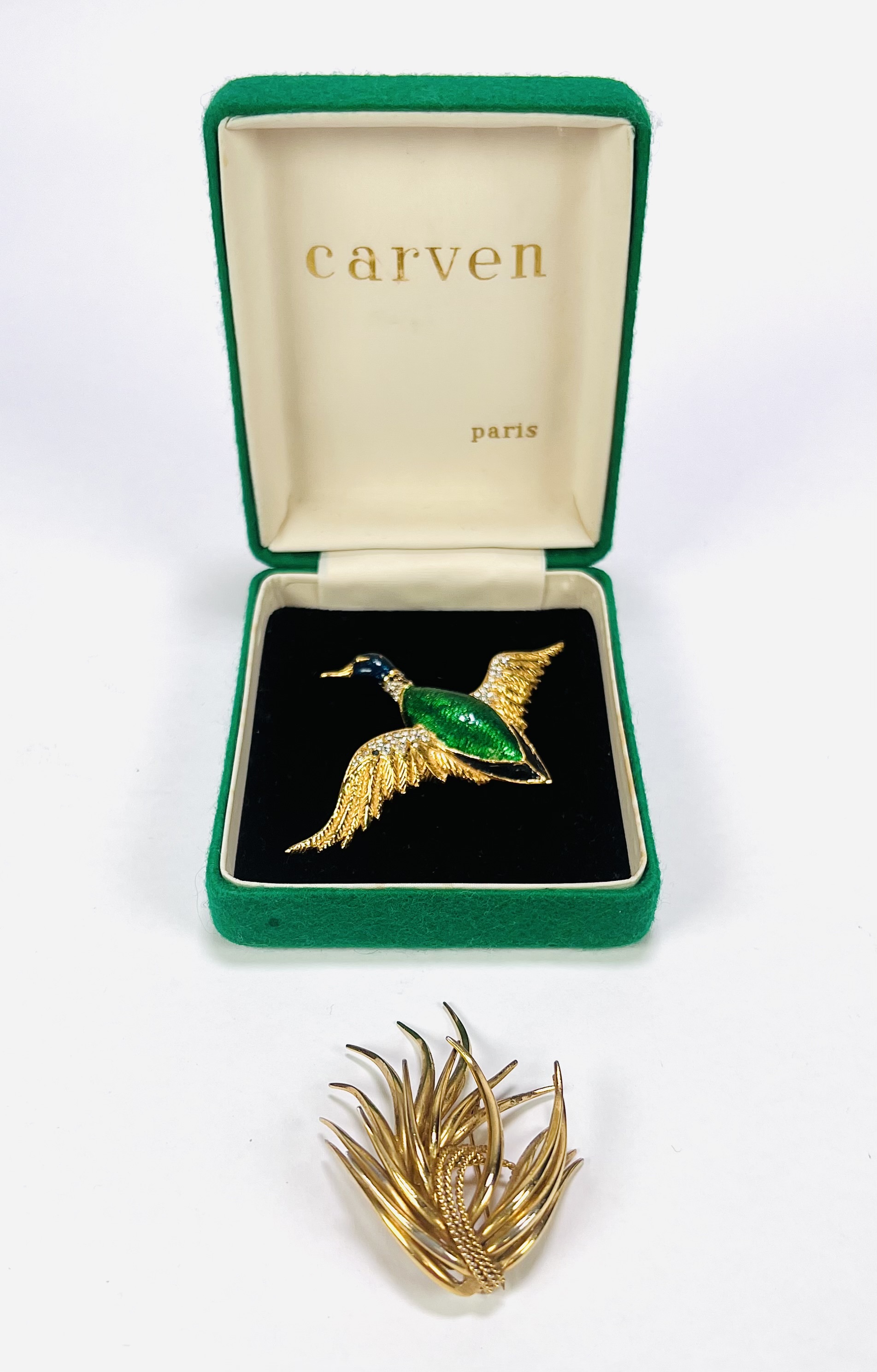 Vergulde metalen broches uit circa 1960, waarvan één in de vorm van een vliegende eend, gemerkt Carven Paris, met groene en blauwe emaille en strass accenten. De tweede broche toont een organisch bladvormig ontwerp met vergulde golvende elementen en decoratief kettinkje en gemerkt met Grosse made in Germany. Eerst deze broches zien voordat je biedt? Bezoek onze kijkdagen op 29, 30 en 31 augustus van 11:00 tot 17:00 uur! |