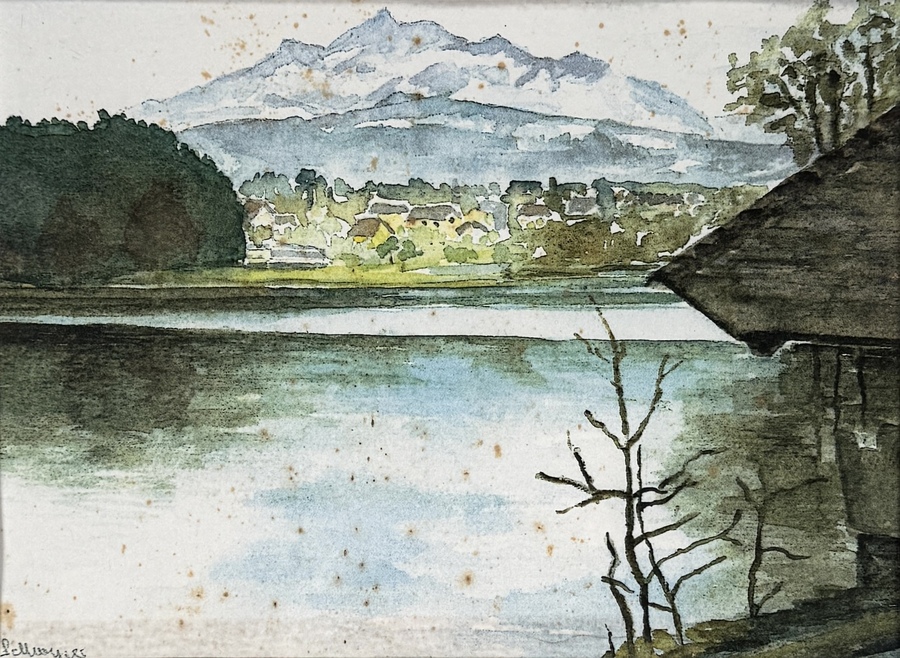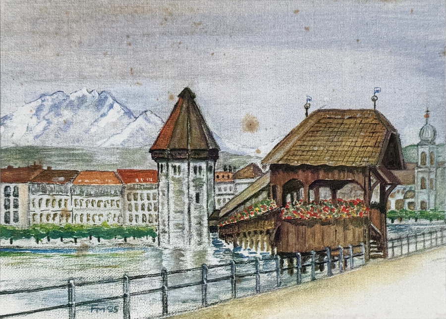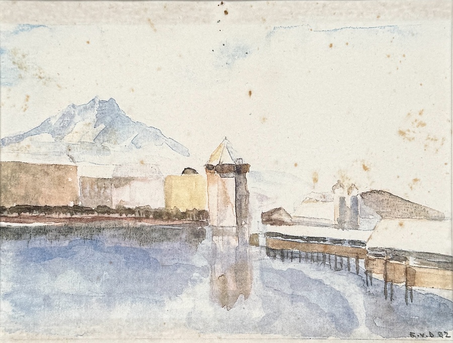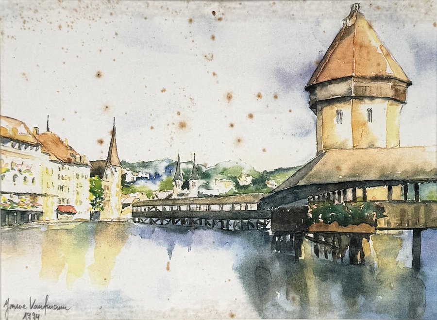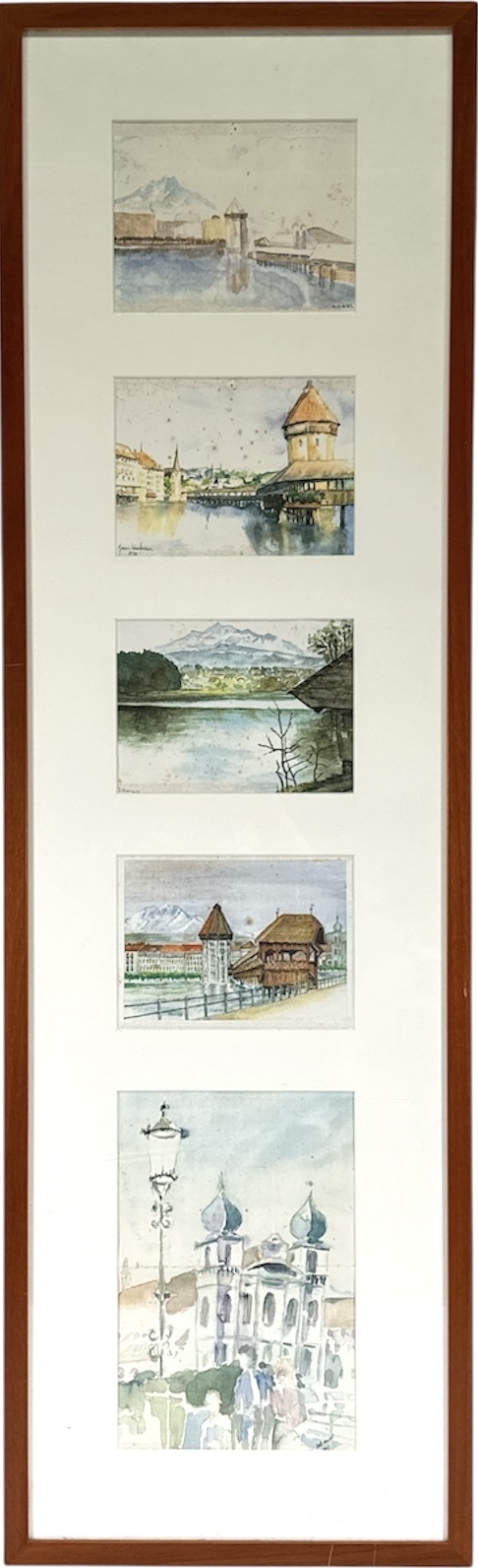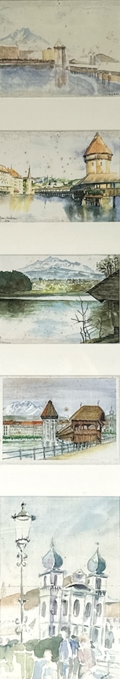 Collage samengesteld uit vijf gedrukte afbeeldingen op papier van verschillende kunstenaars, deels gesigneerd en één gedateerd 1994, uitgevoerd in kleurendruk met zichtbaar raster. Collage toont stadsgezichten van Luzern, waaronder Kapellbrücke en de kerk aan de Reuss. In passe-partout en houten lijst, vervaardigd eind 20e eeuw. Wil je direct deelnemen? Plaats vanaf 22 augustus alvast een schriftelijk bod via onze website! |