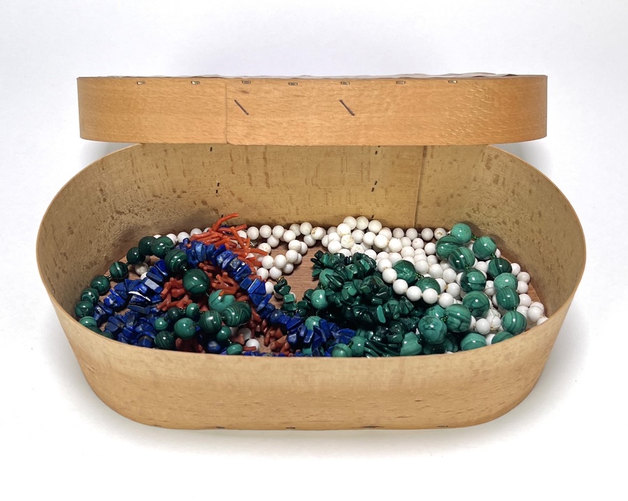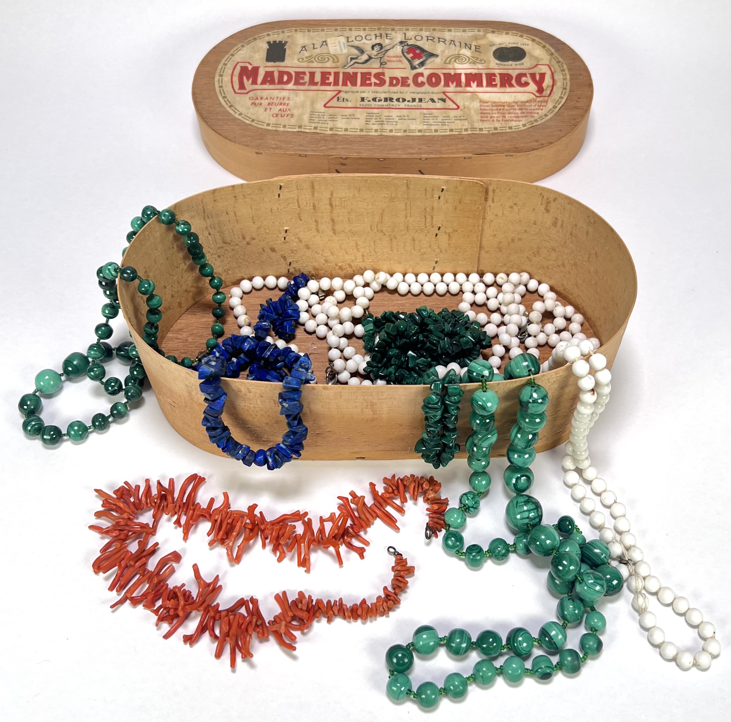 Een houten doos, daterend circa 1950, is gemaakt van beukenhout en heeft een gedrukte decoratie van 'Madeleines de Commercy' van Ets. F. Grojean. De doos is gevuld met een gevarieerde collectie van sieraden, waaronder kettingen van koraal en malachiet. Sieraden 20e eeuw. Zeker zijn van deelname? Plaats vanaf 22 augustus een schriftelijk bod online! |