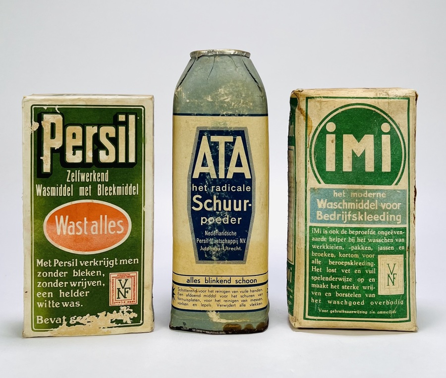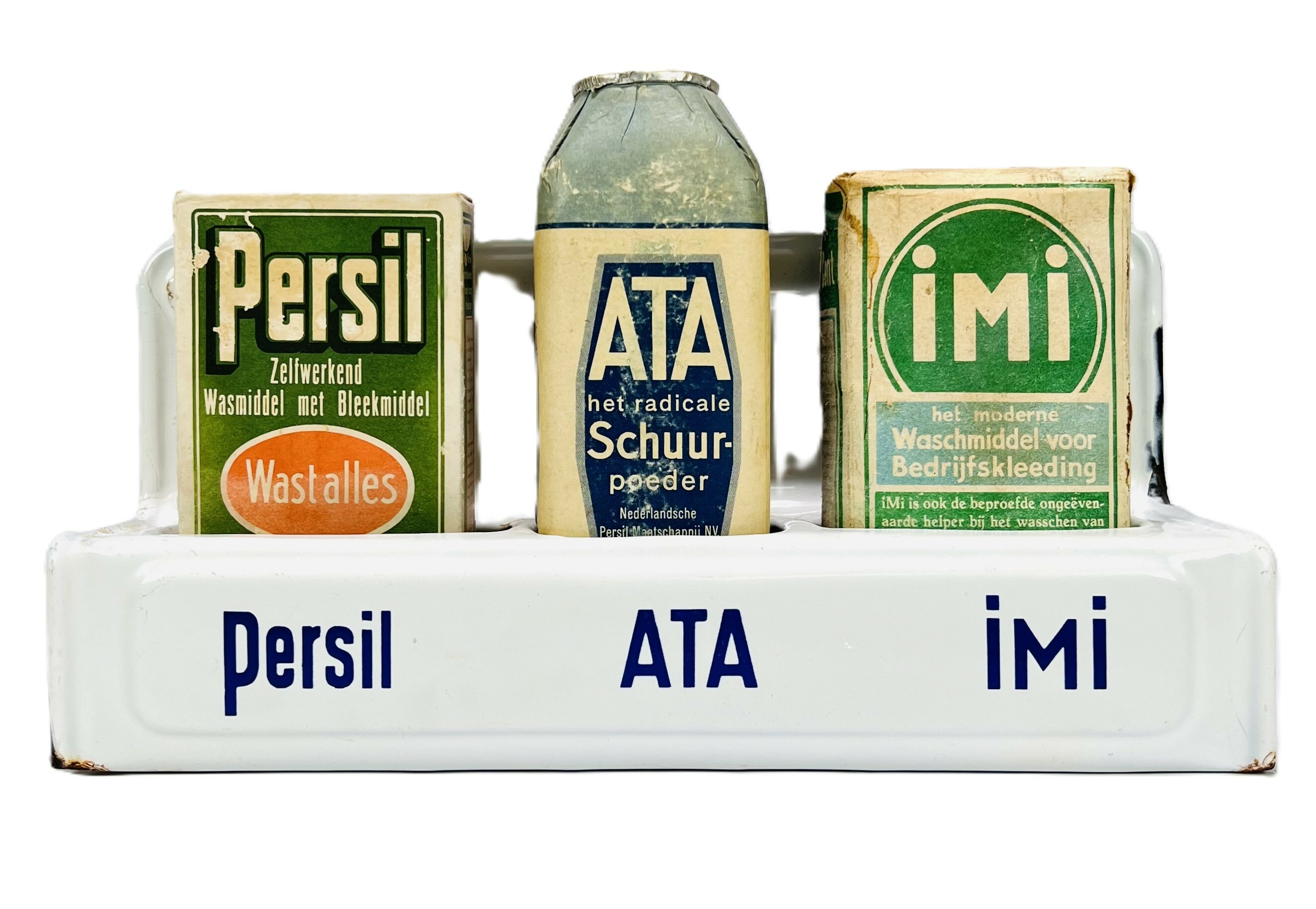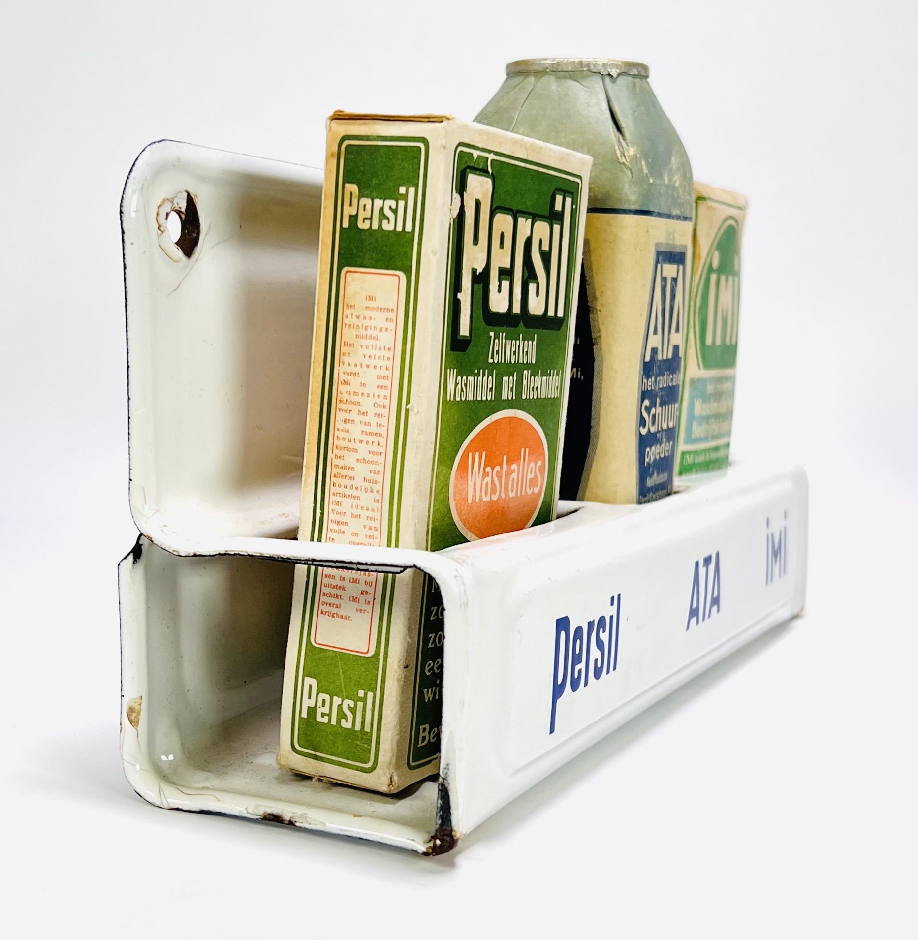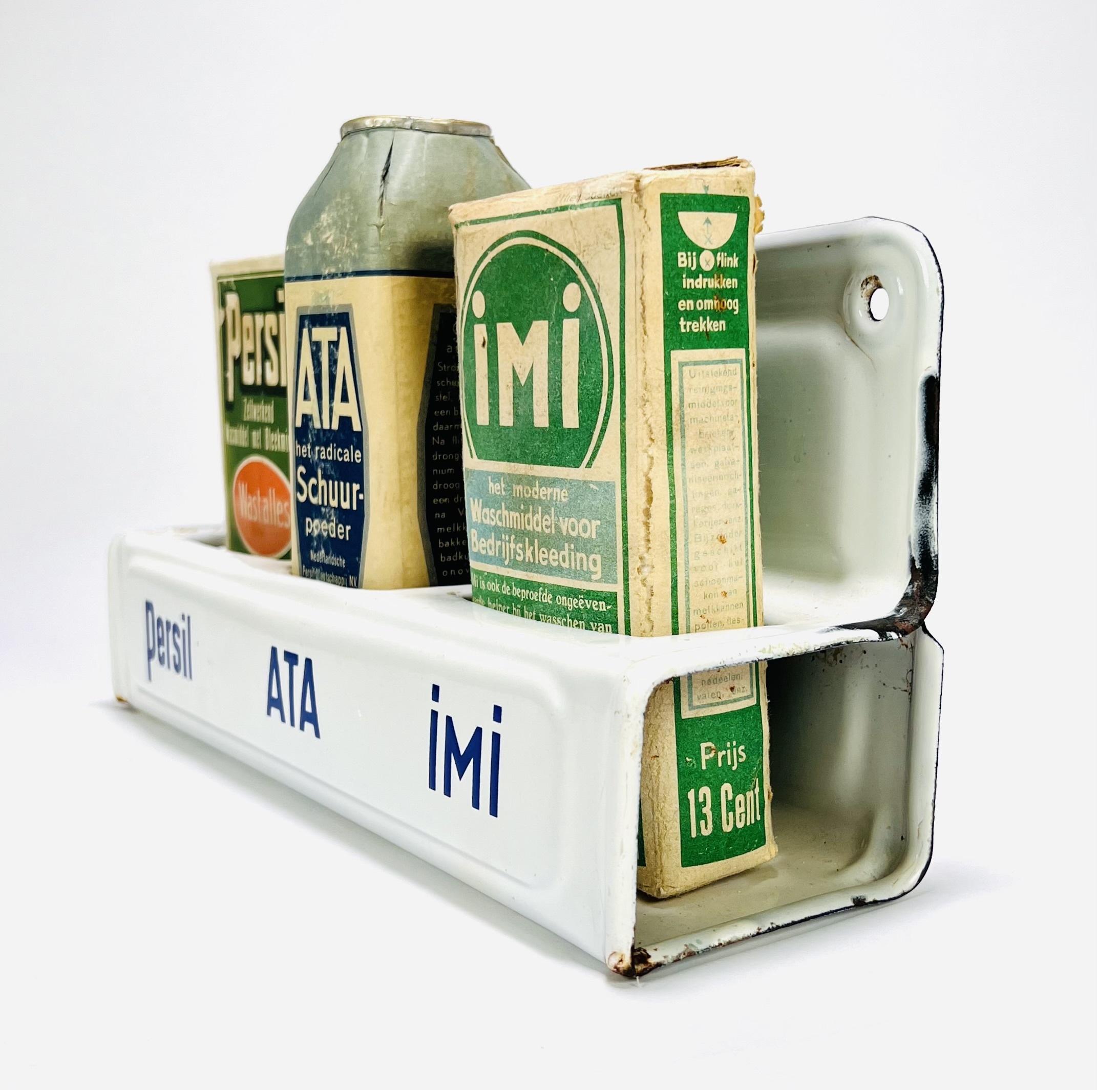 Vintage emaille rek vervaardigd uit geëmailleerd metaal, met wandophangsysteem en kobaltblauwe belettering voor Persil, ATA en imi. Uitgevoerd met drie compartimenten waarin originele verpakkingen zijn geplaatst. Typisch voor midden 20e-eeuwse huishoudstijl, vervaardigd circa 1950. De toegepaste techniek is emailleren op plaatstaal. Functioneel ontwerp met afgeronde vormen en heldere merktypografie, bedoeld voor huishoudelijk of winkelgebruik. Klaar om te bieden? Registreer je nu en doe mee aan de veiling! |