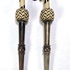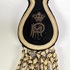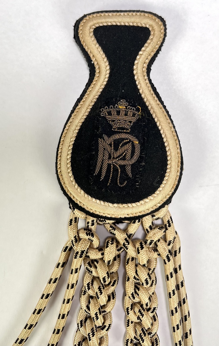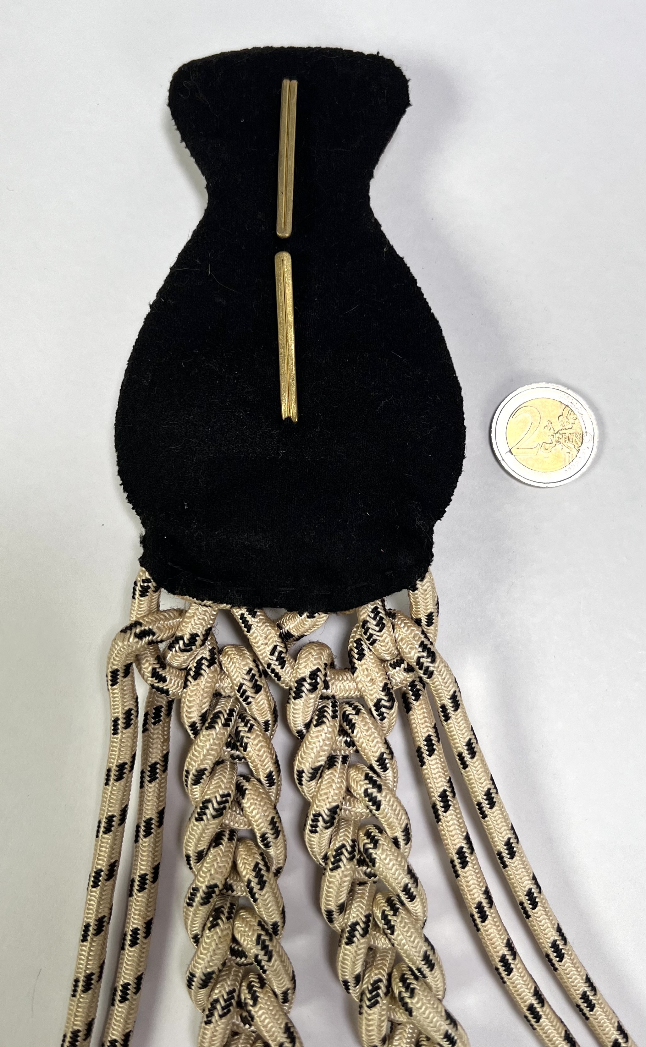 Militair ceremonieel embleem uit omstreeks eind negentiende tot begin twintigste eeuw, uitgevoerd in zwart textiel met goudkleurig koord en geborduurd monogram “MR” onder kroon. Te zien zijn gevlochten crèmekleurige koorden met zwart patroon, eindigend in messing punten met vlechtwerkmanchetten. Achterzijde met twee horizontale messing houders voor bevestiging, typerend voor officiersuniformaccessoires. Dit embleem zelf beoordelen? Je bent welkom op onze kijkdagen op 29, 30 en 31 augustus! |