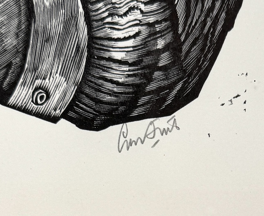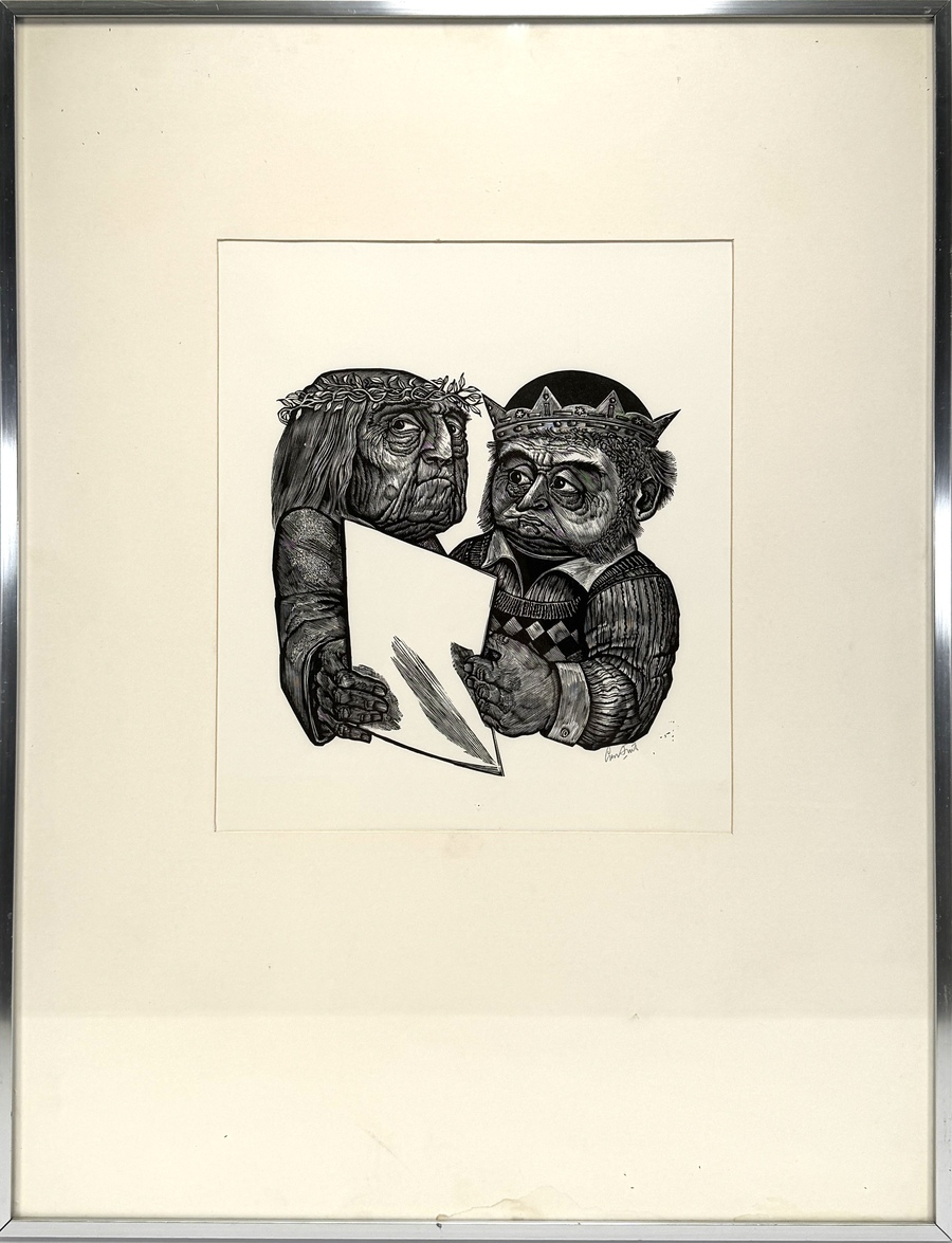 Ets van Lou Strik (1921–2001), tweede helft 20e eeuw, op papier. De voorstelling toont twee figuren, waarvan één met doornenkroon en één met kroon en ruitpatroon, die samen een blad papier vasthouden. Uitgevoerd in expressief-figuratieve stijl met karikaturale trekken en krachtige lijnvoering. Rechtsonder met potlood gesigneerd. Zeker zijn van deelname? Plaats vanaf 22 augustus een schriftelijk bod online! |