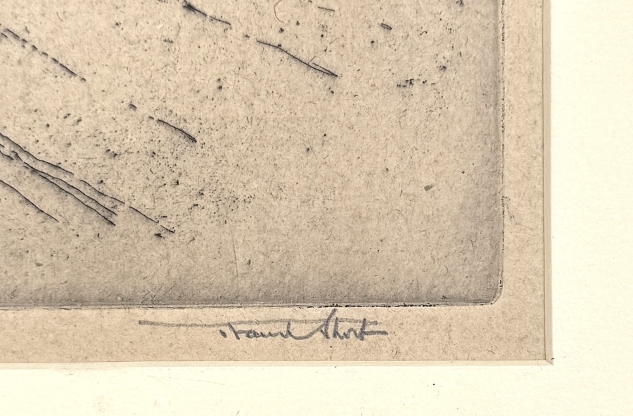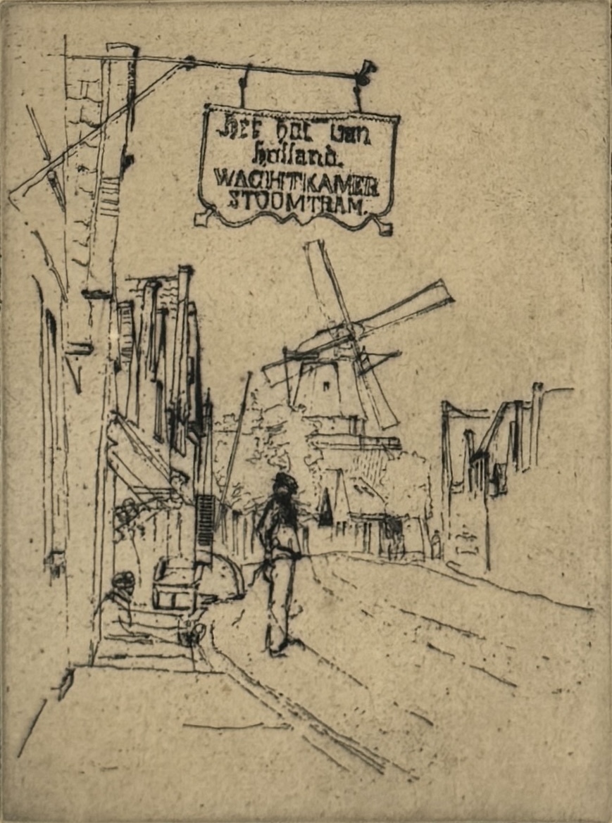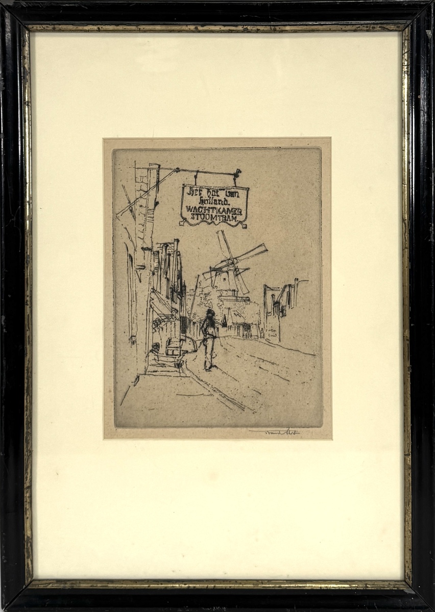 Ets van een Nederlands straatje met windmolen, uithangbord “Het hof van Holland Wachtkamer Stoomtram” en enkele figuren. Frank Short (1857–1945), circa 1910–1930. Drogenaald techniek, plaatrand zichtbaar, rechtsonder met potlood gesigneerd, gemonteerd onder passe-partout in zwarte lijst. Opvallend zijn de schetsmatige lijnvoering, brede marges en de kenmerkende atmosferische eenvoud van Shorts grafisch werk. Wil je dit werk n het echt bekijken? Kom naar de kijkdagen op 29, 30 en 31 augustus! |