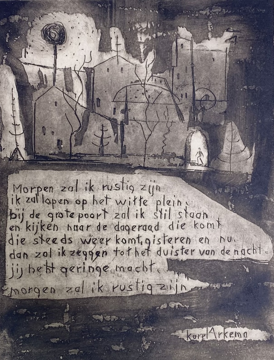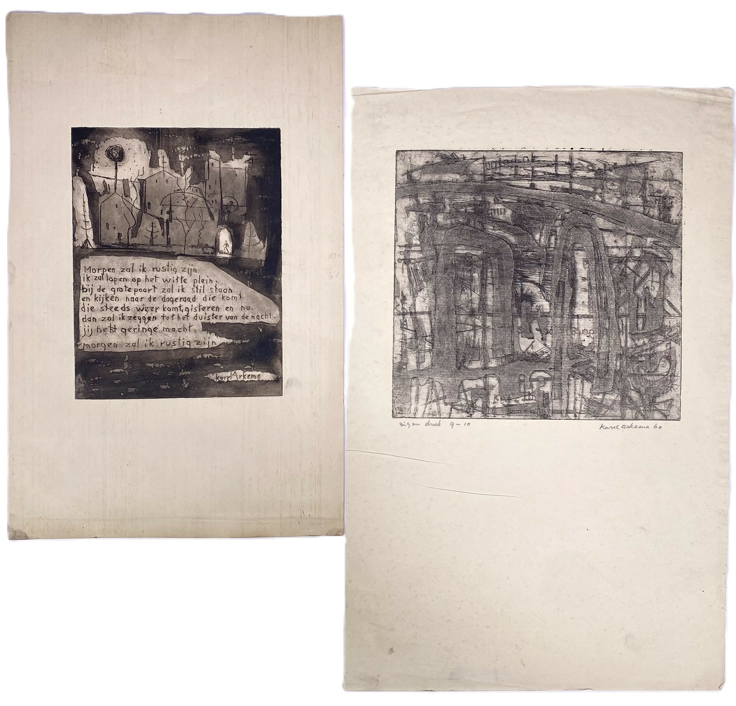 Twee etsen van Karel Arkema (1901–1965), lid van De Ploeg, beide uit 1960. Uitgevoerd op papier in modernistische stijl met expressionistische invloeden. Eén ets toont een stadslandschap met poëtische tekst en is in de plaat gesigneerd, de andere ets is rechtsonder met potlood gesigneerd “Karel Arkema 60” en linksonder voorzien van "eigen druk 9-10”. De etsen zelf beoordelen? Je bent welkom op onze kijkdagen op 29, 30 en 31 augustus! |