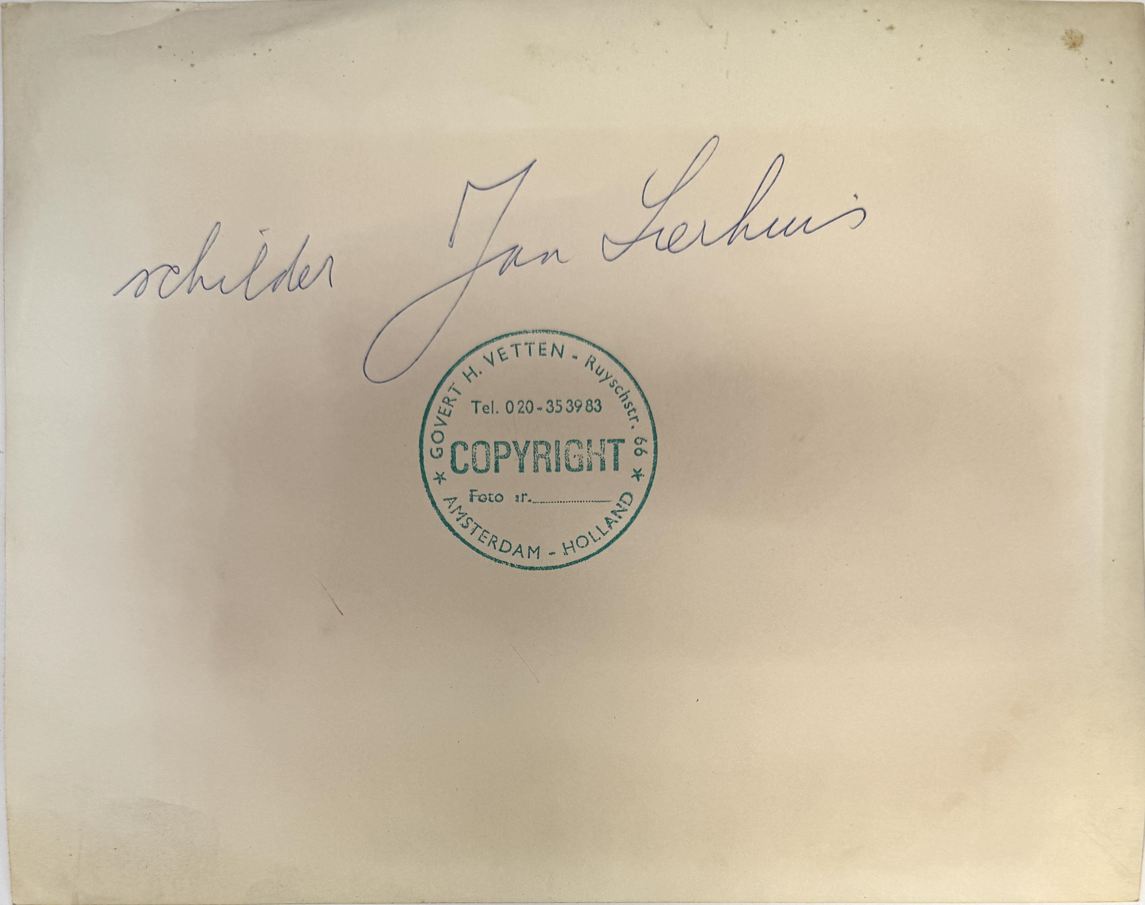 Zwart-wit atelierportret in documentaire stijl. Gelatinezilverdruk op fotopapier, Nederland, jaren 70. Afgebeeld de zittende kunstenaar Jan Sierhuis (1928-2023) tussen twee schilderijen tegen een bakstenen muur. Verso voorzien van groen copyrightstempel “Govert H. Vetten, Amsterdam” en handgeschreven notitie “schilder Jan Sierhuis”. Liggend formaat met sterke centrale kadrering en natuurlijk licht.