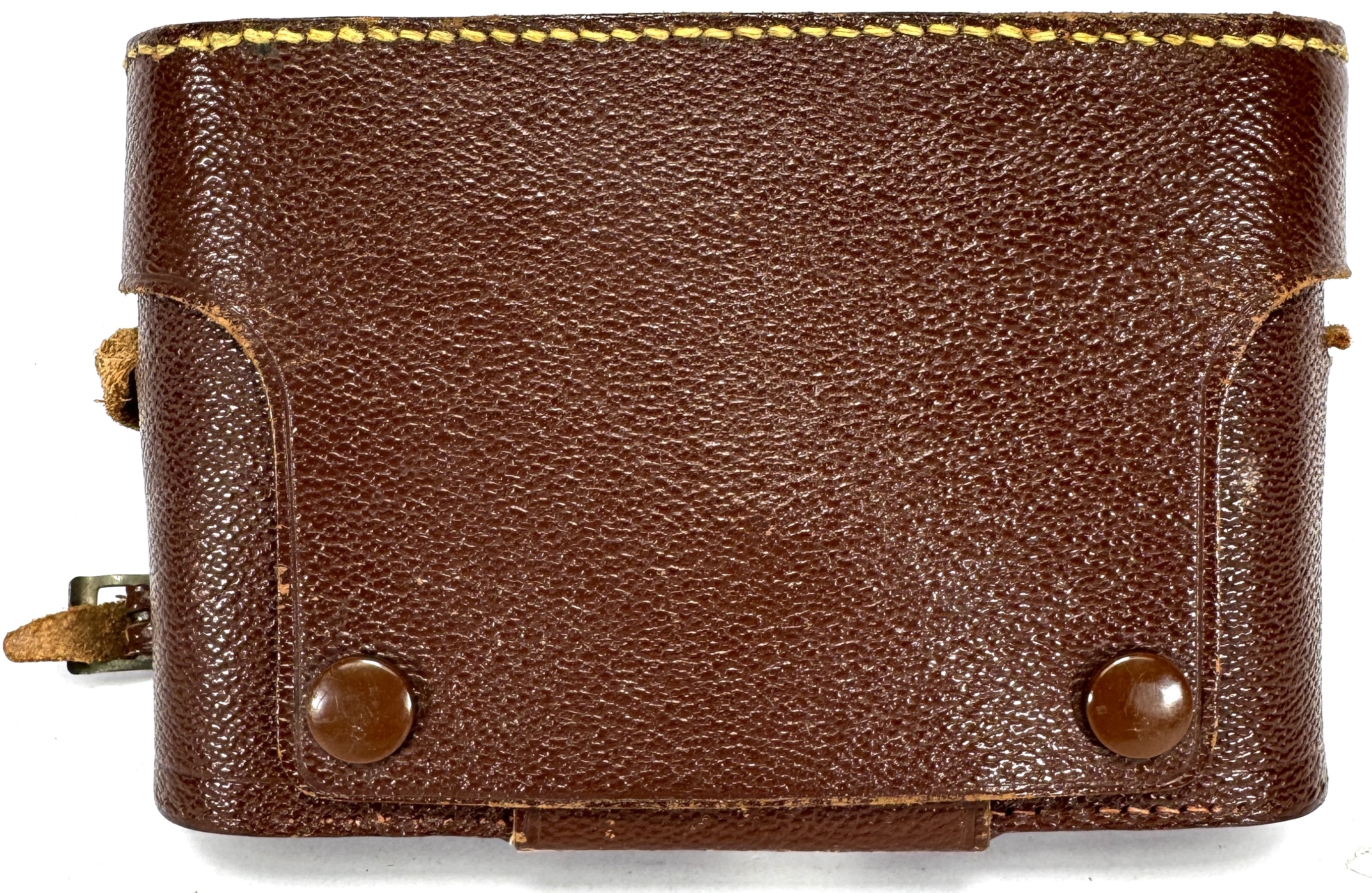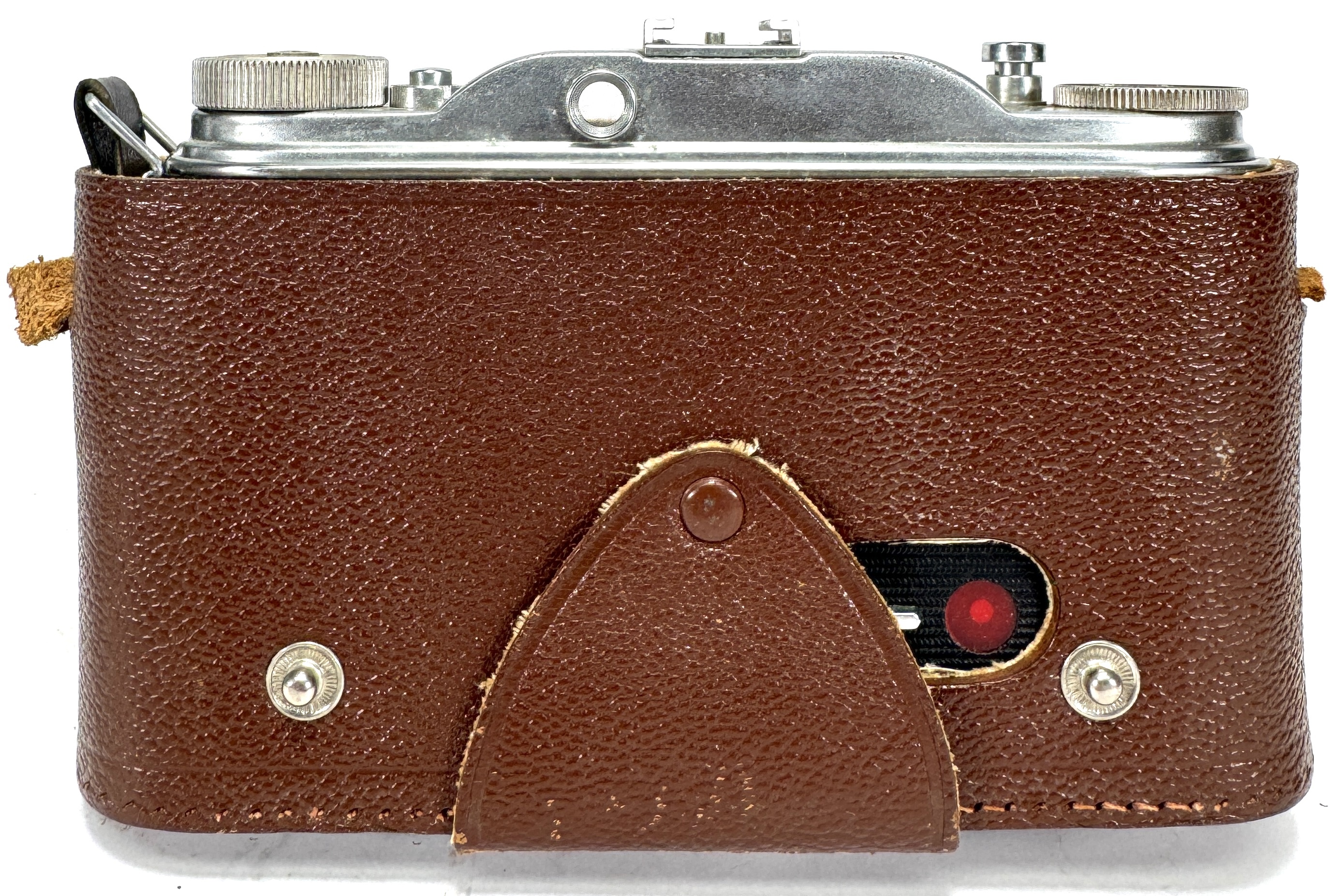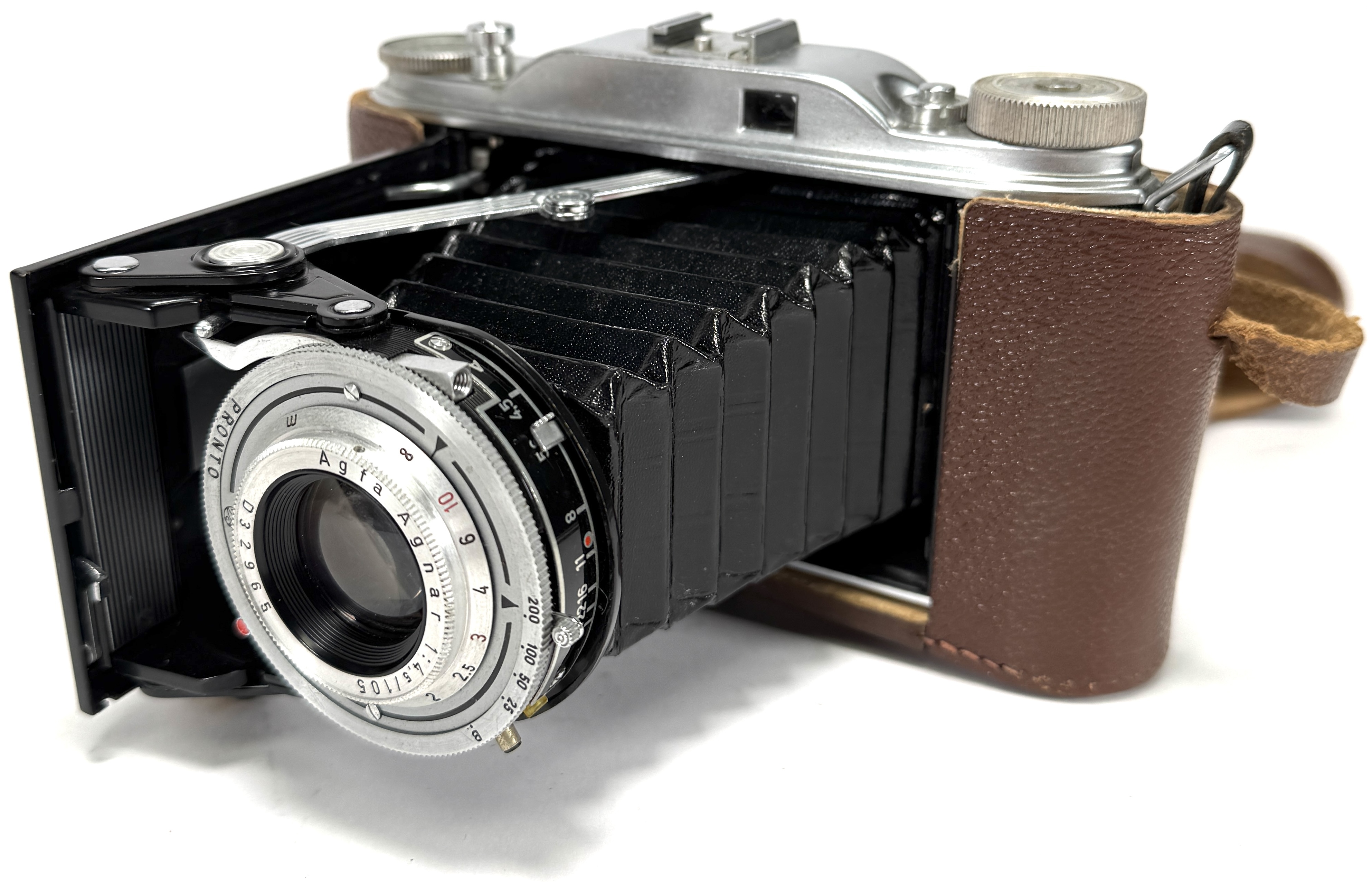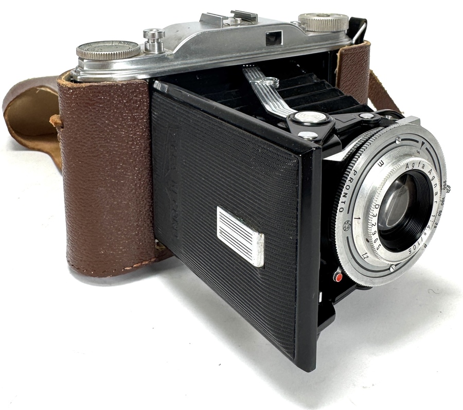 Agfa vouwcamera “Record”, omstreeks 1950–1955, met Pronto-sluiter en Agnar 105 mm f/4,5 objectief. Materiaal: verchroomd en gelakt metaal, glas en textiele balg, met originele bruine leren etui. Mechanische 120-film camera met klapfront, rode controlevenster en instelringen voor sluitertijden en diafragma. Gemerkt: “Agfa Record” op front, lensring “Agnar/Pronto”, etui met Agfa-logo. Geïnteresseerd? Bezoek onze kijkdagen op 29, 30 of 31 augustus van 11:00 tot 17:00 uur! |