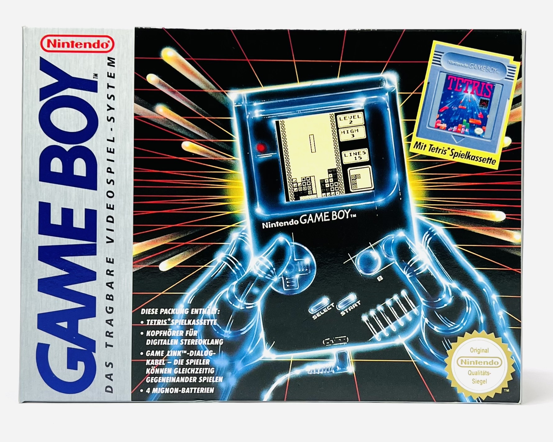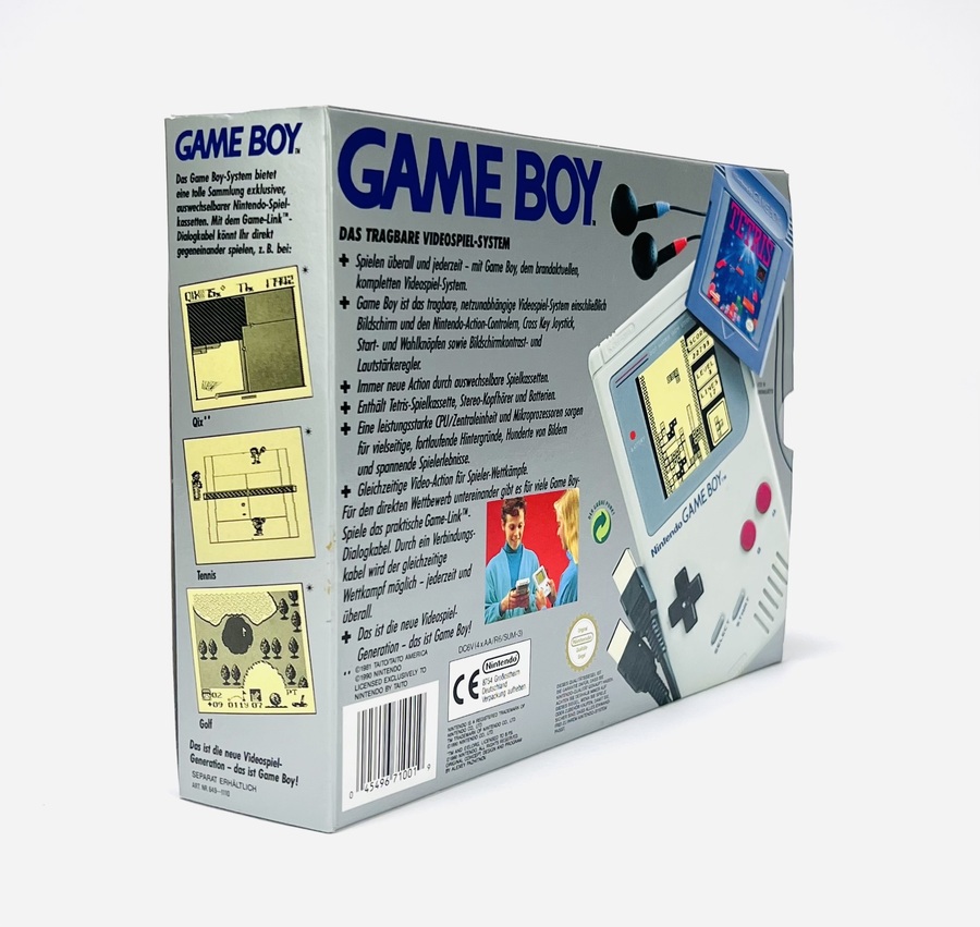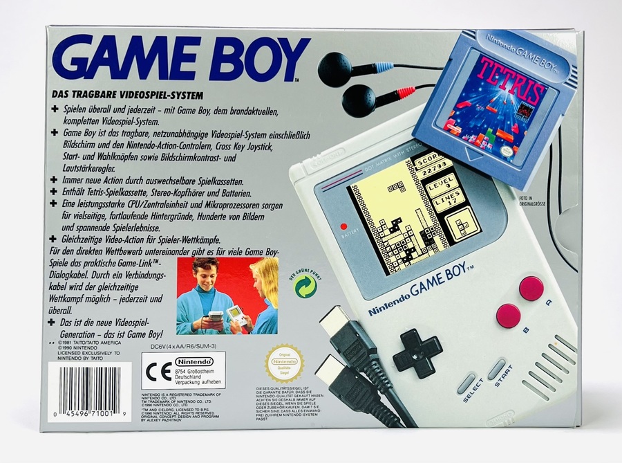 Nintendo Game Boy-set uit exact 1989, geproduceerd door Nintendo Co., Ltd. De set bevat een Game Boy-console, Tetris-spelcassette, Game Link-kabel, oordopjes, handleidingen en originele doos met Duitstalige productinformatie. De console is vervaardigd uit kunststof, bedrukt in grijs met paarse knoppen. Originele verpakking toont futuristische game-illustraties en draagt het officiële kwaliteitszegel. Complete set met bijbehorende accessoires in originele staat. Voeg deze Game Boy toe aan je verzameling en doe een bod! |