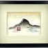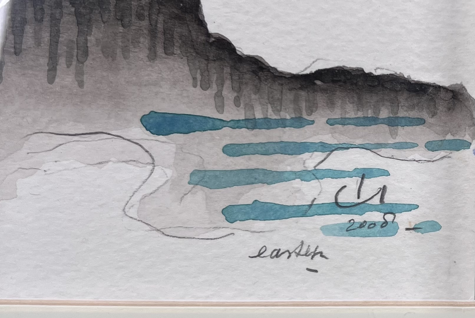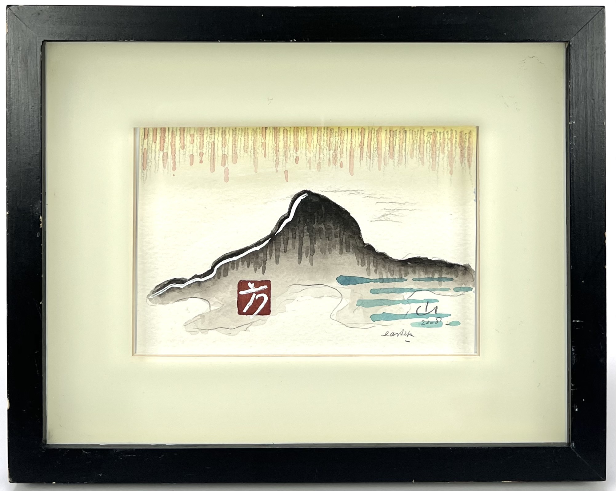 Aquarel en inkt op papier, 2008, in minimalistische Aziatisch geïnspireerde stijl met verso een bedankwoord van Cocky en Woody, door Wilhelmus Josephus (Woody) van Amen (Eindhoven, 26 augustus 1936). Gestileerd berglandschap met druppelende grijze wassing en turquoise waterstrepen. Rechtsonder gemonogrammeerd “CJ” en gedateerd 2008; onderrand getiteld “earth”. Ingelijst achter glas in zwarte houten lijst met brede crème passe-partout. Compositie met vloeiende contourlijn rond de berg; lichtgrijze ondergrond toont potloodschetslijnen.