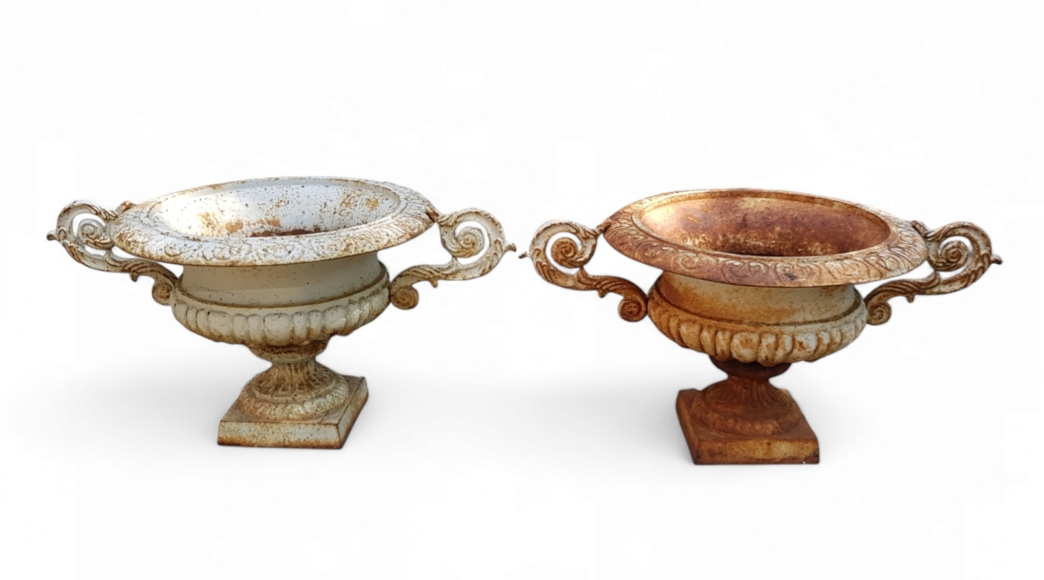 Twee gietijzeren tuinvazen, daterend midden 20e eeuw. De vazen zijn vervaardigd door middel van zandgieten en zijn in een klassieke stijl uitgevoerd. Eén vaas is geverfd in een witte kleur, terwijl de andere een roestpatina heeft. De vazen hebben een brede buik en twee S-vormige handvatten. De tuinvazen zelf beoordelen? Je bent welkom op onze kijkdagen op 29, 30 en 31 augustus! |