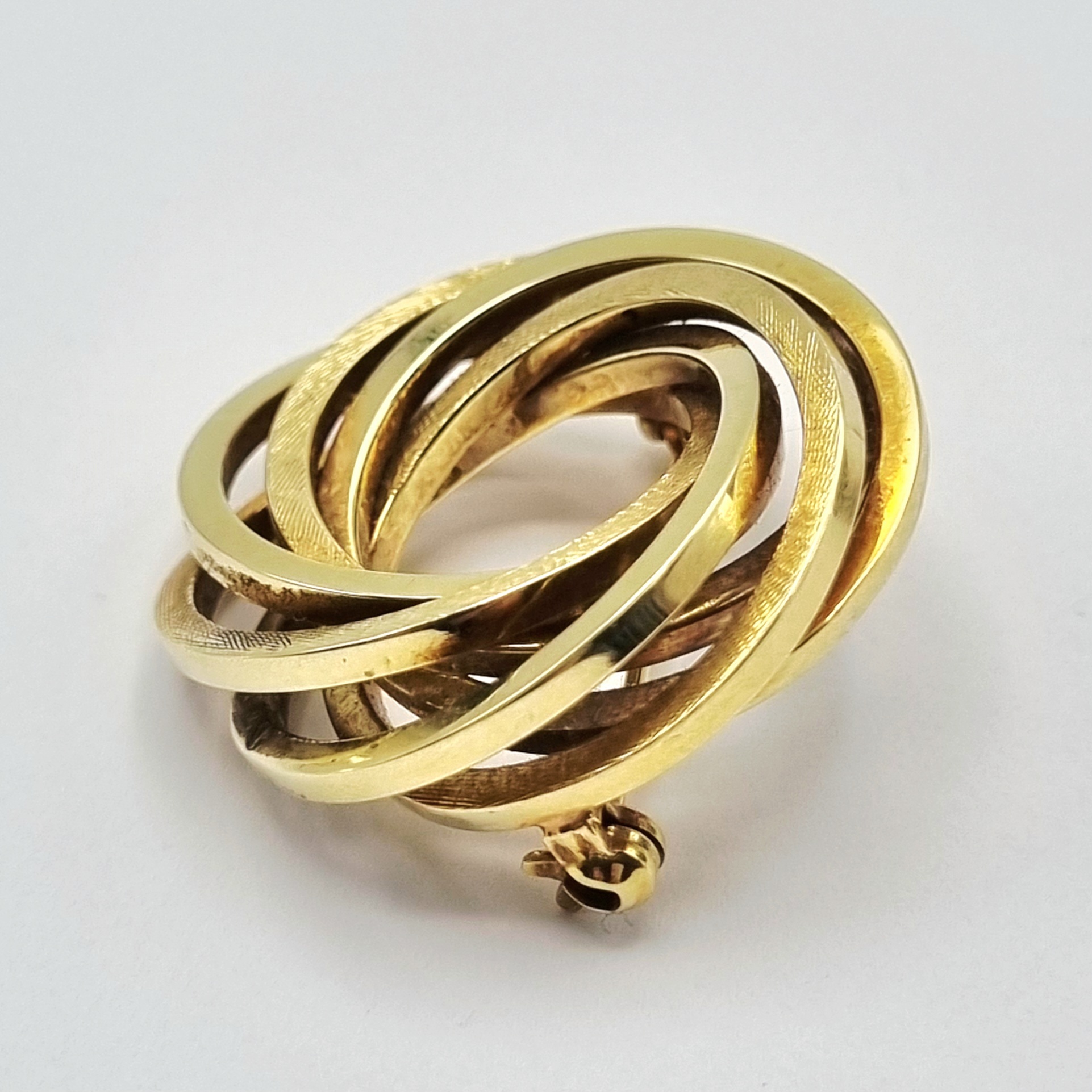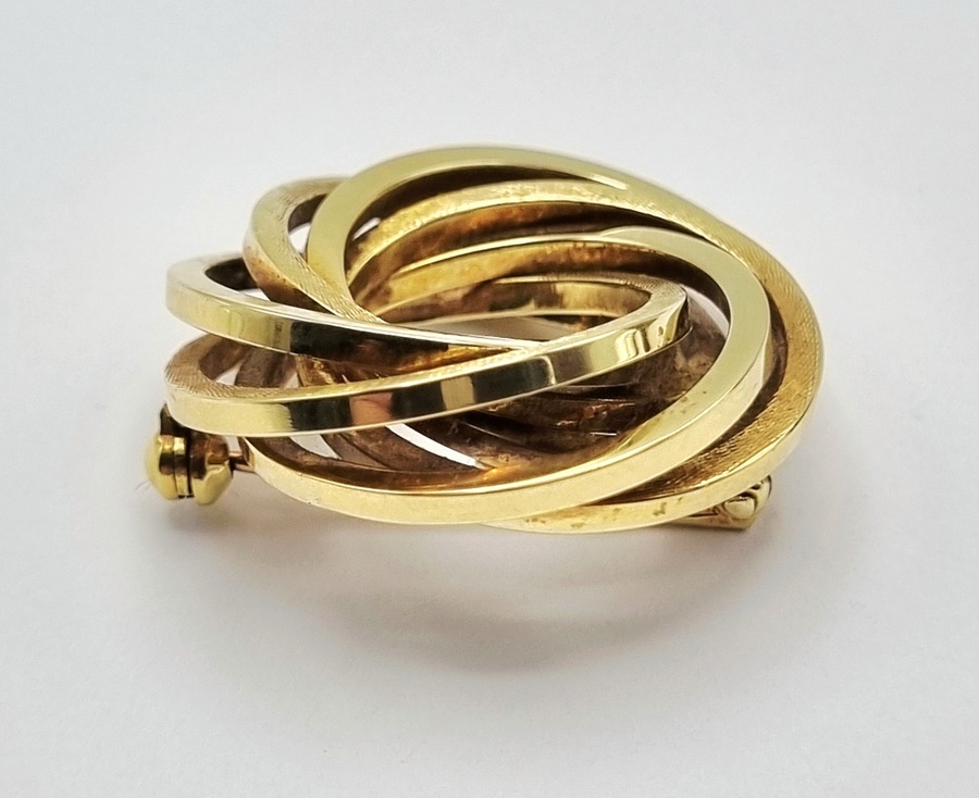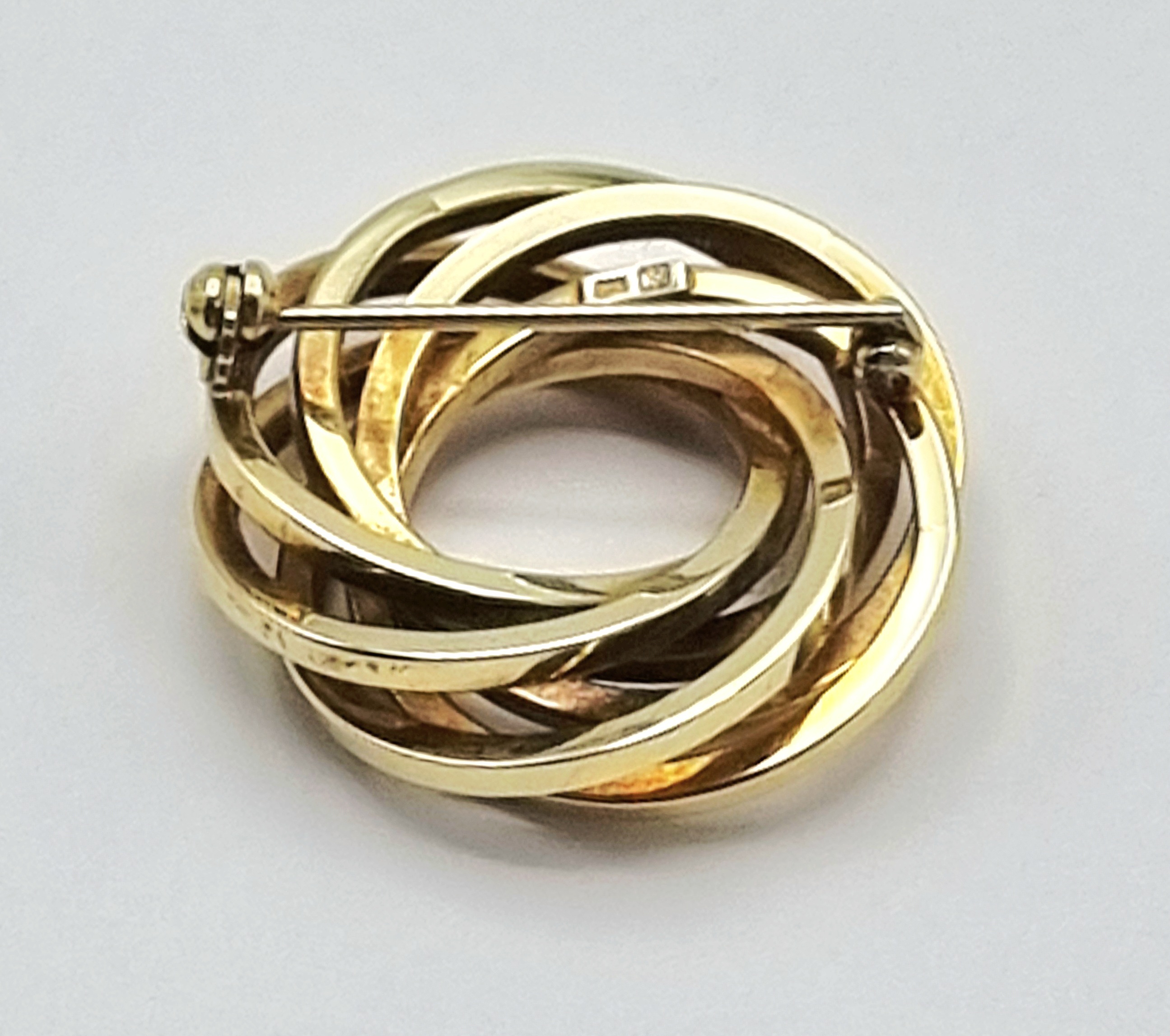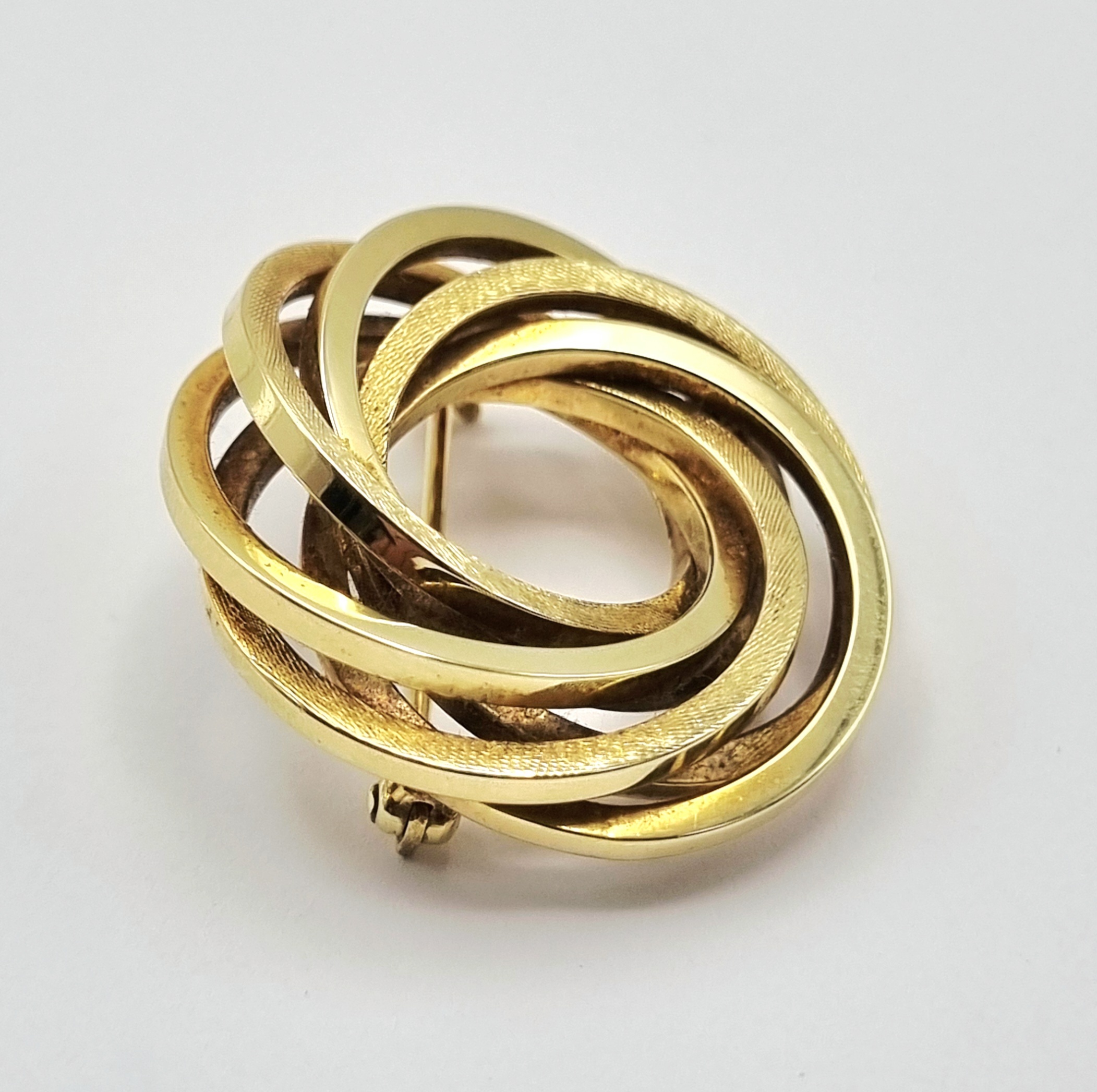 Broche uit omstreeks het midden van de 20e eeuw, uitgevoerd in 14 karaat goud, gemerkt 585 op de achterzijde. Bestaat uit vijf in elkaar vervlochten ovale ringen, met zowel gepolijste als getextureerde oppervlakken. Aan de achterzijde is een naaldsluiting aangebracht en het ontwerp toont kenmerkende sieradenvormgeving van deze periode. Voeg deze broche toe aan je verzameling en doe een bod! |