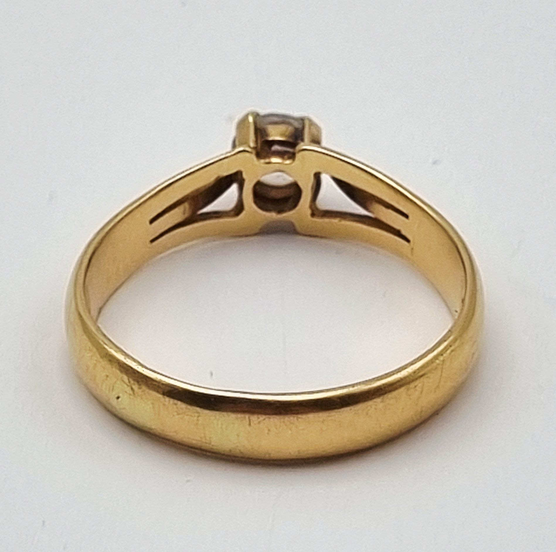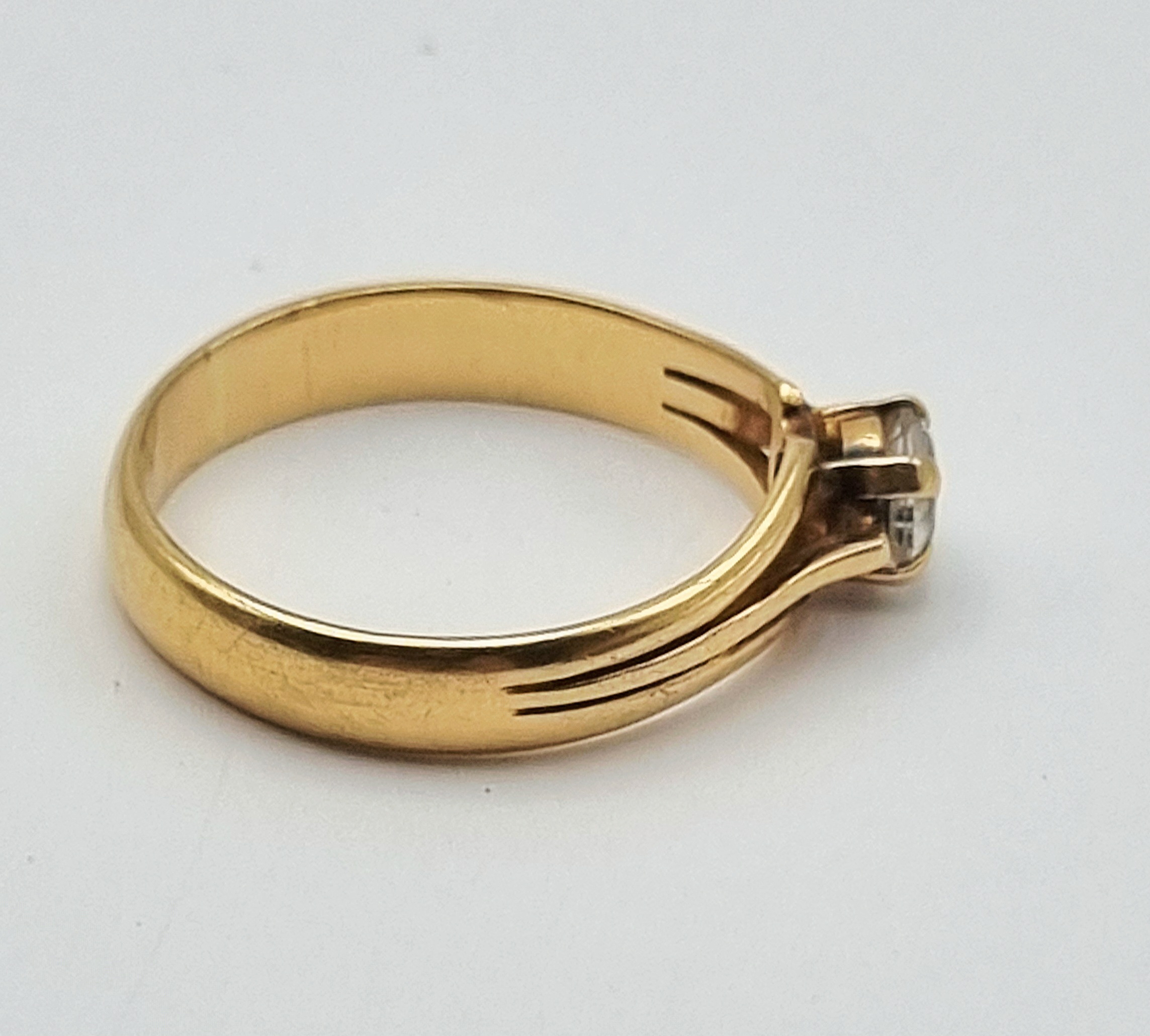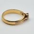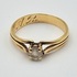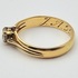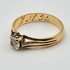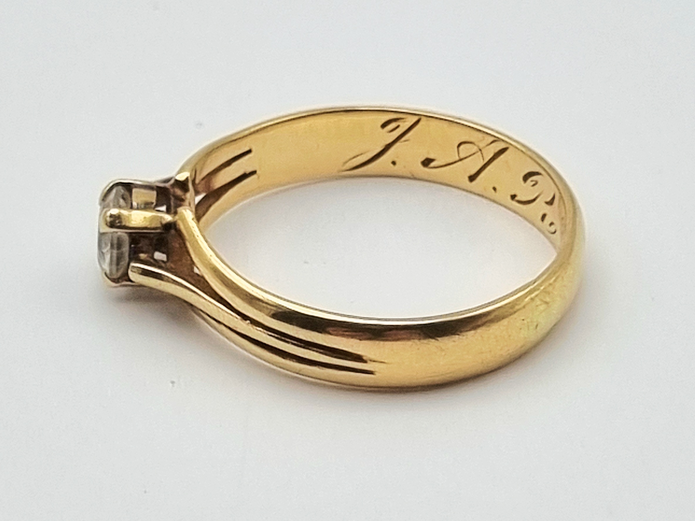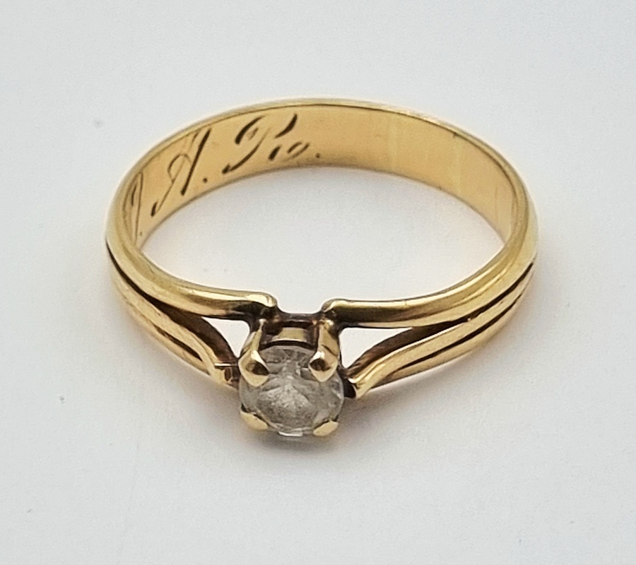 Een gouden ring uit omstreeks jaren 1950–1970, getoetst op 14 karaat, met een helder geslepen steentje in een vierpotige zetting. De ring heeft een brede aan de zijkant opengewerkte schacht, die taps toeloopt naar de onderkant. Aan de binnenzijde is een inscriptie gegraveerd met initialen 'J.A.B.' Wil je dit gouden ring in het echt bekijken? Kom naar de kijkdagen op 29, 30 en 31 augustus! |