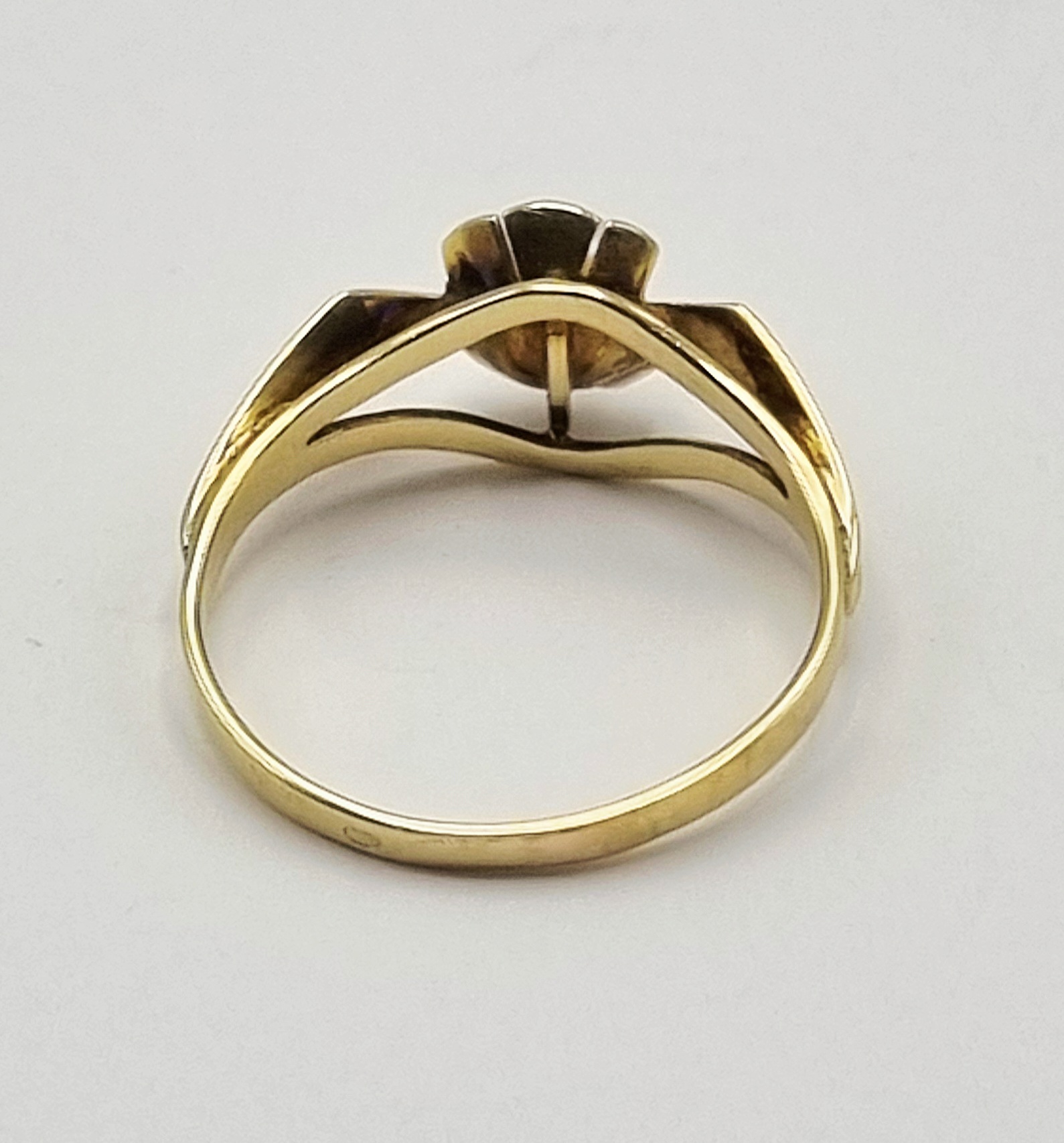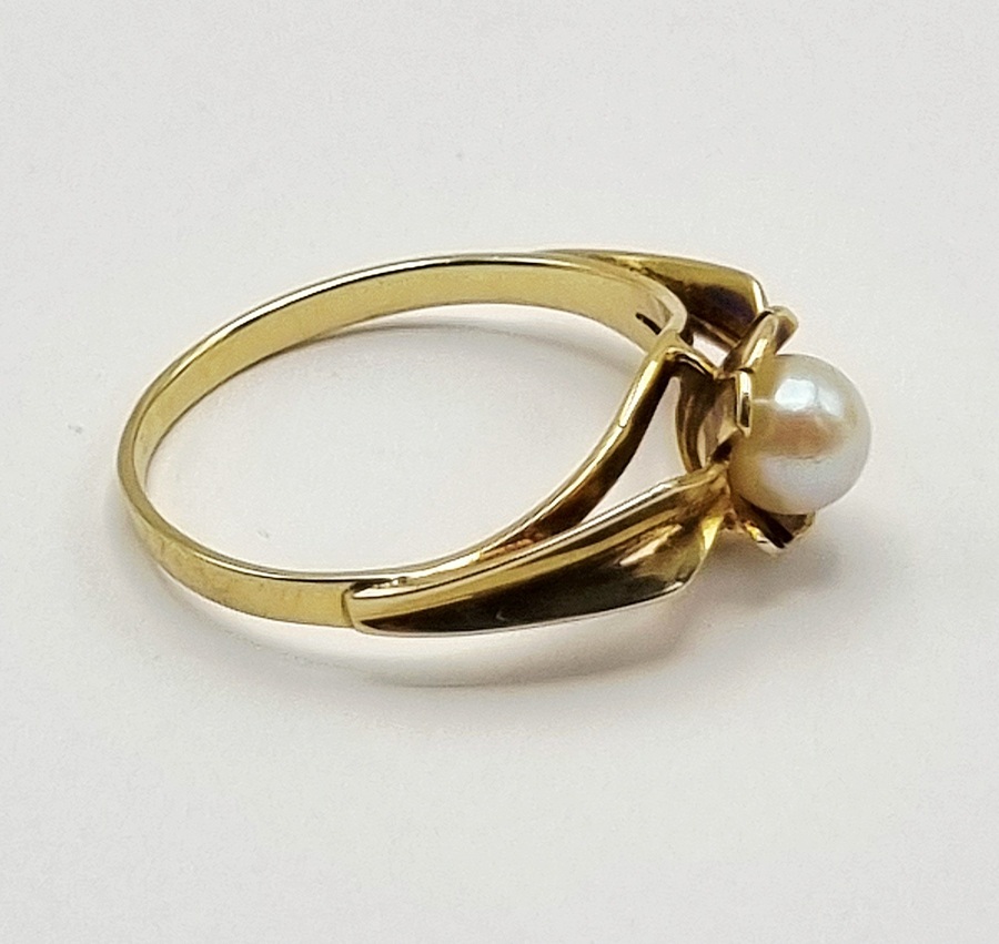 Gouden ring in modernistische stijl, uitgevoerd in 14 karaat geelgoud met bloemvormige zetting, circa jaren 1960. Voorzien van een centraal geplaatste witte cultivéparel. Binnenzijde gemerkt met Nederlands eikenblad 585 keurmerk. De vormgeving toont karakteristieke naoorlogse eenvoud met vloeiende lijnen en opengewerkte details. Geïnteresseerd? Bezoek onze kijkdagen op 29, 30 of 31 augustus van 11:00 tot 17:00 uur! |
