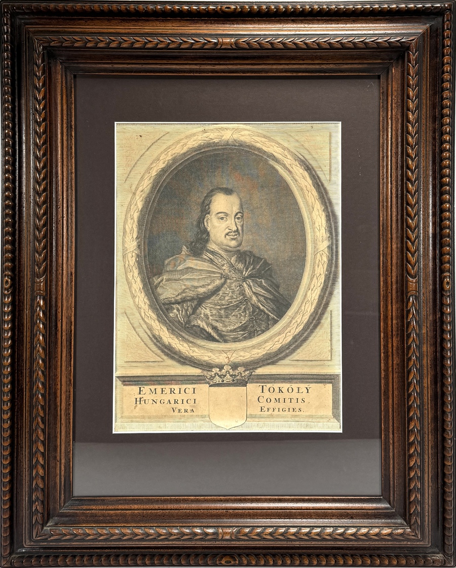 Gravure van Imre Thököly (1657–1705), uitgevoerd in barokke stijl, laat 17e eeuw tot begin 18e eeuw. Voorstelling van de Hongaarse edelman en legerleider in hofkledij, gevat in een ovale lauwerkrans en geplaatst boven een cartouche met kroon en leeg wapenschild. Uitgevoerd in kopergravure op papier, gemonteerd in een houten lijst met gesneden blad- en parelranddecoratie. Registreer nu en bied eenvoudig online mee op deze gravure! |