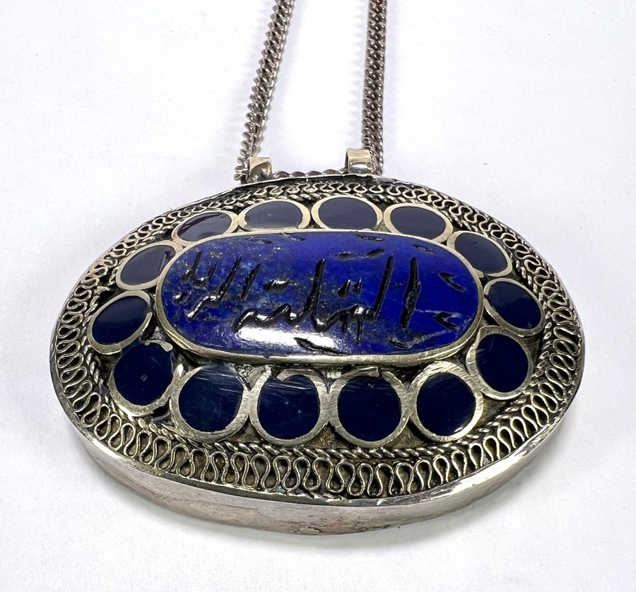Drie halskettingen: een ketting van oranjerode carneool, een ketting van donkergroene serpentijn en een halsketting met medaillon. De medaillon is vervaardigd van zilver met filigraan en lapis lazuli en heeft een inscriptie in Arabische letters. De halskettingen dateren uit de 2e helft van de 20e eeuw. Zeker zijn van deelname? Plaats vanaf 22 augustus een schriftelijk bod online! |