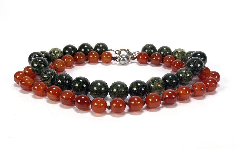 Halskettingen van carneool, serpentijn en lapis lazuli, 20e eeuw,