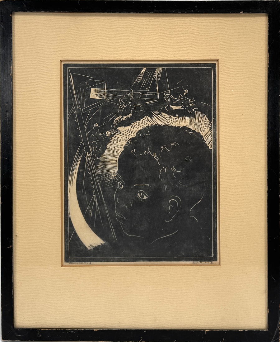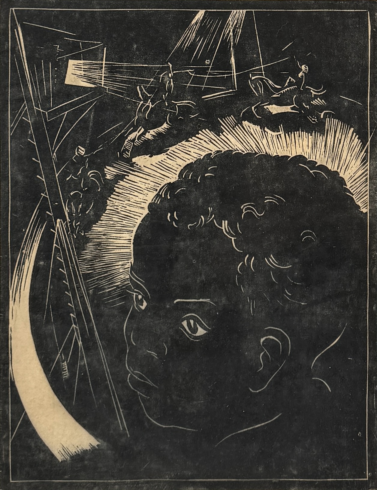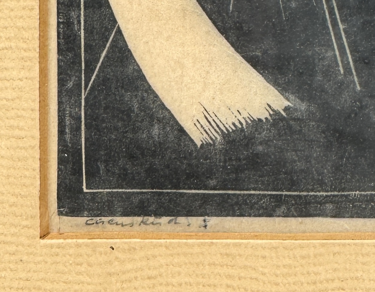 Expressionistische houtsnede uit 1931, getiteld "Circuskind". Zwarte inkt op papier, handgedrukt exemplaar, rechtsonder met potlood onduidelijk gesigneerd en gedateerd 1931. Voorstelling van een kinderportret met erboven draaiende paarden en scherpe lichtbanen, in strakke, modernistische lijnvoering. Wil je deze houtsnede in het echt bekijken? Kom naar de kijkdagen op 29, 30 en 31 augustus! |