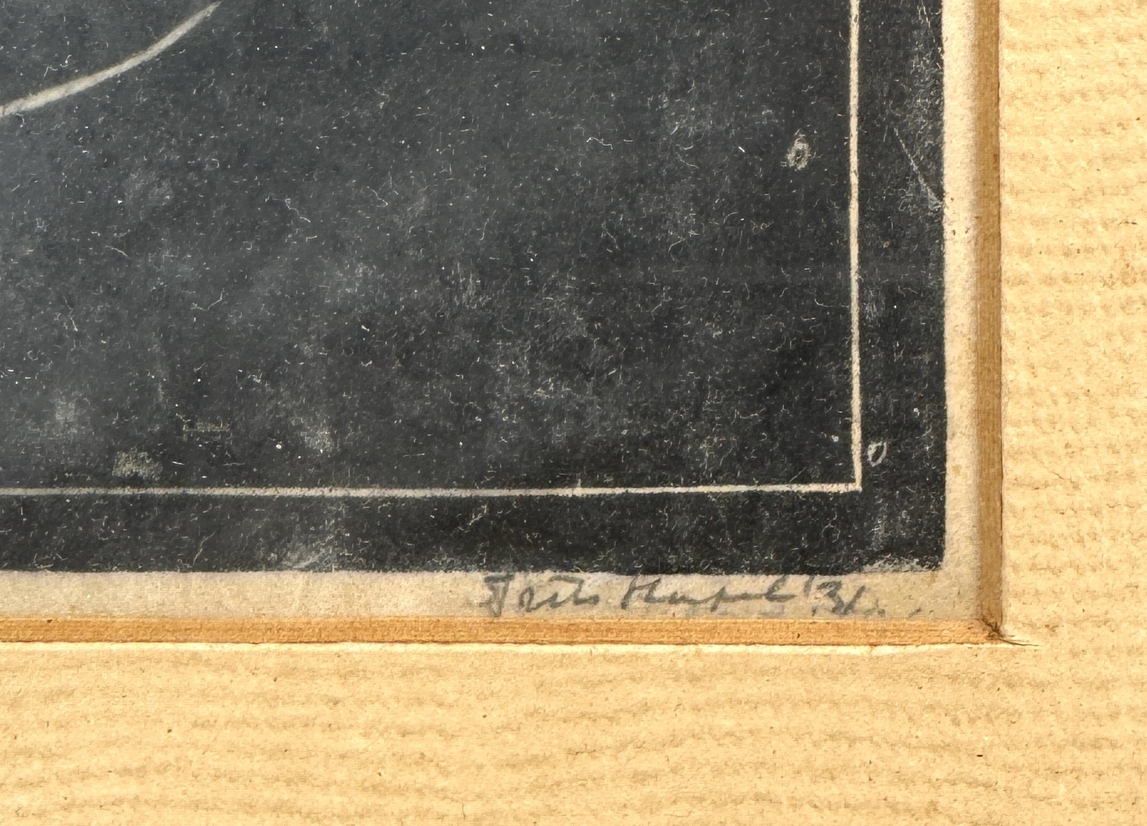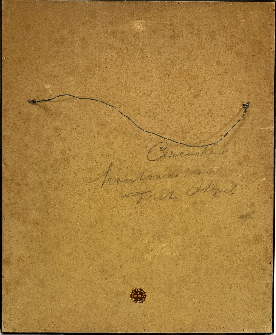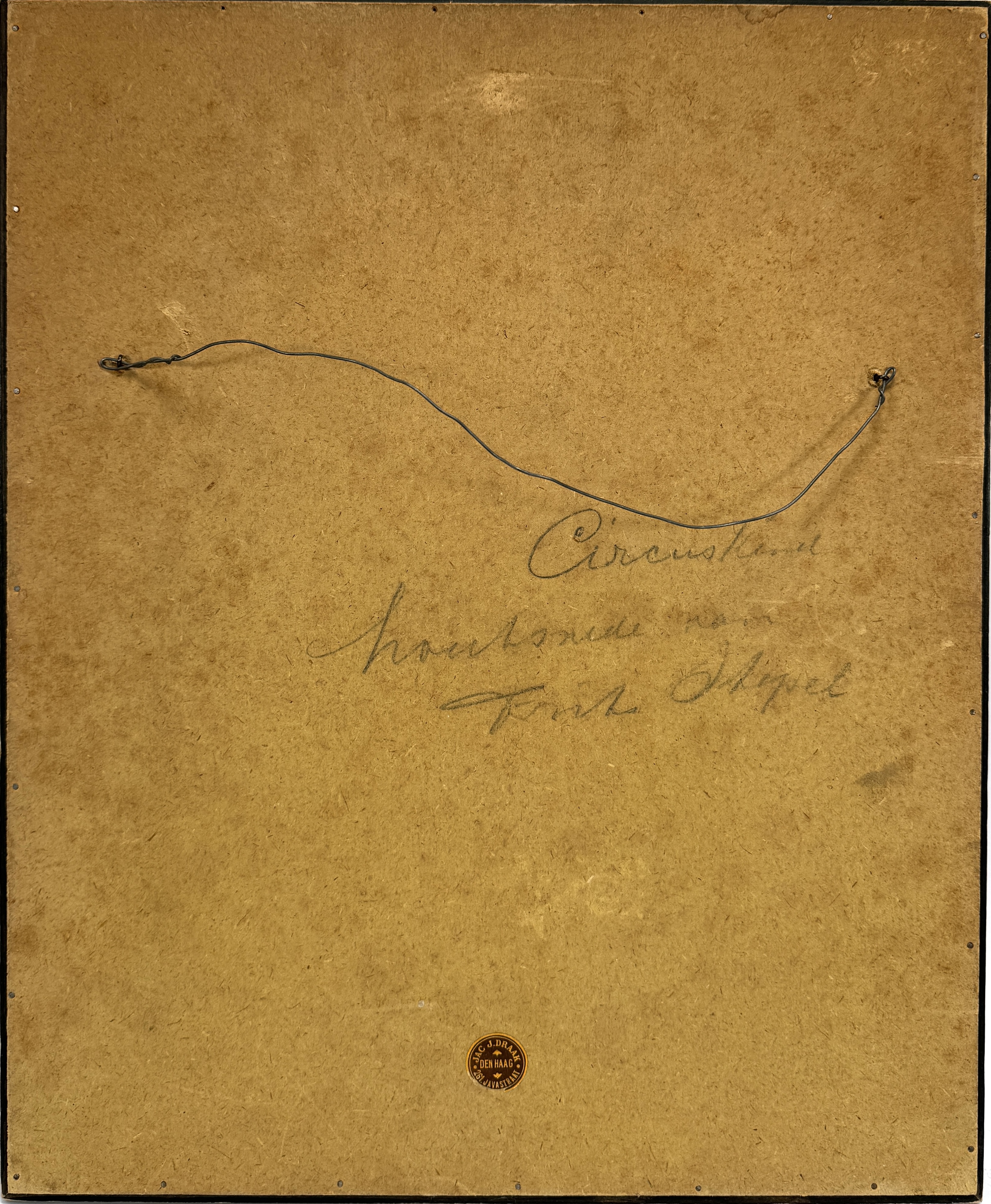 Expressionistische houtsnede uit 1931, getiteld "Circuskind". Zwarte inkt op papier, handgedrukt exemplaar, rechtsonder met potlood onduidelijk gesigneerd en gedateerd 1931. Voorstelling van een kinderportret met erboven draaiende paarden en scherpe lichtbanen, in strakke, modernistische lijnvoering. Wil je deze houtsnede in het echt bekijken? Kom naar de kijkdagen op 29, 30 en 31 augustus! |