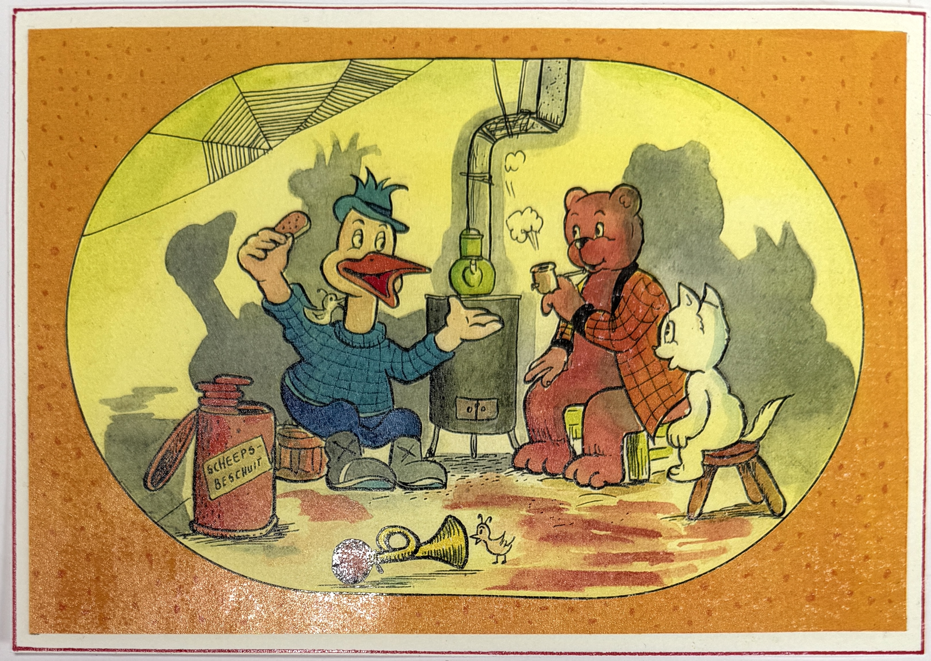 Prent in de stijl van Marten Toonder (1912–2005), omstreeks eind 20e eeuw. De voorstelling toont Olie B. Bommel, Tom Poes en Wammes Waggel rond een kachel in een huiselijke setting, met details als een blik “Scheepsbeschuit” en een trompet. De stijl is verhalend en humoristisch, typerend voor Toonders stripwerk. Achterzijde voorzien van beschermend vel papier. Voeg deze illustratie toe aan je verzameling en doe een bod! |