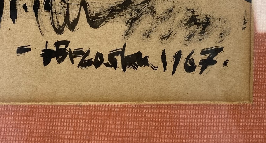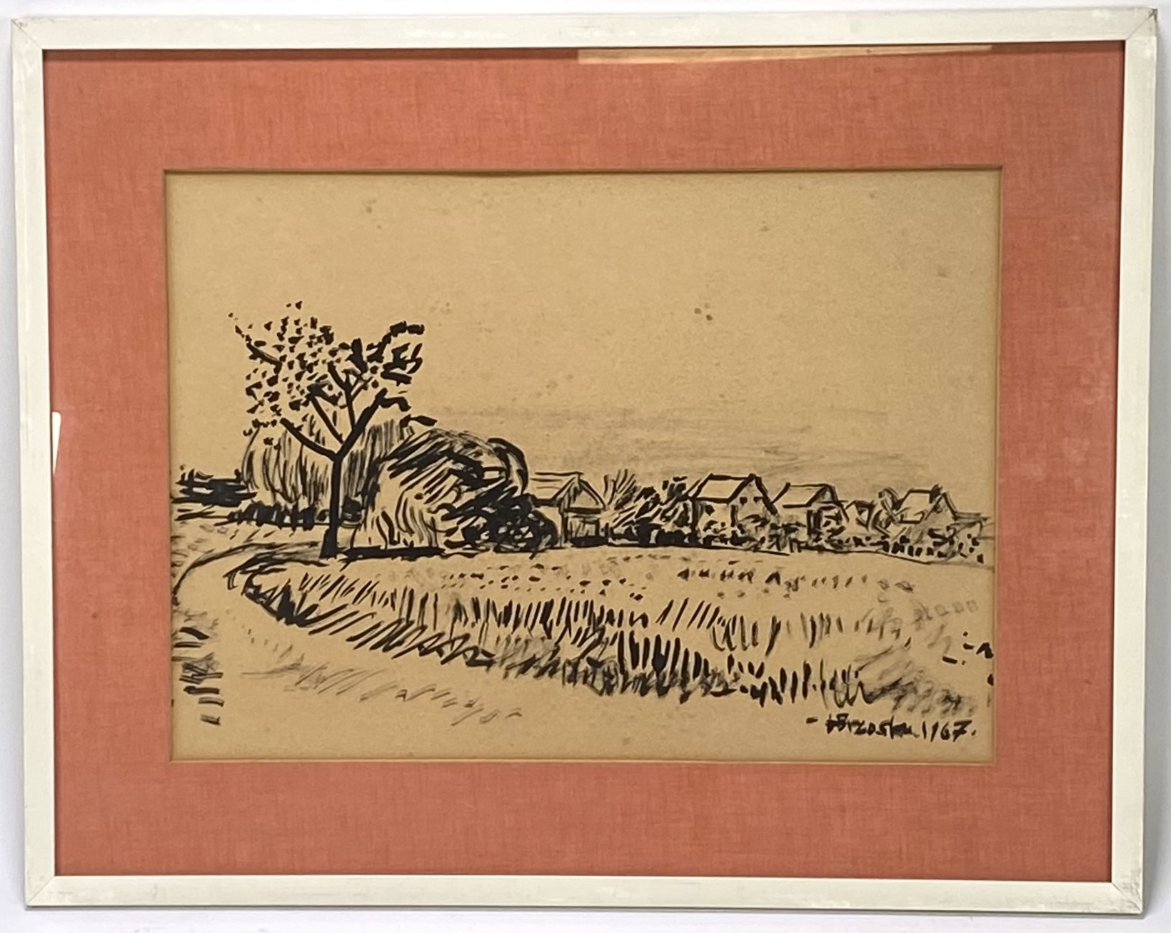 Inkttekening op papier, 1967, uitgevoerd in een schetsmatige en expressieve stijl met vloeiende lijnvoering. De voorstelling toont een landelijke weg met bomen en een rij boerderijen in de verte. Rechtsonder onduidelijk gesigneerd en gedateerd. Wil je deze inkttekening in het echt bekijken? Kom naar de kijkdagen op 29, 30 en 31 augustus! |
