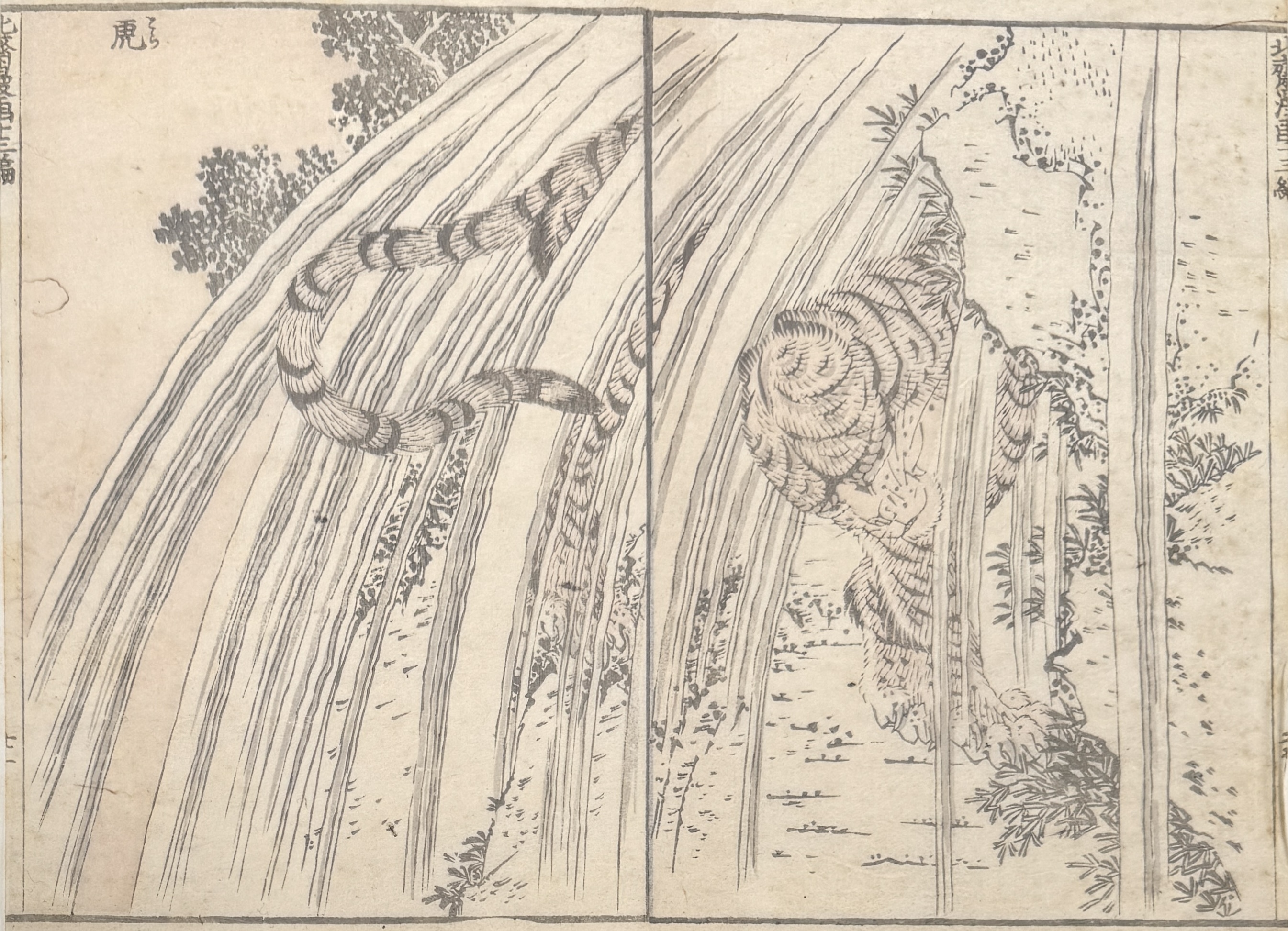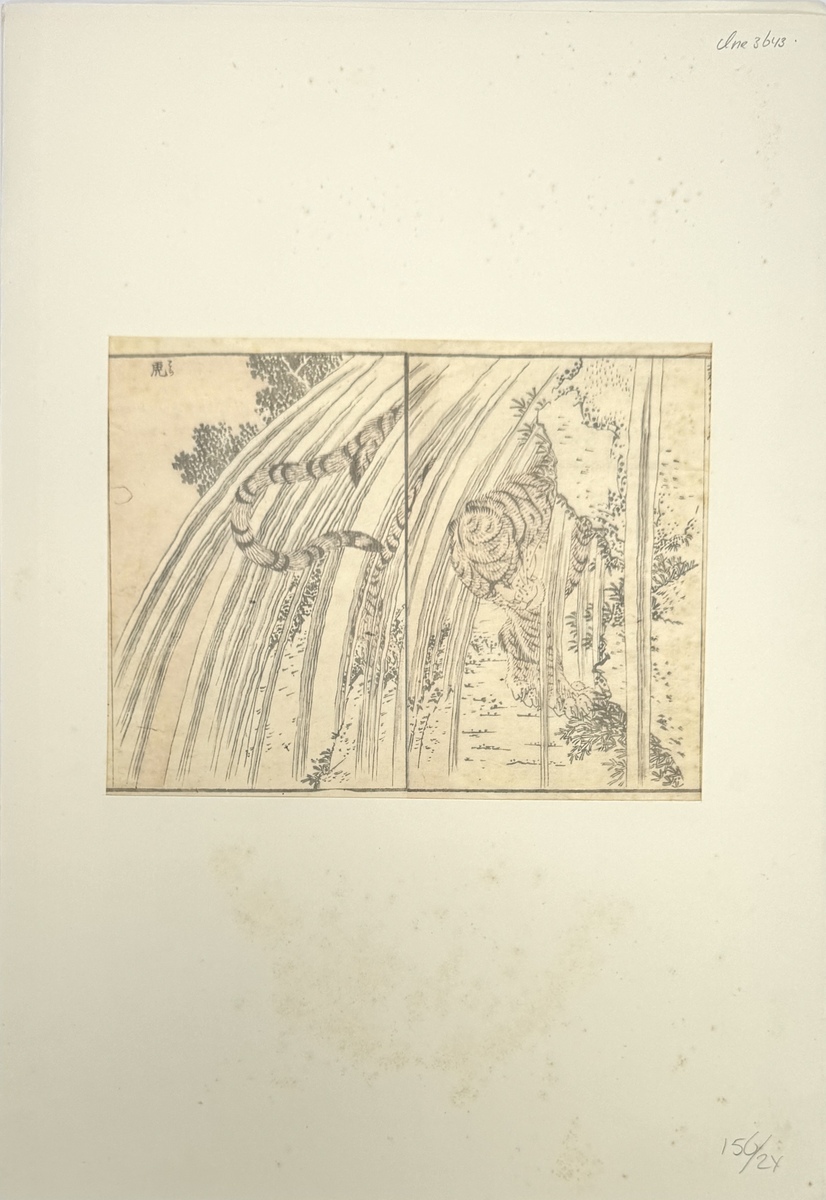 Japanse ukiyo-e houtblokdruk, dubbel blad uit een schetsboek, toegeschreven aan Katsushika Hokusai (1760–1849). Datering: 19e eeuw, Edo-periode. Materiaal: washi (kozo) met zwarte inkt. Techniek: monochrome boekillustratie (ehon). Afbeelding van een tijger die schuilgaat achter stromende waterlijnen, met zichtbare middenvouw en kaderrand. Betreft een Manga-blad. Klaar om te bieden? Registreer je nu en doe mee aan de veiling! |