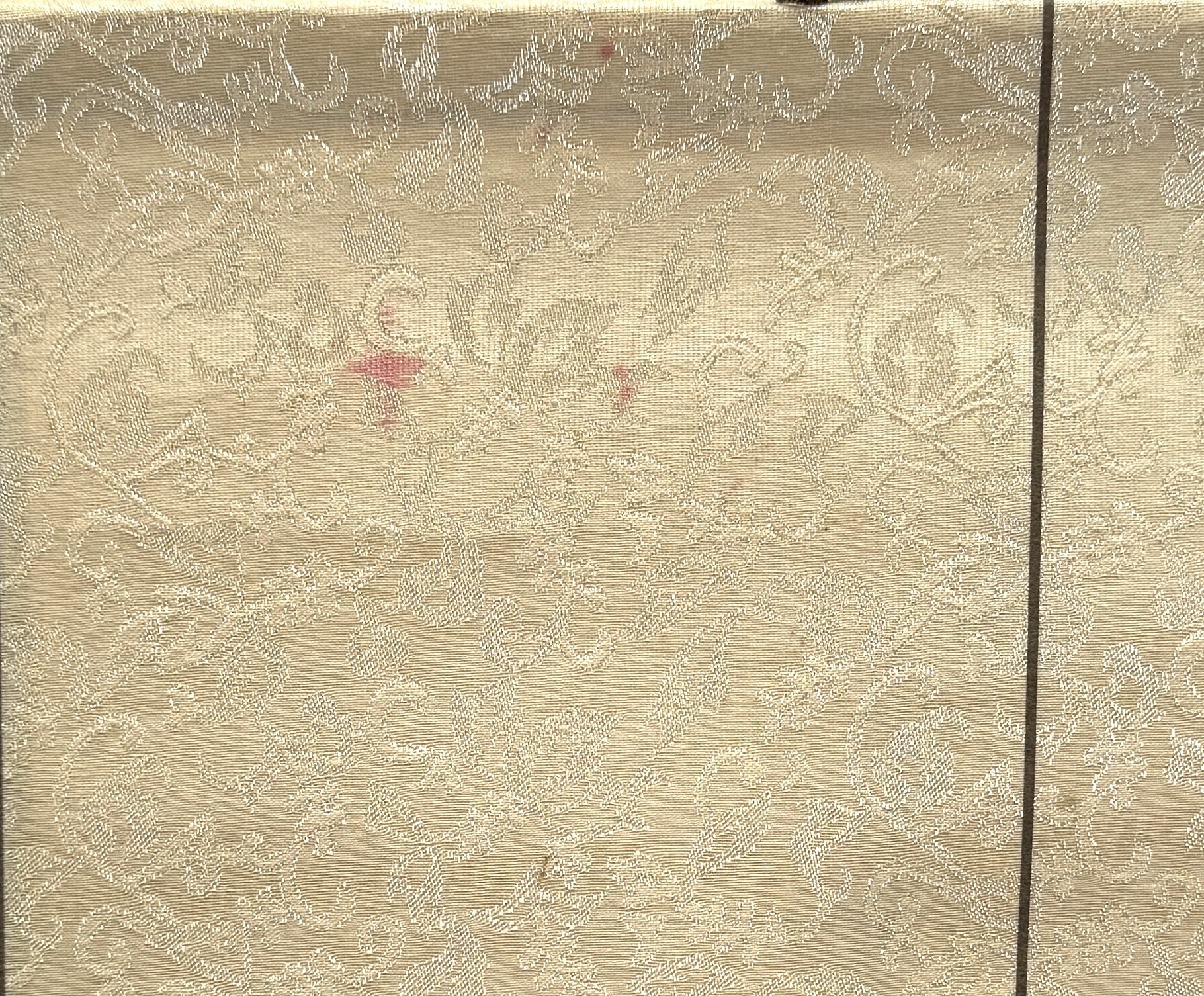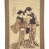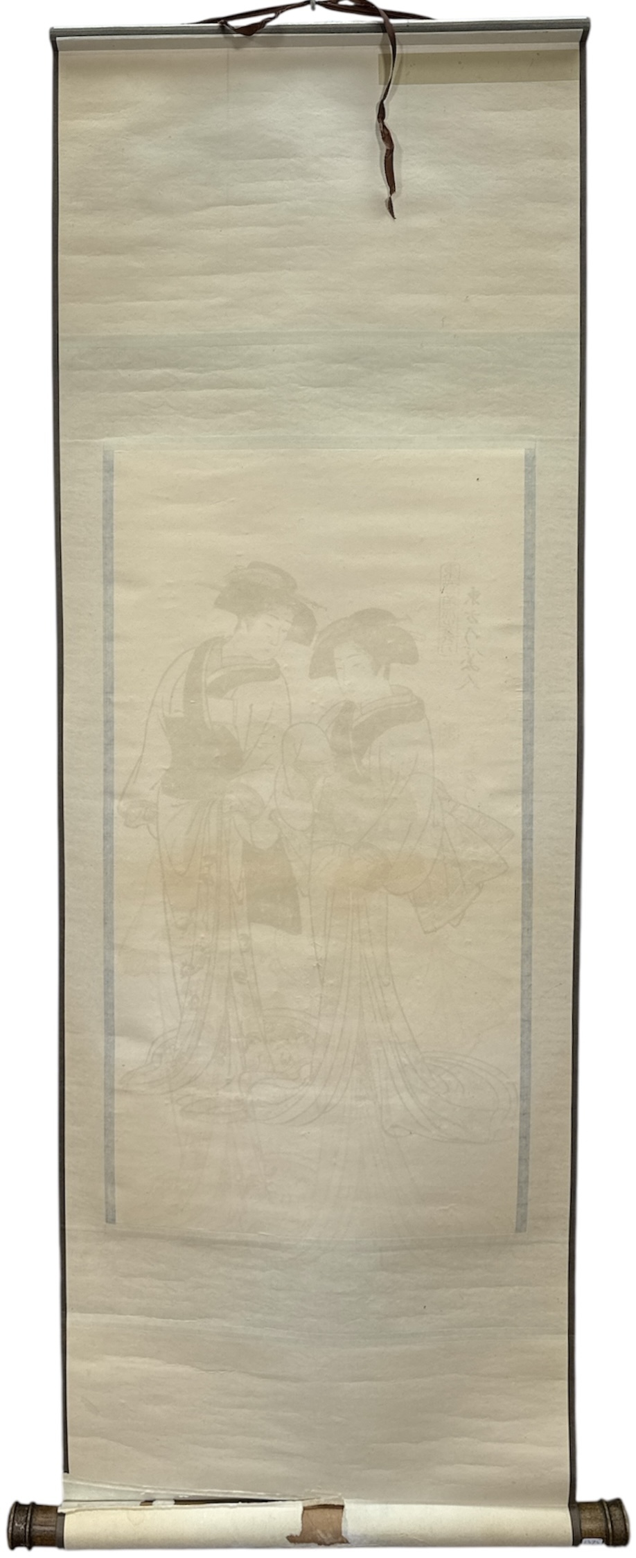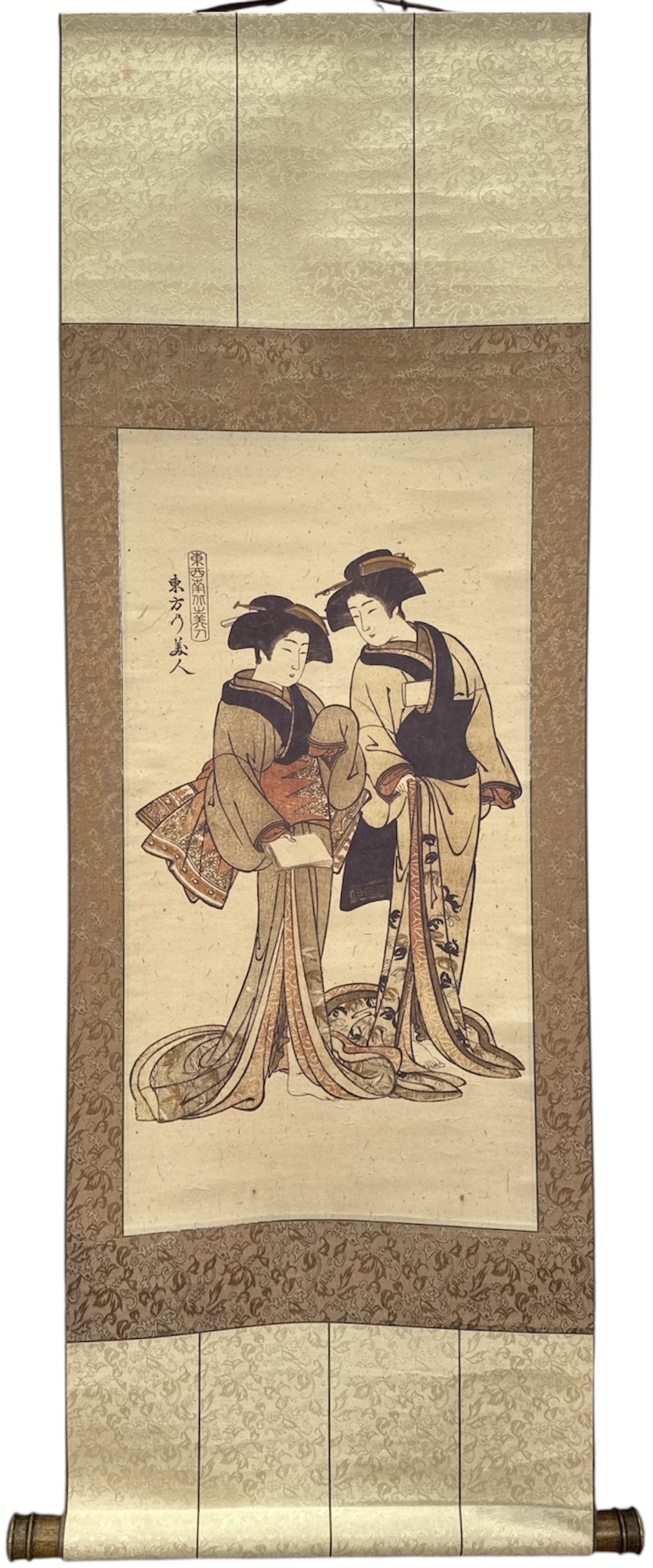 Japanse wanddecoratie in ukiyo-e bijin-ga stijl, omstreeks midden twintigste eeuw. Kleurenhoutsnede op papier, gemonteerd als kakejiku met zijden brokaat en houten roluiteinden. Voorstelling van twee staande vrouwen in kimono met lange slepen; links een cartouche met Japanse tekens. Traditionele presentatie voor interieurdecoratie en seizoenswisseling. Kenmerkend zijn de sobere aardetinten, sierlijke lijnen en het geweven bloemmotief van het brokaat. Wil je direct deelnemen? Plaats vanaf 22 augustus alvast een schriftelijk bod via onze website! |