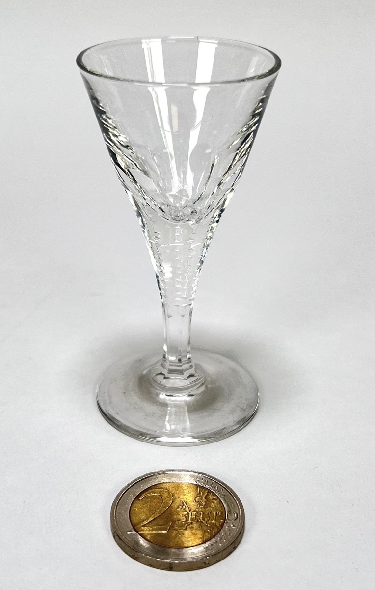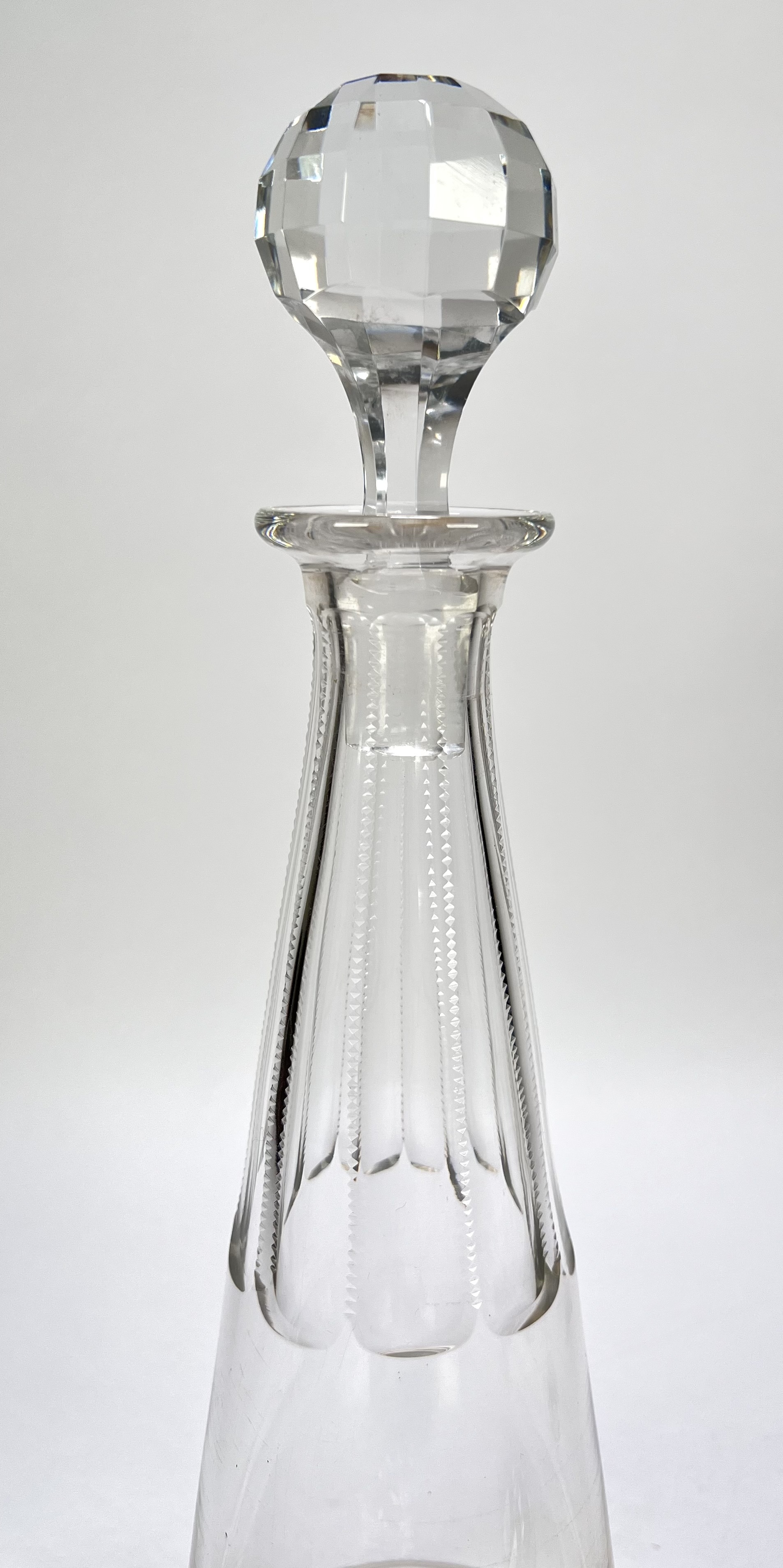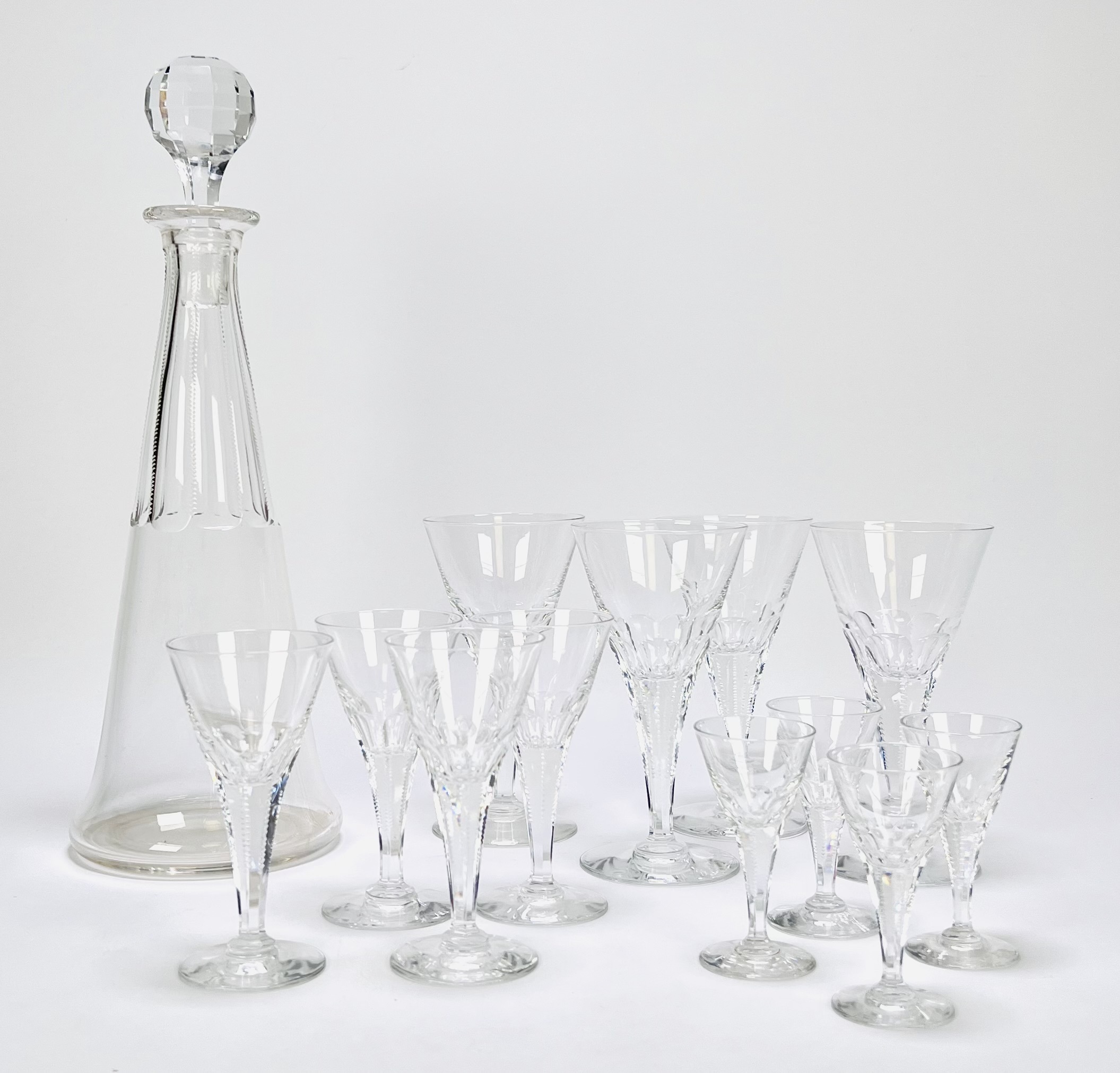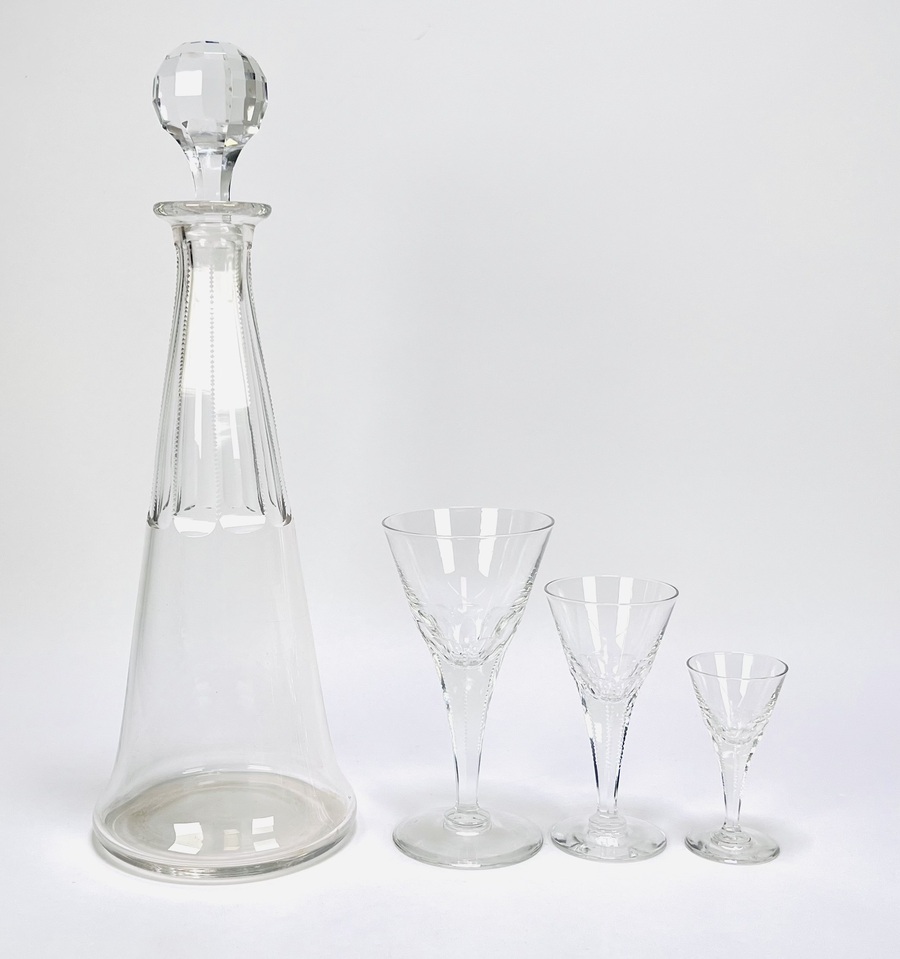 Kristallen karaf met geslepen stop en bijpassende set glazen, Europa, midden 20e eeuw. Het glaswerk is mondgeblazen en handgeslepen met decoratieve facetten langs kelk en stop. De karaf is taps toelopend en de glazen zijn in drie formaten voor wijn, dessertwijn en likeur. Wil je direct deelnemen? Plaats vanaf 22 augustus alvast een schriftelijk bod via onze website! |