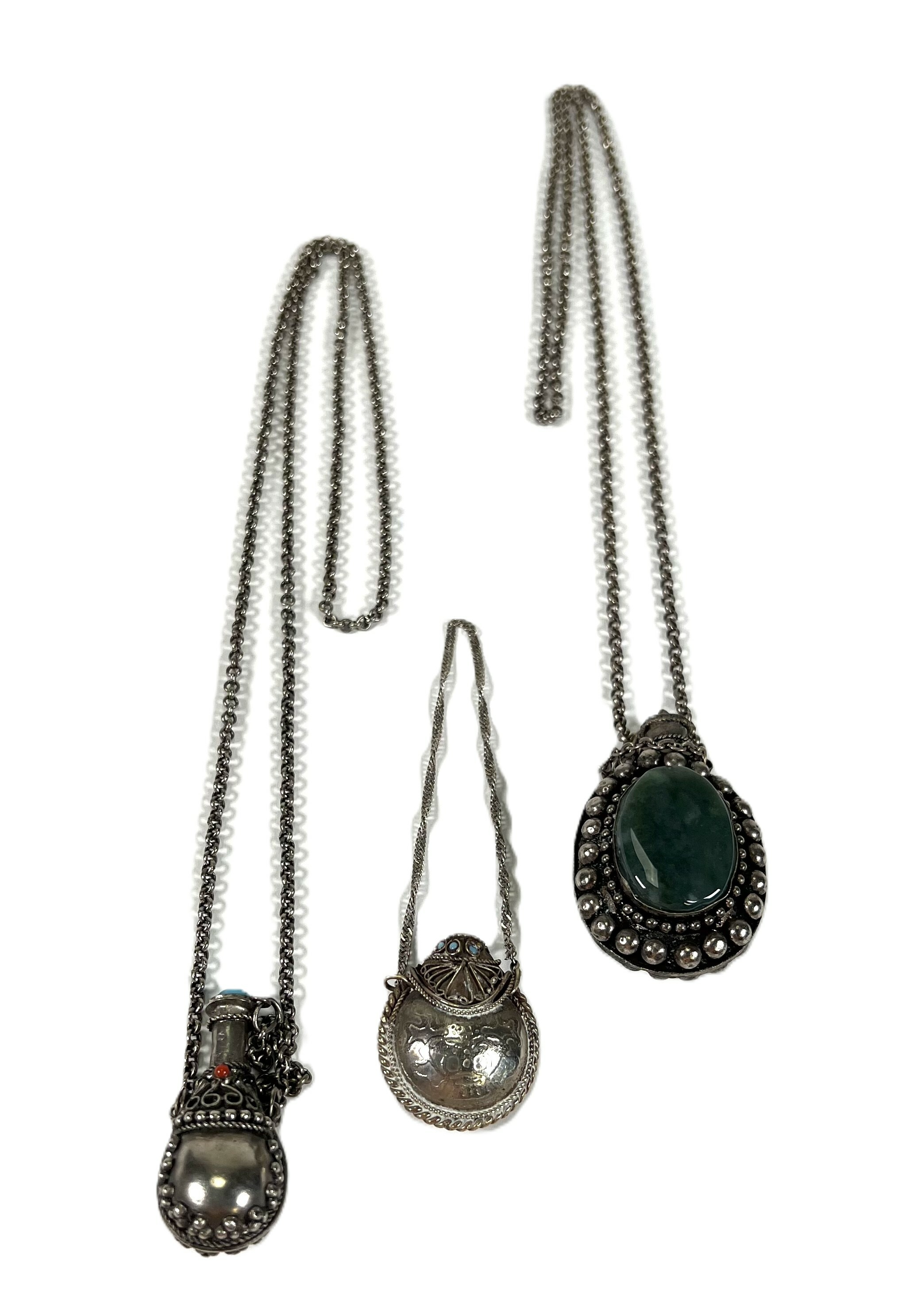 De flacons zijn verzilverd uitgevoerd met bolvormige en gegraveerde decoraties en deels ingelegd met halfedelstenen, waaronder cabochon geslepen groene en turquoise stenen. Elk exemplaar is voorzien van een scharnierend of los dopje en bevestigd aan een ketting. Deze draagbare amuletten werden traditioneel gebruikt om kruiden, parfums of rituele substanties in te bewaren. Vermoedelijk Tibet of Nepal, 20e eeuw. Wil je deze amuletflacons in het echt bekijken? Kom naar de kijkdagen op 29, 30 en 31 augustus! |