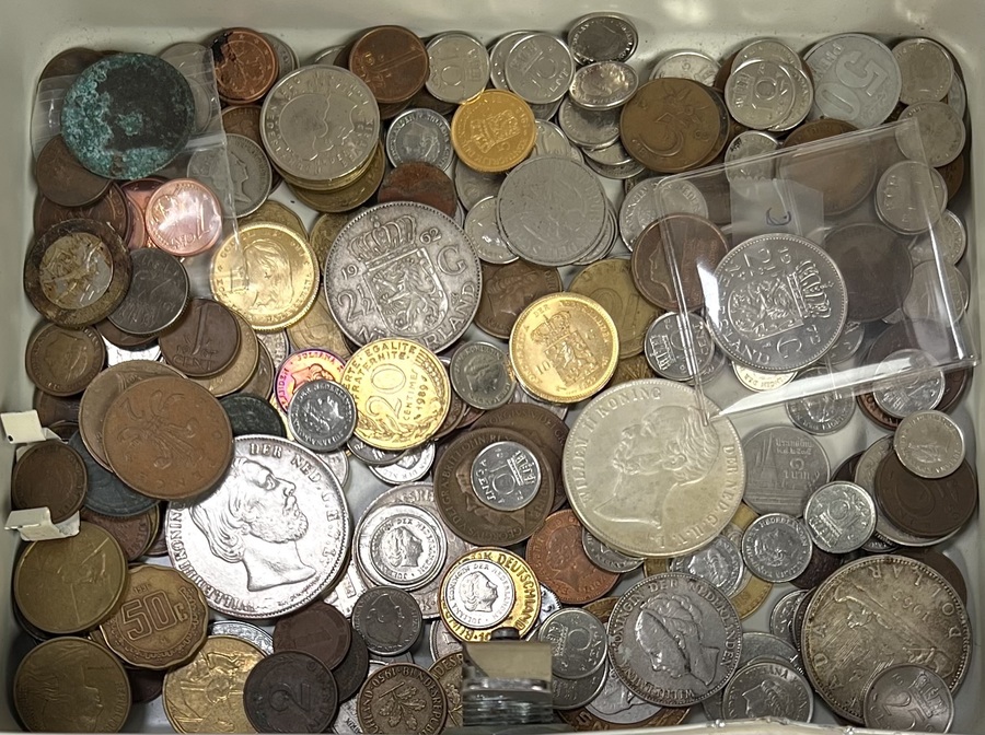 Verzameling muntgeld in kistje, diverse landen, 20e eeuw