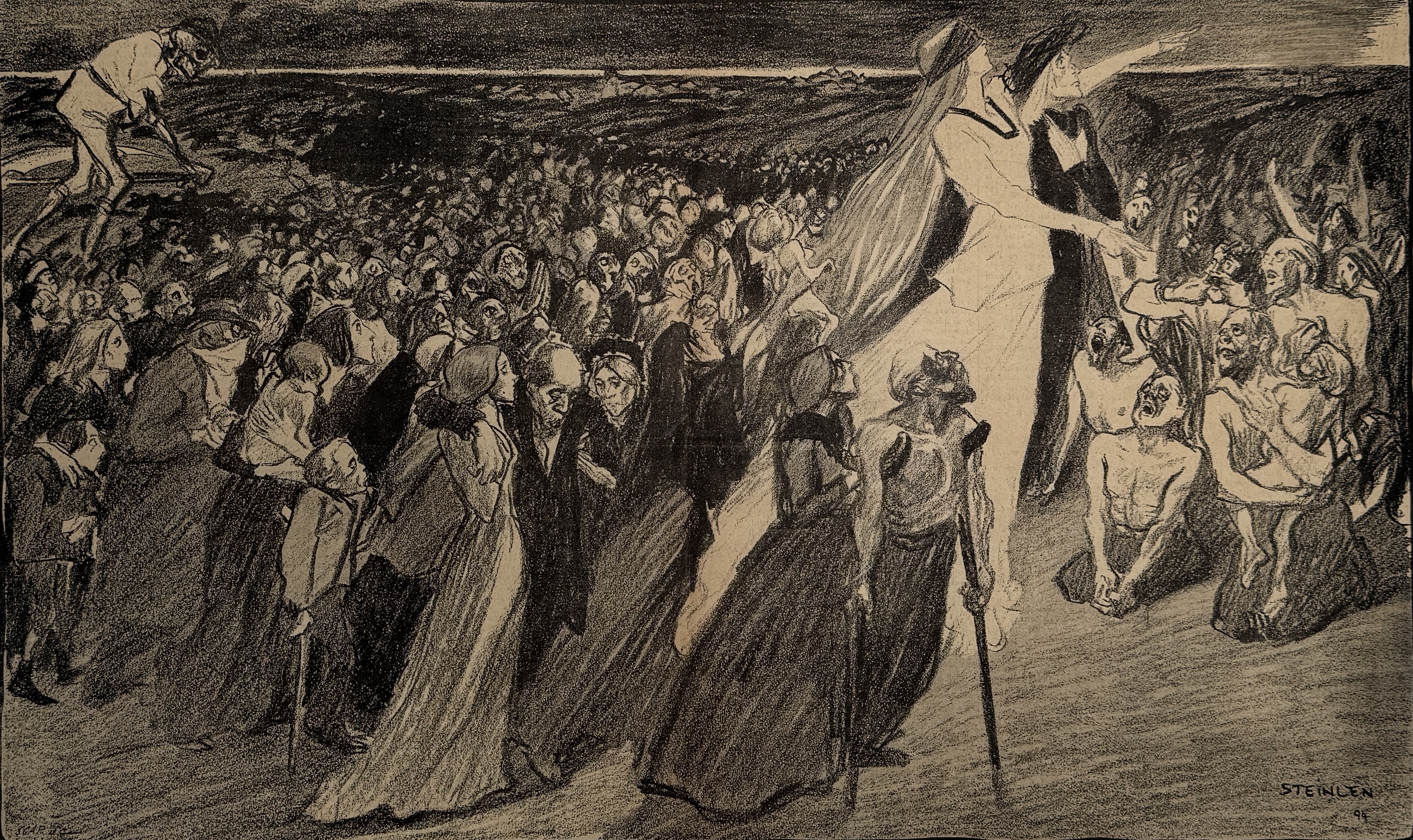 Lithografie van Théophile Alexandre Steinlen (1859–1923), Lourdes, allégorie de Steinlen, 1894, op papier. Uitgevoerd in expressieve, sociaal-realistische stijl met symbolistische elementen. Voorstelling toont een massa pelgrims en zieken rond allegorische figuren, met een grafdelver op de achtergrond. Rechts onderaan in de plaat gesigneerd en gedateerd "STEINLEN 94". De prent combineert maatschappijkritiek met religieuze beeldsymboliek, uit de Gil Blas illustrious Registreer nu en bied eenvoudig online mee op dit object! |