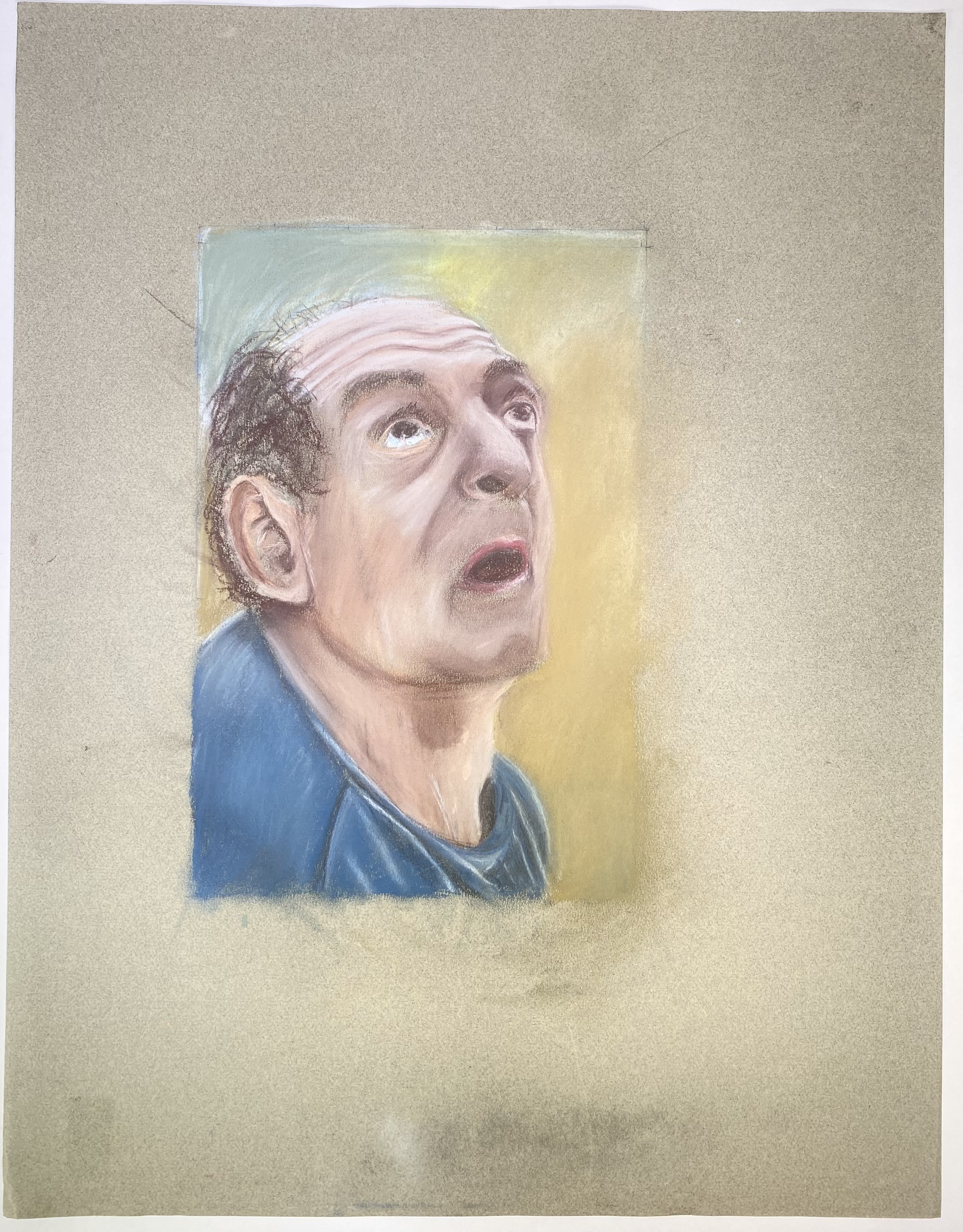 Krijttekening op papier, uitgevoerd in realistische stijl, omstreeks eind 20e eeuw. De voorstelling toont een oudere man in driekwart profiel met blauwe kleding, de blik omhoog gericht en de mond geopend. De achtergrond bestaat uit zachte kleurvlakken in groen en geel die het gezicht accentueren. Verso informatie. Zeker zijn van deelname? Plaats vanaf 22 augustus een schriftelijk bod online! |