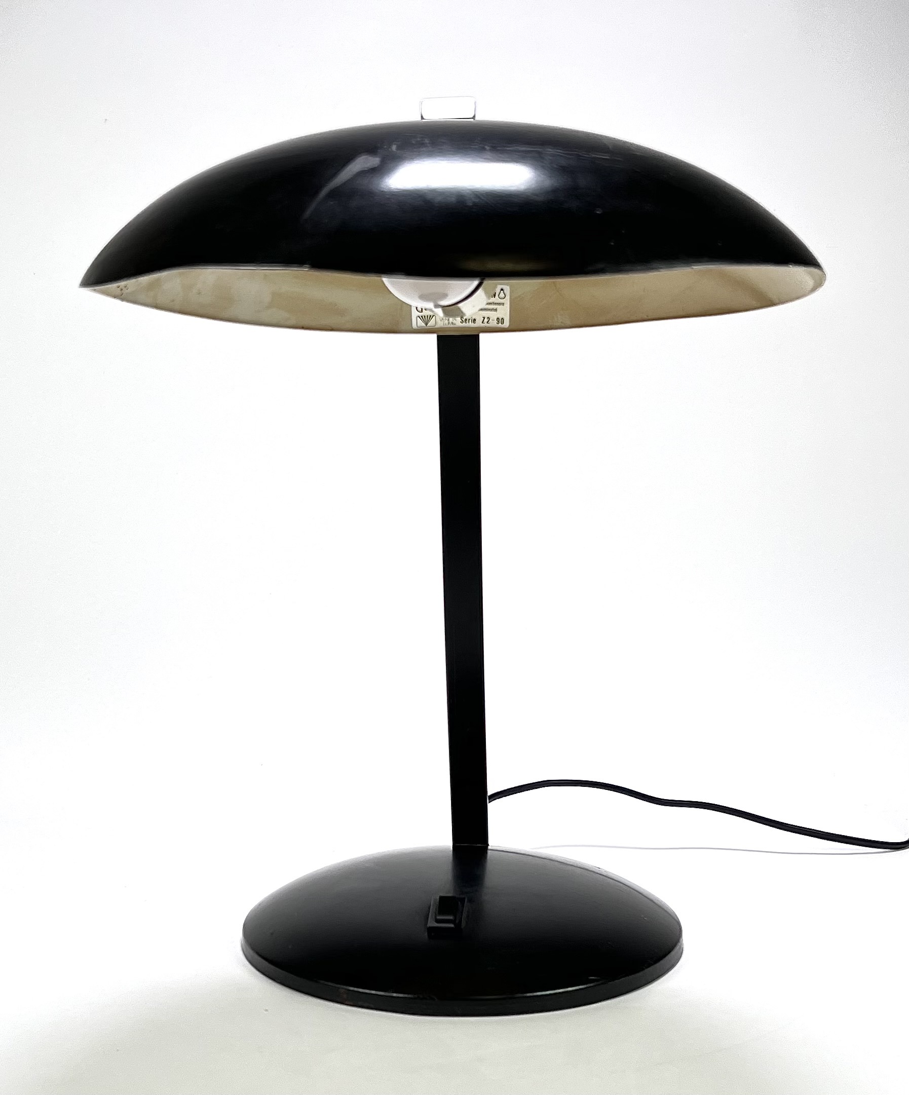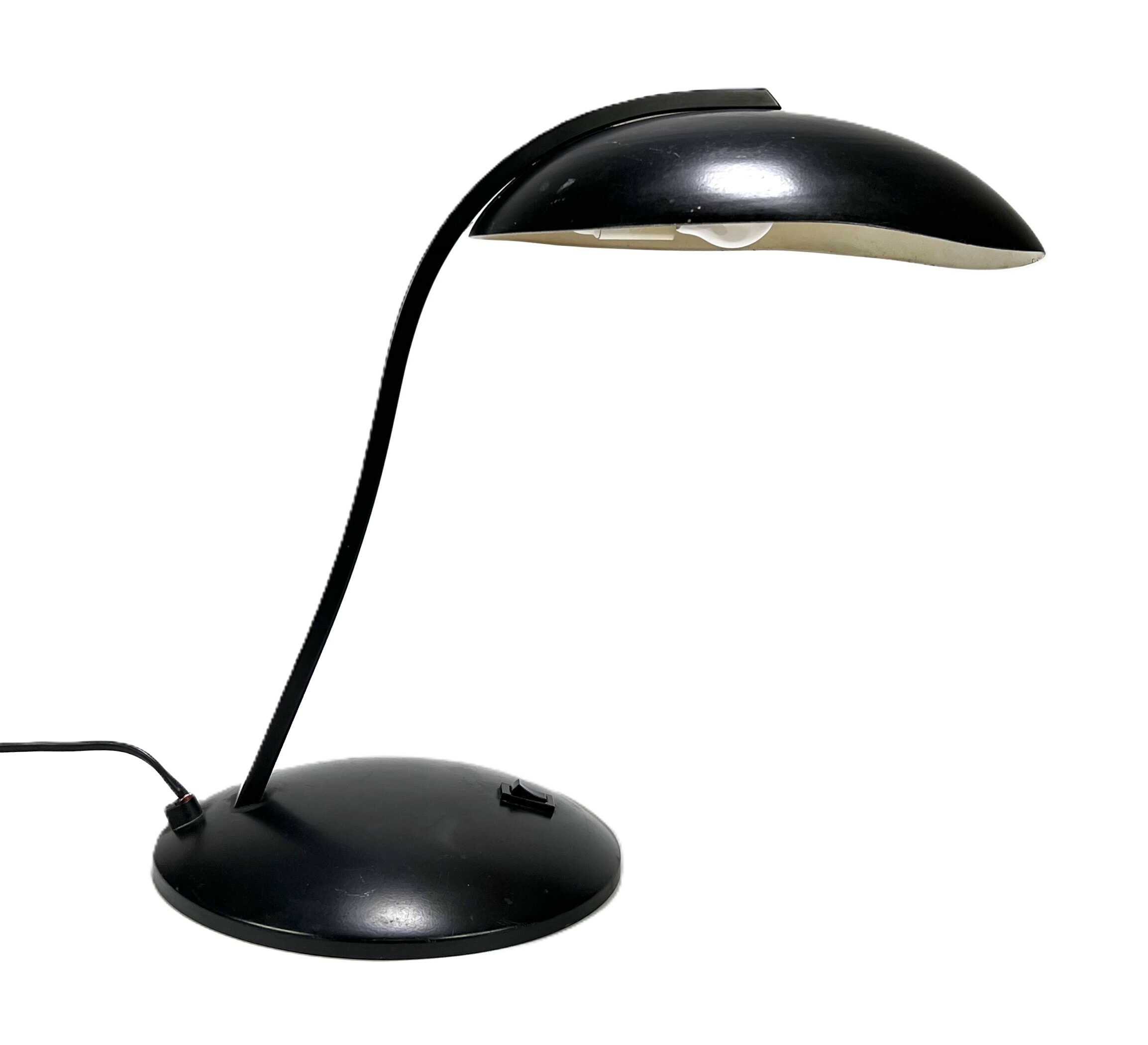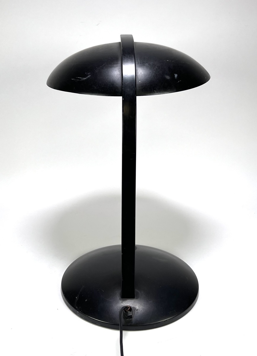 Zwarte metalen Italiaanse bureaulamp van Nuova Veneta Lumi, onderzijde gemerkt, jaren tachtig. De lamp heeft een modernistische vormgeving met brede halfcirkelvormige kap, ronde voet met geïntegreerde schakelaar en slanke gebogen staander. Vervaardigd in gelakt metaal met industriële techniek. Deze bureaulamp zelf beoordelen? Je bent welkom op onze kijkdagen op 29, 30 en 31 augustus! |