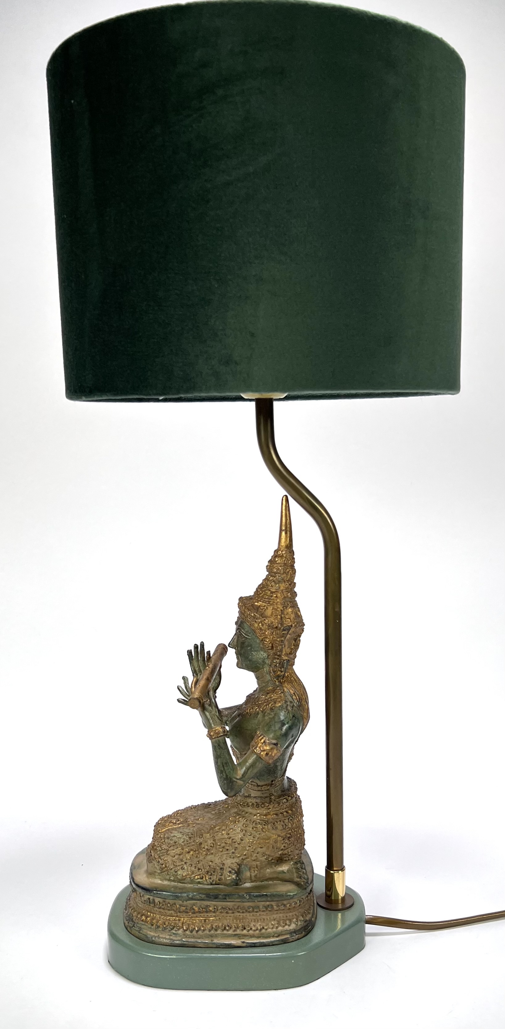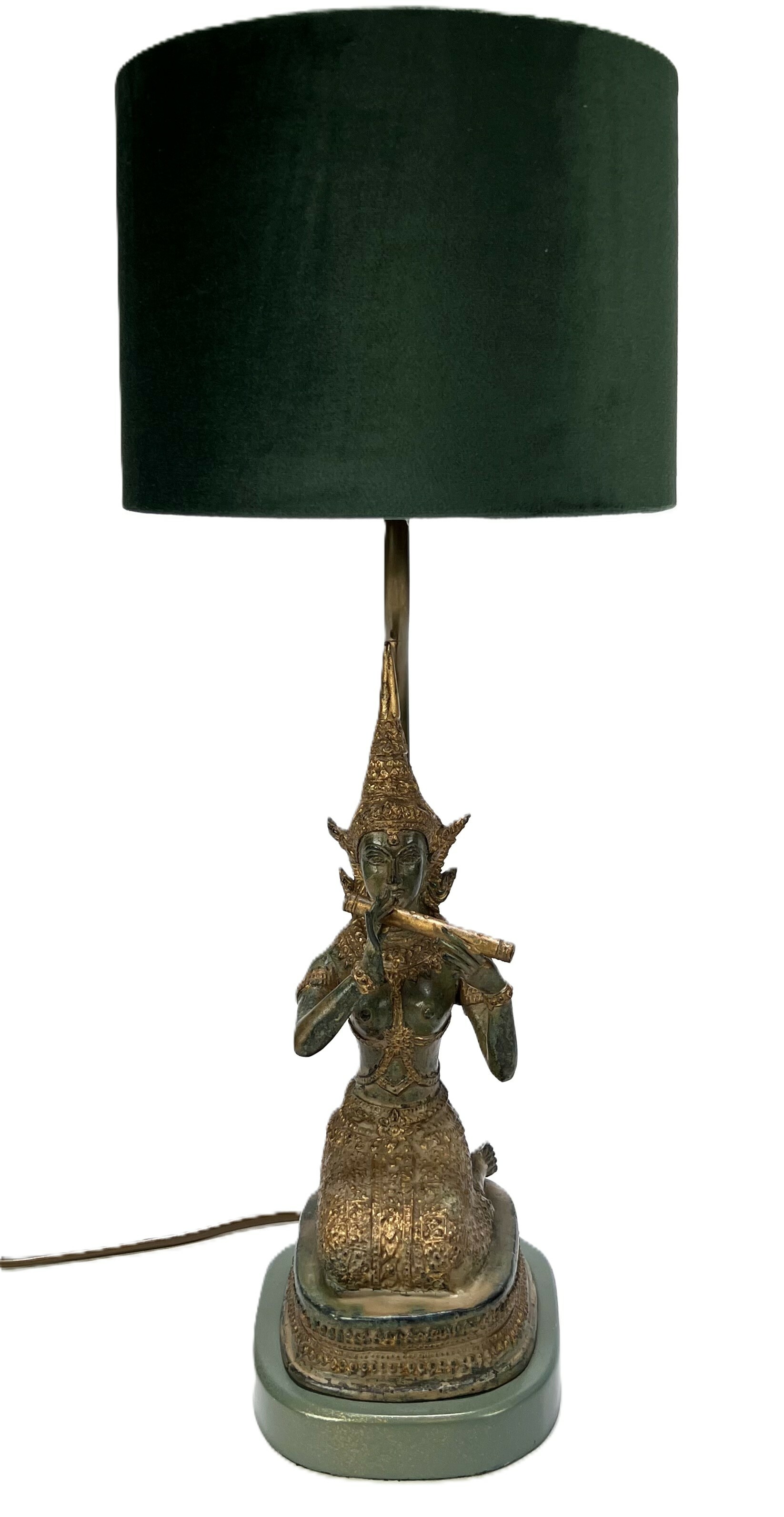 Tafellamp in Thaise Rattanakosin stijl, omstreeks 1950–1970. Sculpturale voet van gegoten, deels brons met groen patina, voorstellend een knielende muzikant met chada-kroon en fluit. Messing lichtarm en fitting, op gelakte voet; trommelvormige, donkergroene textiele kap. Wil je direct deelnemen? Plaats vanaf 22 augustus alvast een schriftelijk bod via onze website! |