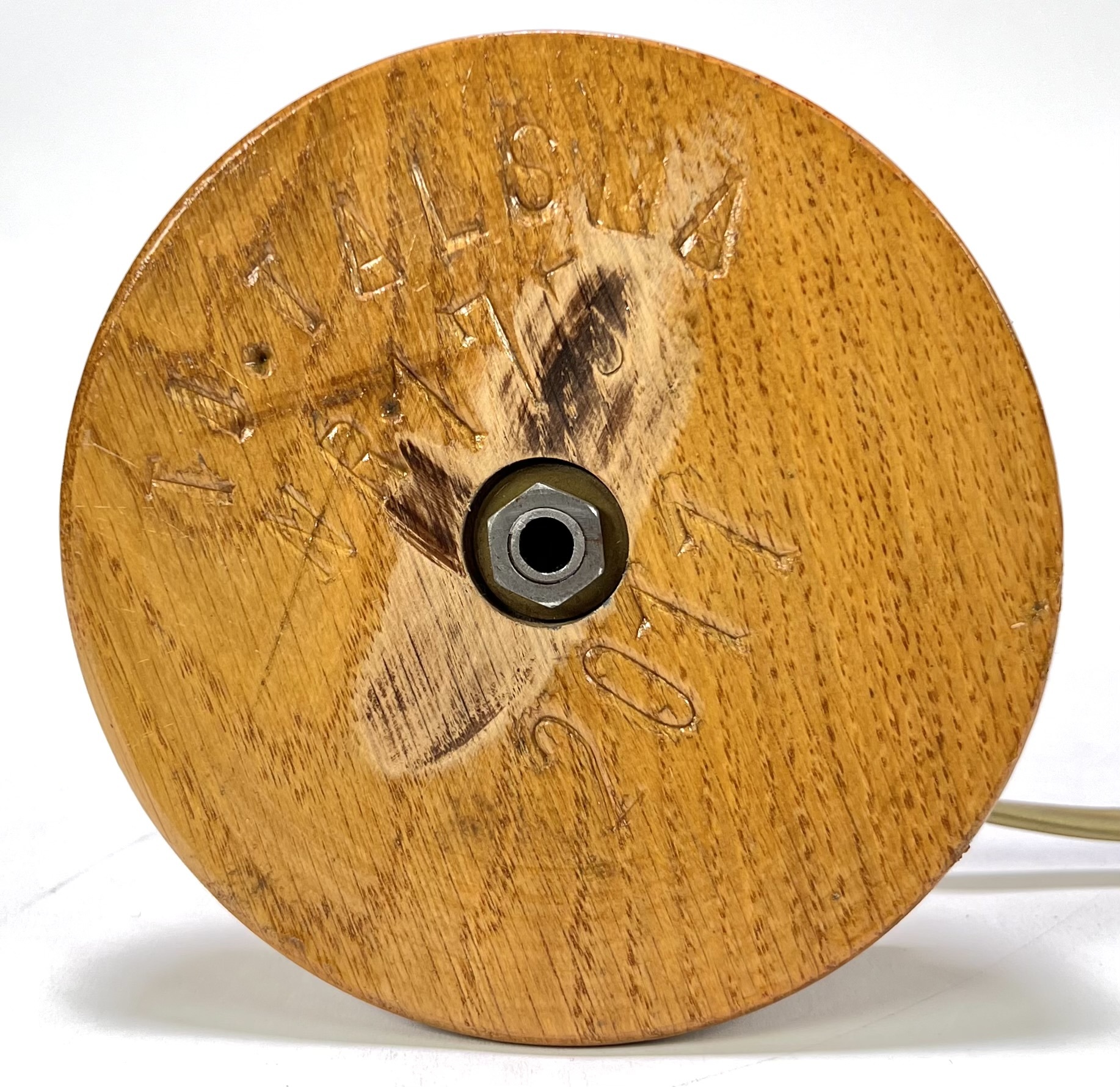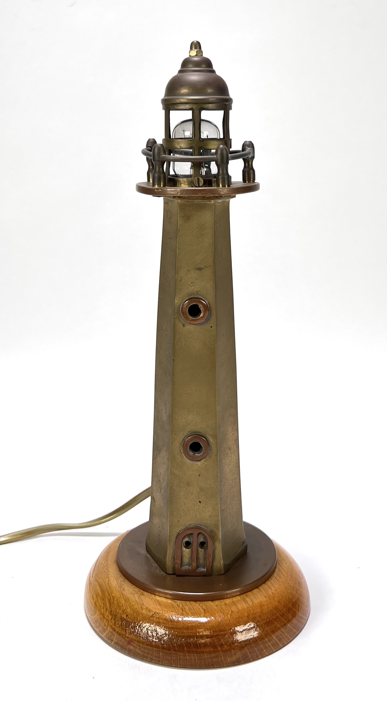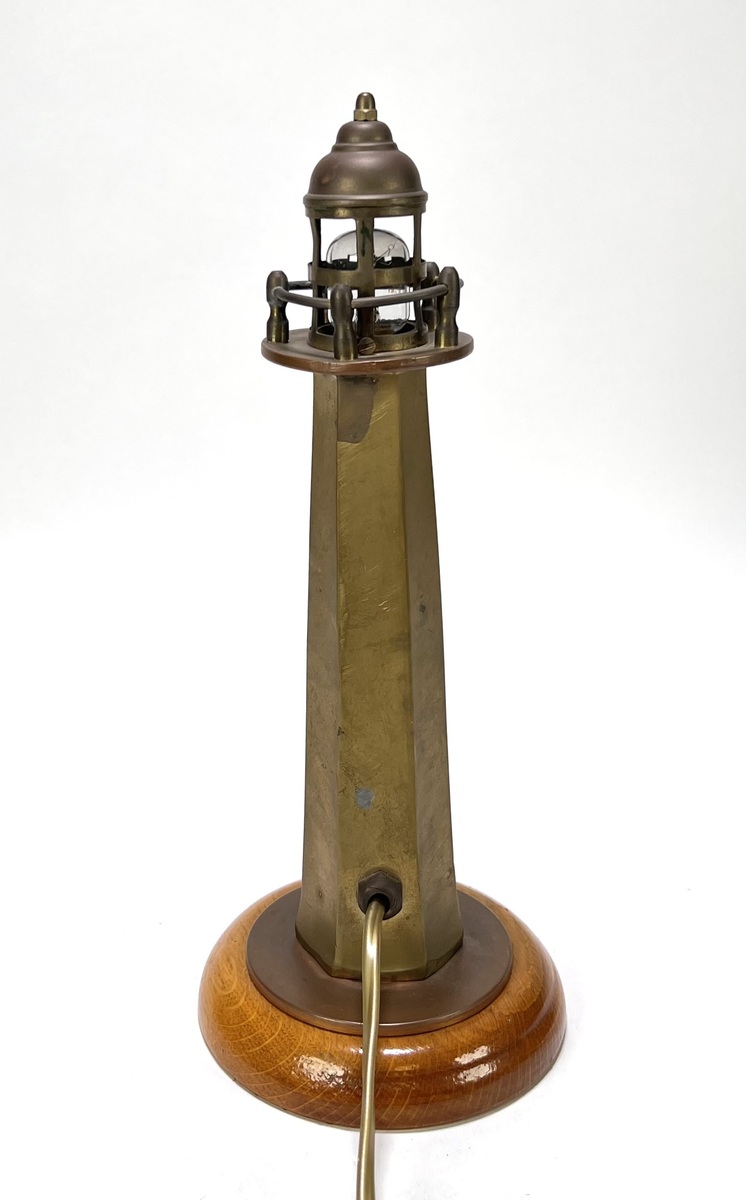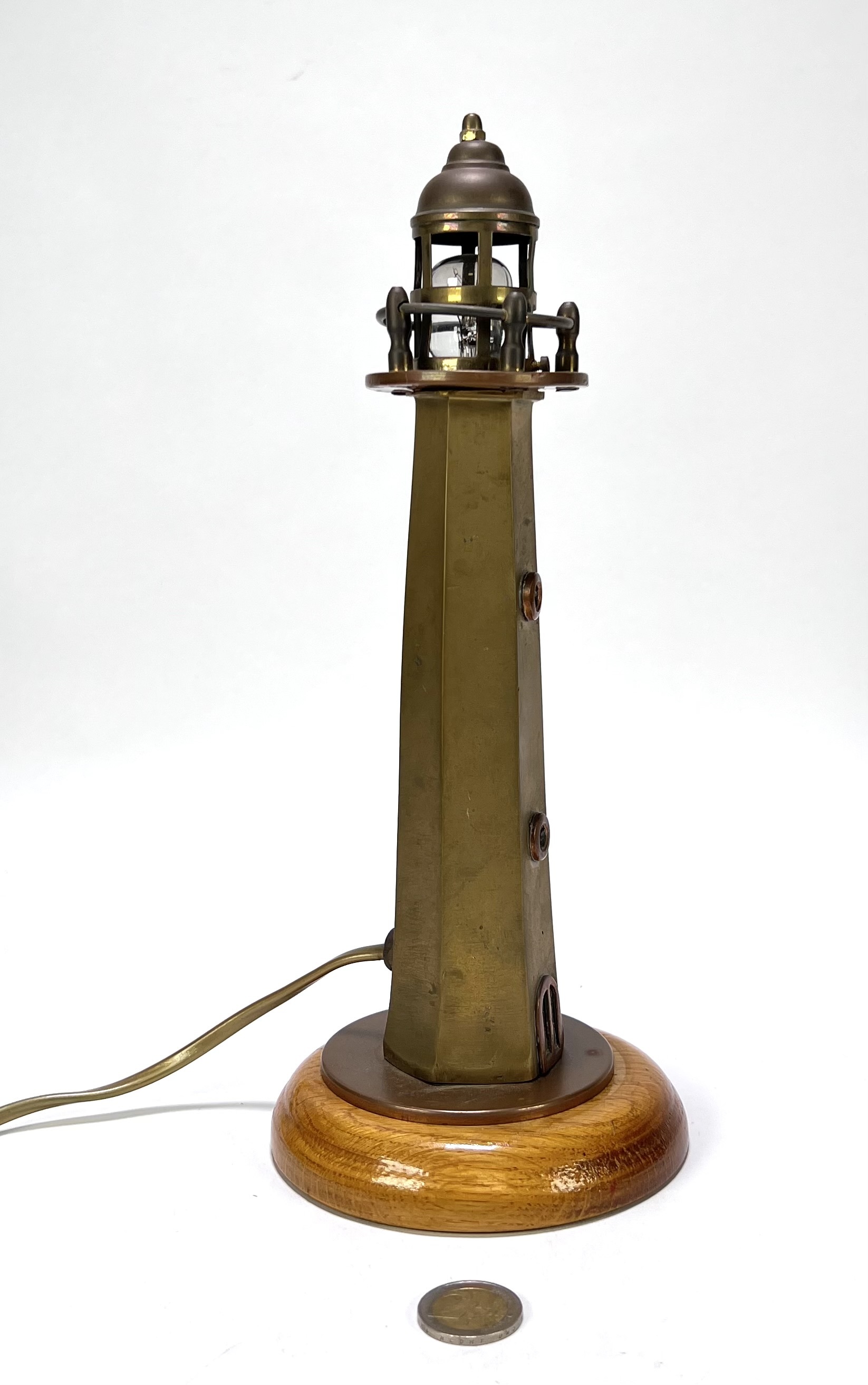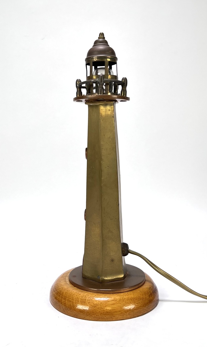Maritiem vormgegeven messing tafellamp in de gedaante van een vuurtoren. Onduidelijk gesigneerd onderzijde en gedateerd 2011. Lamp staand op gelakte houten voet met elektrische fitting. Handmatig plaatwerk, geklonken en gesoldeerde onderdelen met patina. Met balustrade rond de lantaarn en octogonale schacht met kijkgaten; snoeruitgang achterzijde. Geïnteresseerd? Bezoek onze kijkdagen op 29, 30 of 31 augustus van 11:00 tot 17:00 uur! |