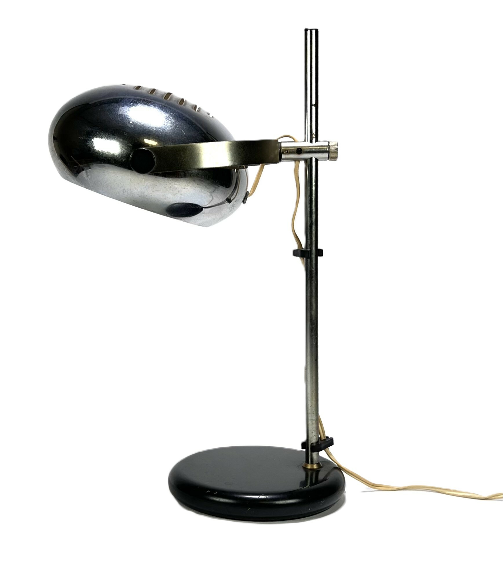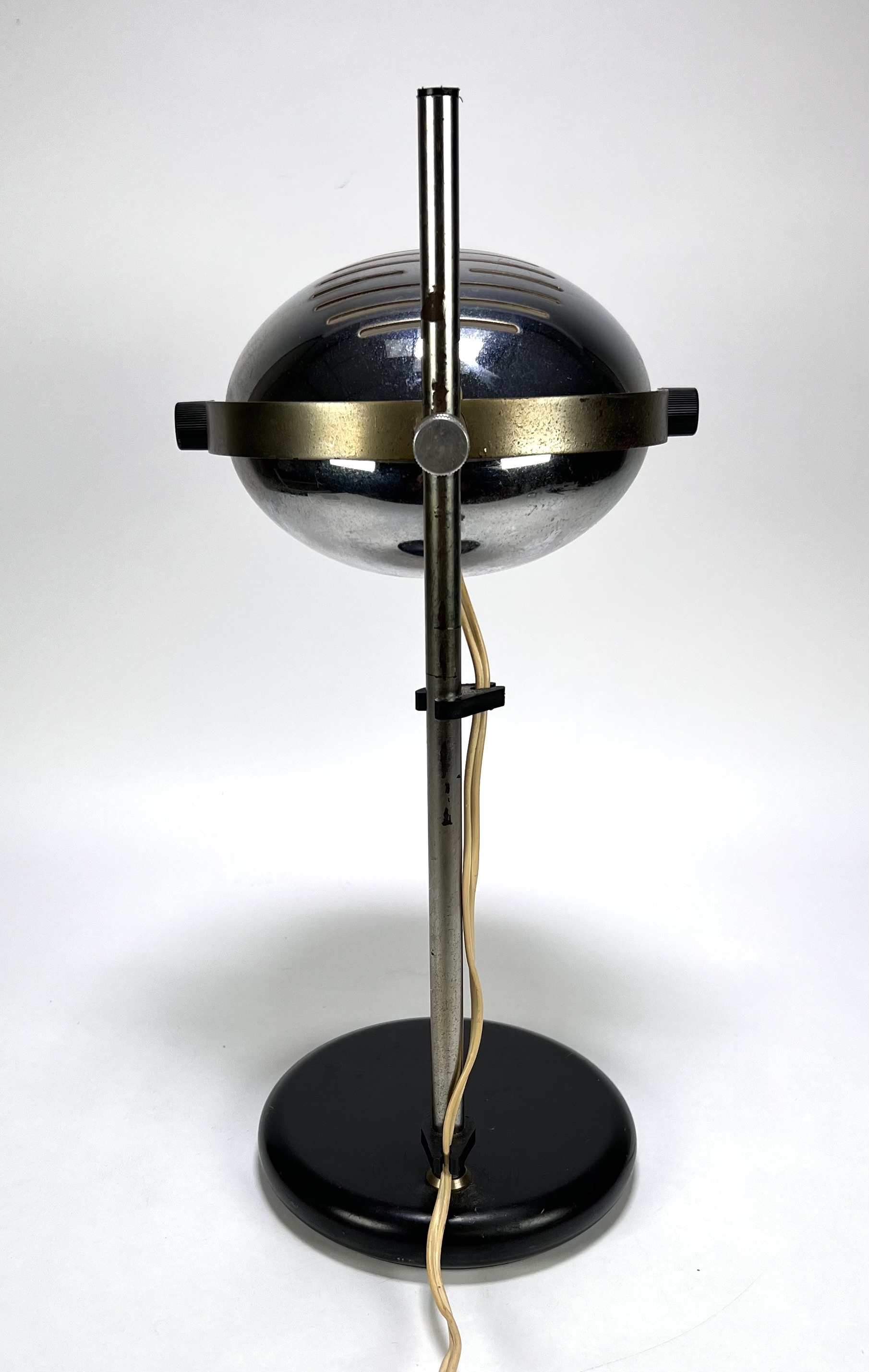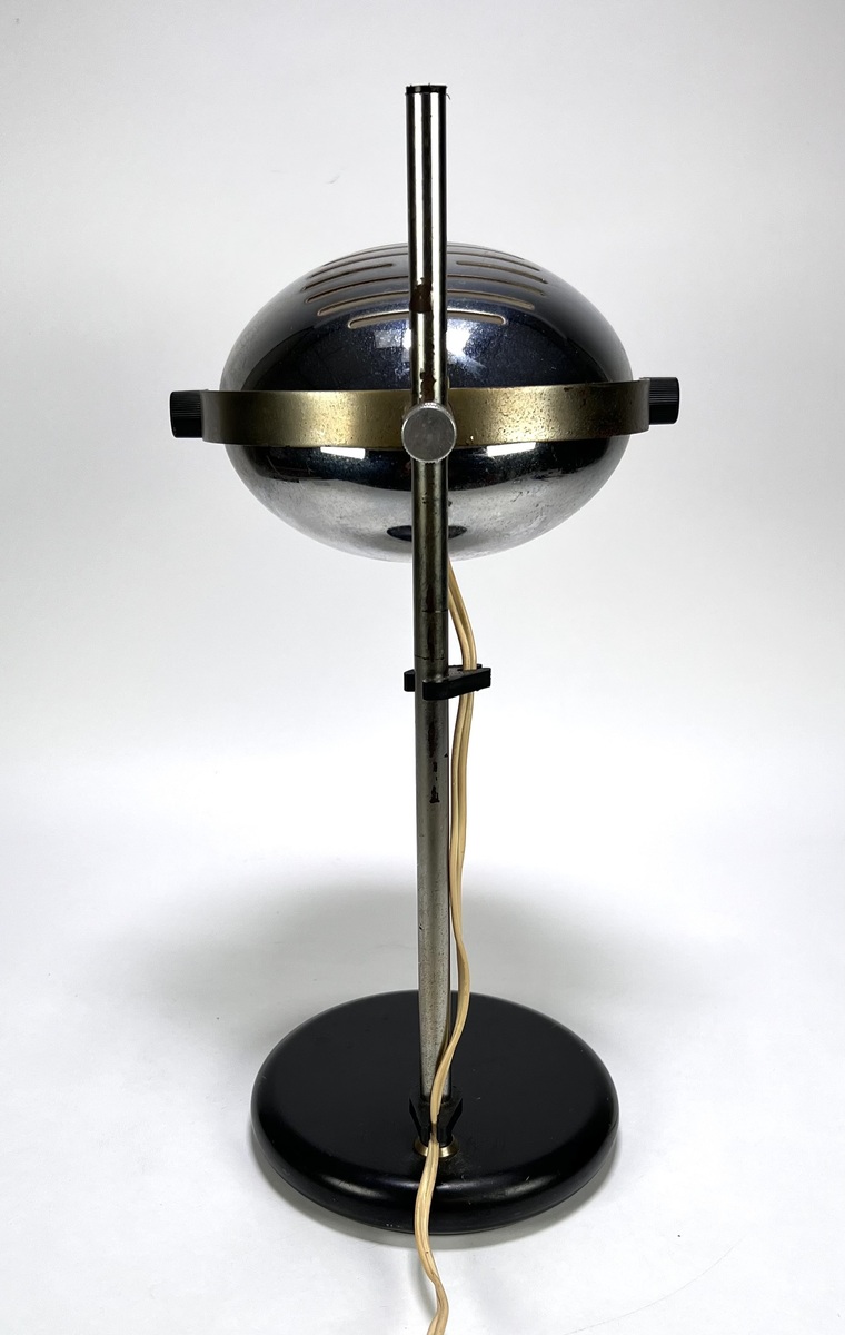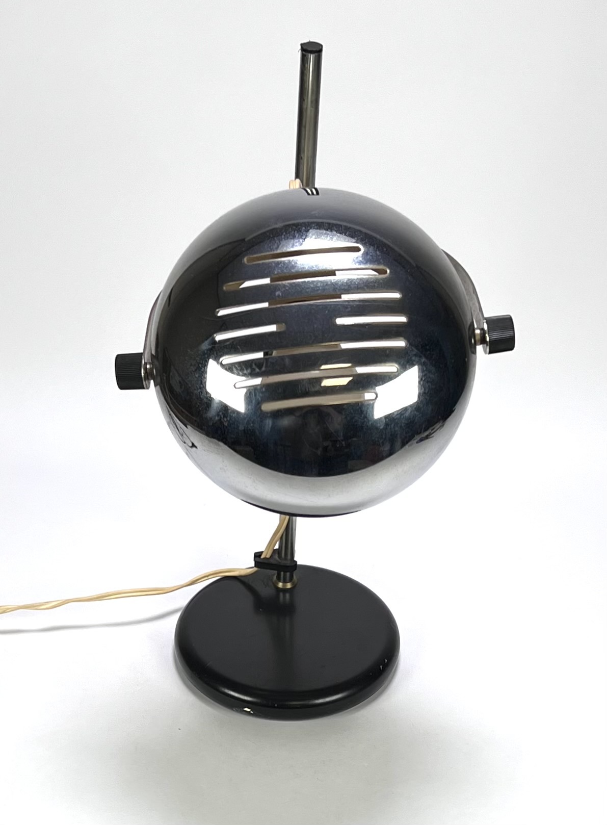Vintage Space Age bureaulamp uit circa jaren '80, uitgevoerd in metaal met verchroomde kap en zwarte voet. Industrieel vervaardigd met stans- en montagewerk. Kenmerkend zijn de bolvormige kap met horizontale ventilatiesleuven, verstelbare hoogte en kantelbare constructie. De lamp combineert functionele techniek met futuristische esthetiek, typerend voor de Space Age stijl. Klaar om te bieden? Registreer je nu en doe mee aan de veiling! |