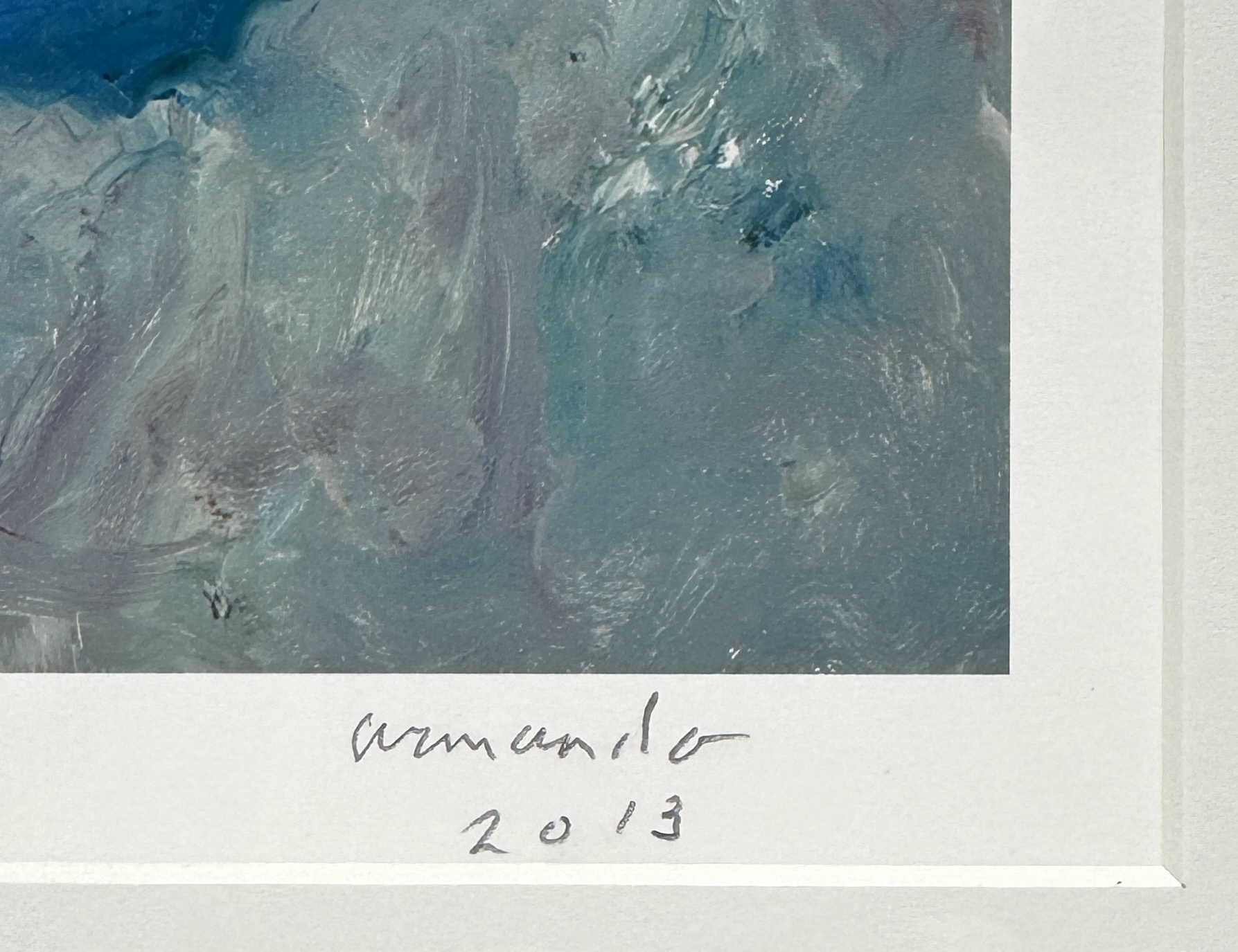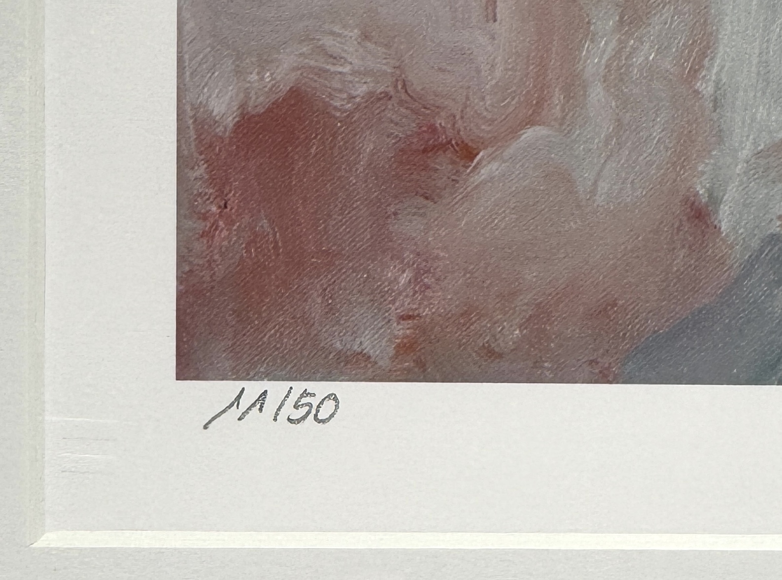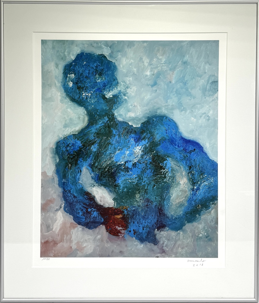 Giclée Armando (1929–2018), getiteld "Gestalt", giclée op handgeschept katoenpapier, 2013. Uitgevoerd in expressieve abstract-figuratieve stijl, voorstellend een geabstraheerde menselijke figuur in overwegend blauw en groen tegen een diffuse achtergrond. Linksonder genummerd 14/150, rechtsonder met potlood gesigneerd en gedateerd 2013. Gevat in zilverkleurige lijst met passe-partout. De giclée zelf beoordelen? Je bent welkom op onze kijkdagen op 29, 30 en 31 augustus! |