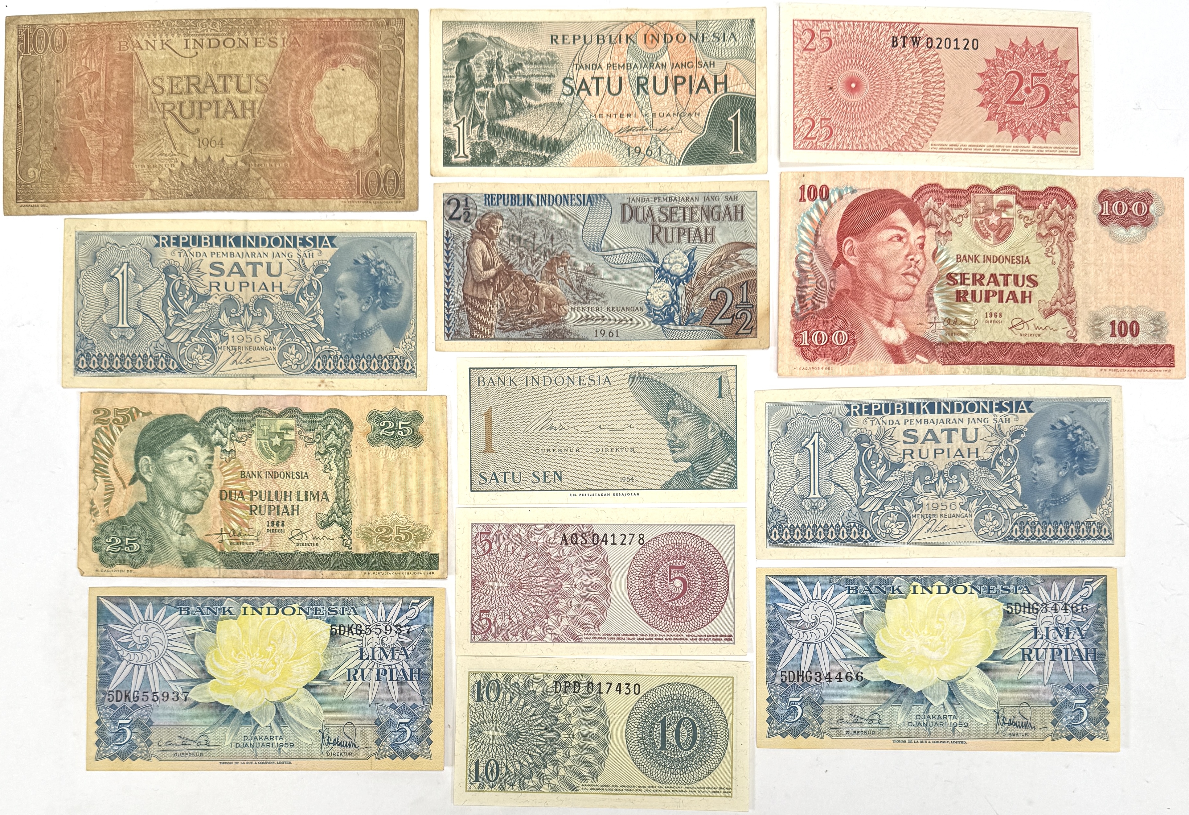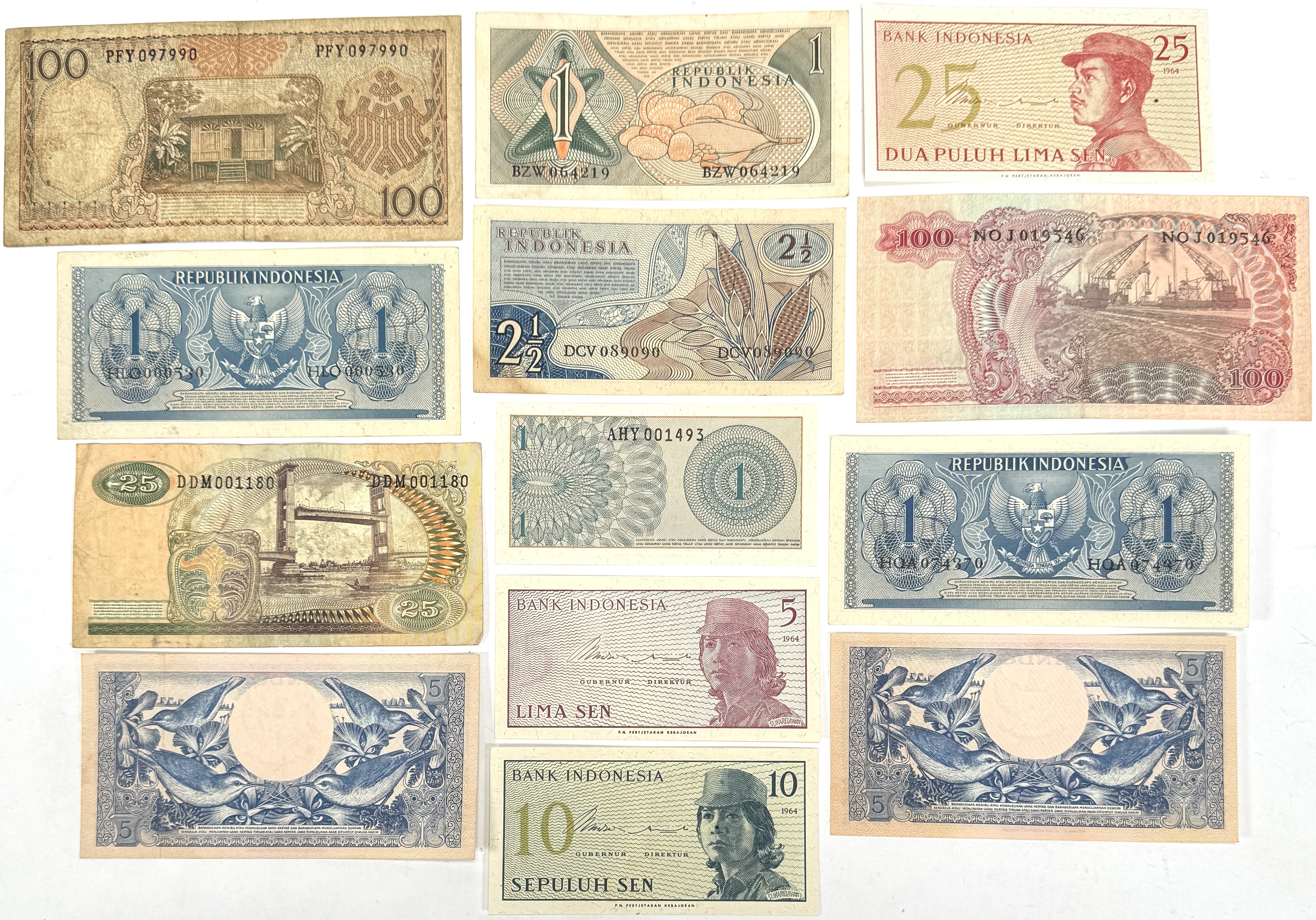 Dertien Indonesische bankbiljetten uitgegeven door Bank Indonesia, daterend uit 1956, 1961 en 1964. Gedrukt op bankpapier in diepdruk- en hoogdruktechniek met guillochemotieven. Afbeeldingen tonen portretten van nationale figuren, industriële taferelen, landschappen en florale ornamentiek. Met waarden van 1 sen tot 100 roepia en duidelijke jaartallen en serienummers. Dit bankbiljetten zelf beoordelen? Je bent welkom op onze kijkdagen op 29, 30 en 31 augustus! |