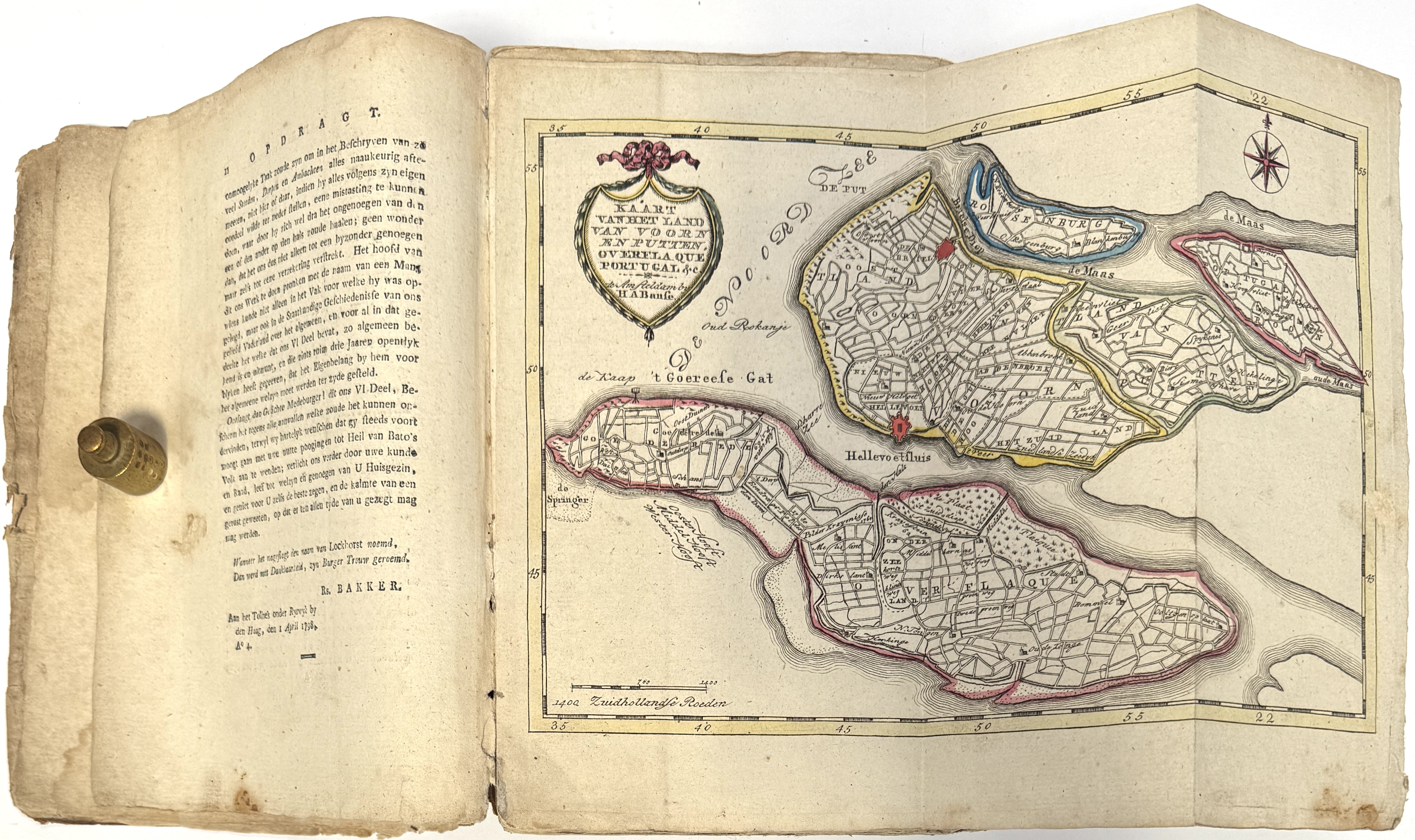 Kavel met twee Nederlandse boeken: Besluiten van het Staats-Bewind der Bataafsche Republiek, 1804, en De Nederlandsche Stad- en Dorp-beschrijver, door Rs. Bakker, 1798. Papier, boekdruk met uitvouwbare kopergravure-kaart met handkleuring. Laat-18e-/vroeg-19e-eeuwse bestuurlijke en topografische stijl. Titelpagina’s binnenin; kaart met cartouche en kompasroos. Met schaalstreep, plaatsnamen en polderindeling; uitgavecontext bestuurlijke verslaglegging en topografische beschrijving. Papieren banden aanwezig. Klaar om te bieden? Registreer je nu en doe mee aan de veiling! |